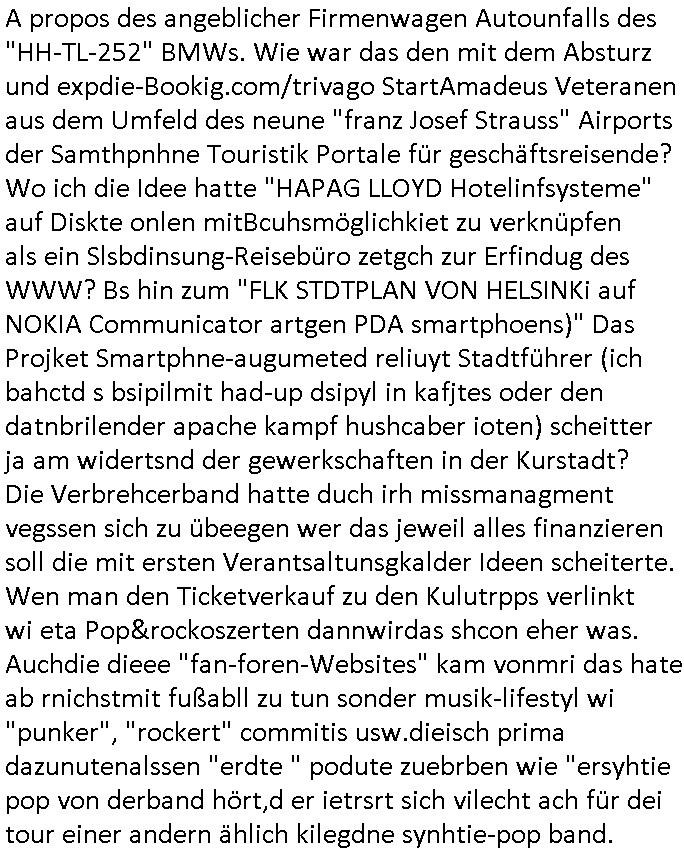 A propos des angeblicher Firmenwagen Autounfalls des "HH-TL-252" BMWs. Wie war das den mit dem Absturz und expdie-Bookig.com/trivago StartAmadeus Veteranen aus dem Umfeld des neune "franz Josef Strauss" Airports der Samthpnhne Touristik Portale für geschäftsreisende? Wo ich die Idee hatte "HAPAG LLOYD Hotelinfsysteme" auf Diskte onlen mitBcuhsmöglichkiet zu verknüpfen als ein Slsbdinsung-Reisebüro zetgch zur Erfindug des WWW? Bs hin zum "FLK STDTPLAN VON HELSINKi auf NOKIA Communicator artgen PDA smartphoens)" Das Projket Smartphne-augumeted reliuyt Stadtführer (ich bahctd s bsipilmit had-up dsipyl in kafjtes oder den datnbrilender apache kampf hushcaber ioten) scheitter ja am widertsnd der gewerkschaften in der Kurstadt? Die Verbrehcerband hatte duch irh missmanagment vegssen sich zu übeegen wer das jeweil alles finanzieren soll die mit ersten Verantsaltunsgkalder Ideen scheiterte. Wen man den Ticketverkauf zu den Kulutrpps verlinkt wi eta Pop&rockoszerten dannwirdas shcon eher was. Auchdie dieee "fan-foren-Websites" kam vonmri das hate ab rnichstmit fußabll zu tun sonder musik-lifestyl wi "punker", "rockert" commitis usw.dieisch prima dazunutenalssen "erdte " podute zuebrben wie "ersyhtie pop von derband hört,d er ietrsrt sich vilecht ach für dei tour einer andern ählich kilegdne synhtie-pop band.
