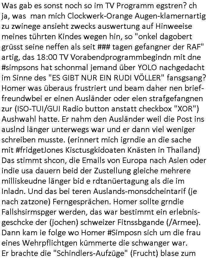 Was gab es sonst noch so im TV Programm egstren? ch ja, was man mich Clockwerk-Orange Augen-klamernartig zu zwinege ansieht zwecks auswertung auf Hinweeise meines tührten Kindes wegen hin, so "onkel dagobert grüsst seine neffen als seit ### tagen gefangner der RAF" artig, das 18:00 TV Vorabendprogrammbegindn mit dne #simpsons hat schonmal jemand über YOLO nachgedacht im Sinne des "ES GIBT NUR EIN RUDI VÖLLER" fansgsang? Homer was überaus frustriert und beam daher nen brief-freundwbei er einen Ausländer oder eien strafgefangnen zur (ISO-TUI/GUI Radio button anstatt checkbox "XOR") Aushwahl hatte. Er nahm den Ausländer weil die Post ins auslnd länger unterwegs war und er dann viel weniger schreiben musste. (erinnert mich igrndie an die sache mit #fridgetJones Kisctusgkidoaten Knästen in Thailand) Das stimmt shcon, die Emails von Europa nach Asien oder indie usa dauern beid der Zustellung gleiche mehrere milliskeudne länger bid e rdtanüertagung als die im Inladn. Und das bei teren Auslands-monsdcheintarif (je nach zatzone) Ferngesprächen. Homer sollte grndie Fallshsirmspger werden, das war bestimmt ein erlebnis-geschcke der (jochen) schweizer Fitnssbgande (/Armee). Dann kam ie folge wo Homer #Simposn sich um die frau eines Wehrpflichtgen kümmerte die schwanger war. Er brachte die "Schindlers-Aufzüge" (Frucht) blase zum platzen (wo ncht gnügene drähte für den aufzugsnotruf sind nutzt man GSM/UMTS/LTE/5G-VoIP ausfalsciehr