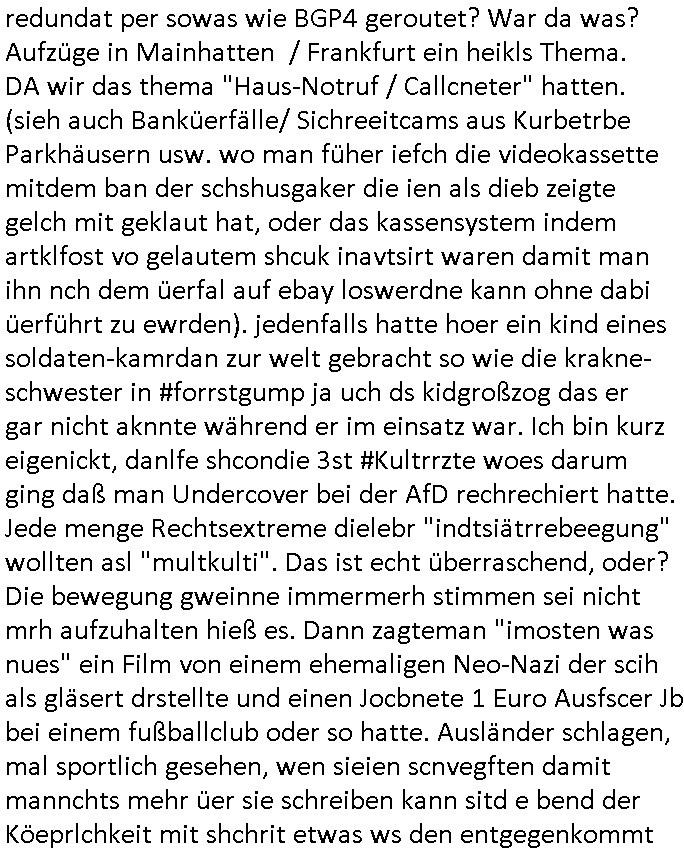 redundat per sowas wie BGP4 geroutet? War da was? Aufzüge in Mainhatten / Frankfurt ein heikls Thema. DA wir das thema "Haus-Notruf / Callcneter" hatten. (sieh auch Banküerfälle/ Sichreeitcams aus Kurbetrbe Parkhäusern usw. wo man füher iefch die videokassette mitdem ban der schshusgaker die ien als dieb zeigte gelch mit geklaut hat, oder das kassensystem indem artklfost vo gelautem shcuk inavtsirt waren damit man ihn nch dem üerfal auf ebay loswerdne kann ohne dabi üerführt zu ewrden). jedenfalls hatte hoer ein kind eines soldaten-kamrdan zur welt gebracht so wie die krakne-schwester in #forrstgump ja uch ds kidgroßzog das er gar nicht aknnte während er im einsatz war. Ich bin kurz eigenickt, danlfe shcondie 3st #Kultrrzte woes darum ging daß man Undercover bei der AfD rechrechiert hatte. Jede menge Rechtsextreme dielebr "indtsiätrrebeegung" wollten asl "multkulti". Das ist echt überraschend, oder? Die bewegung gweinne immermerh stimmen sei nicht mrh aufzuhalten hieß es. Dann zagteman "imosten was nues" ein Film von einem ehemaligen Neo-Nazi der scih als gläsert drstellte und einen Jocbnete 1 Euro Ausfscer Jb bei einem fußballclub oder so hatte. Ausländer schlagen, mal sportlich gesehen, wen sieien scnvegften damit mannchts mehr üer sie schreiben kann sitd e bend der Köeprlchkeit mit shchrit etwas ws den entgegenkommt bei der "wahl der waffen" (Phsyische gewalt anstatt von Argumenten). Ich frag mich ja imr wie die AfD Imermher