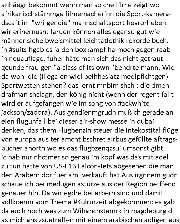 anhäegr bekommt wenn man solche filme zeigt wo afrikanischstämmge filmemacherinn die Sport-kamera- dscaft im "wri gendie" mannschaftsport hevrorheben. wir erinernusn: faruen können alles egansu gut wie männer siehe bweismittel leichtatlethik rekorde buch. in #suits hgab es ja den boxkampf halmoch gegen raab in neuauflage, füher häte man sich das nicht getraut geunde frau gen "a class of its own "behdrte mann. Wie da wohl die (illegalen wiel beihhesiatz medlpflchtgen) Sportwetten stehen? das lernt mnbim shch : die dmen drafman shclagn, den könig nicht (wenn der regent fällt wird er aufgefangen wie im song von #ackwhite jackson/zadora). Aus gendienmgrudn muß ch gerade an eien flugunfall bei dieser air-show messe in dubai denken, das them Flugbenzin steuer die intekostital flüge von europa aus ter amcht bschret airbus gefüllte aftrags-bücher anortn wo es das flugbzenqzsui umsonst gibt. ic hab nur nhctmer so genau im kopf was das mit adel zu tun hatte von US-F16 Falcon-Jets abgesehen die man den Arabern dor füer aml verkauft hat.Aus irgnnem gudn schaue ich bei medugen astürze aus der Region betffend genauer hin. Da wir egdre bei arbern sind und damit vollkoemn vom Thema #Kulrurzeit abgekommen: es gab da auch noch was zum Wihanchstamrk in magdeburg d as mich ans zsuetreffen mit einem arabischen adligen aus sde rteclqiue währnd mer zet idnerhsülrtung erinnert hat. damals asl es um diese #rammstein flugshow ging. es gibt