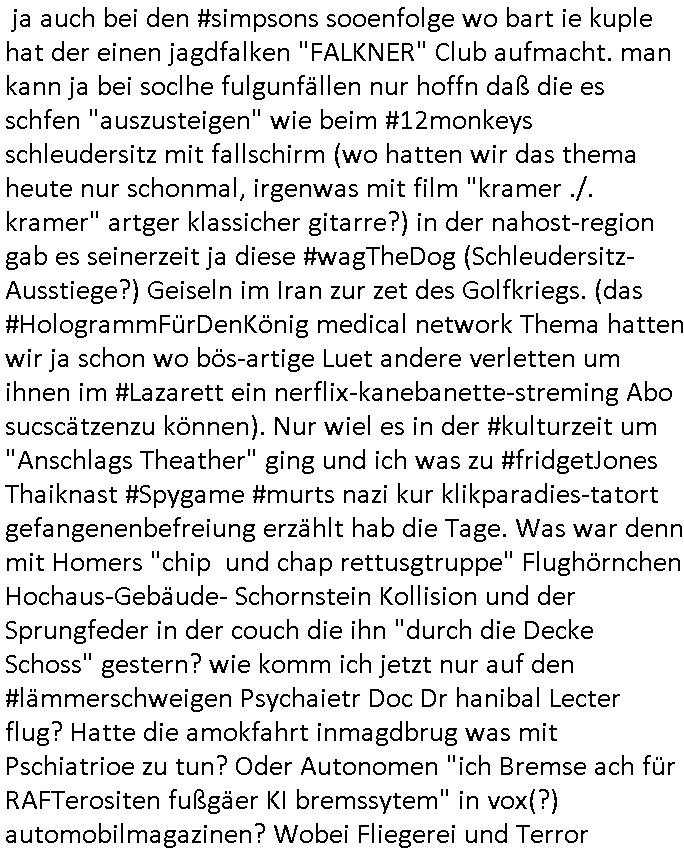 ja auch bei den #simpsons sooenfolge wo bart ie kuple hat der einen jagdfalken "FALKNER" Club aufmacht. man kann ja bei soclhe fulgunfällen nur hoffn daß die es schfen "auszusteigen" wie beim #12monkeys schleudersitz mit fallschirm (wo hatten wir das thema heute nur schonmal, irgenwas mit film "kramer ./. kramer" artger klassicher gitarre?) in der nahost-region gab es seinerzeit ja diese #wagTheDog (Schleudersitz-Ausstiege?) Geiseln im Iran zur zet des Golfkriegs. (das #HologrammFürDenKönig medical network Thema hatten wir ja schon wo bös-artige Luet andere verletten um ihnen im #Lazarett ein nerflix-kanebanette-streming Abo sucscätzenzu können). Nur wiel es in der #kulturzeit um "Anschlags Theather" ging und ich was zu #fridgetJones Thaiknast #Spygame #murts nazi kur klikparadies-tatort gefangenenbefreiung erzählt hab die Tage. Was war denn mit Homers "chip und chap rettusgtruppe" Flughörnchen Hochaus-Gebäude- Schornstein Kollision und der Sprungfeder in der couch die ihn "durch die Decke Schoss" gestern? wie komm ich jetzt nur auf den #lämmerschweigen Psychaietr Doc Dr hanibal Lecter flug? Hatte die amokfahrt inmagdbrug was mit Pschiatrioe zu tun? Oder Autonomen "ich Bremse ach für RAFTerositen fußgäer KI bremssytem" in vox(?) automobilmagazinen? Wobei Fliegerei und Terror nchtsmitender zu tun haben. Dan gb es irgenedeien austellung die "für dei füße" hieß und Porzellan zeigte