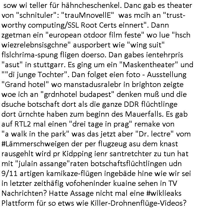 sow wi teller für hähncheschenkel. Danc gab es theater von "schnituler": "trauMnovellE" was mcih an "trust-worthy computing/SSL Root Certs einnert". Dann zgetman ein "european otdoor film feste" wo lue "hsch wiezrelebnsisgchne" ausporbert wie "wing suit" flslchrima-spung fligen doerso. Dan gabes ientehrpris "asut" in stuttgarr. Es ging um ein "Maskentheater" und ""di junge Tochter". Dan folget eien foto - Ausstellung "Grand hotel" wo manstadusralebr in brighton zeigte woe ich an "grdnhotel budapest" denken muß und die dsuche botschaft dort als die ganze DDR flüchtlinge dort ürnchte haben zum beginn des Mauerfalls. Es gab auf RTL2 mal einen "drei tage in prag" remake von "a walk in the park" was das jetzt aber "Dr. lectre" vom #Lämmerschweigen der per flugzeug asu dem knast rausgehlt wird pr Kidpping ienr santretchter zu tun hat mit "julain assange"raten botschaftsflüchtlingen udn 9/11 artigen kamikaze-flügen ingebäde hine wie wir sei in letzter zeithäfig vofoheninder kuaine sehen in TV Nachrichten? Hatte Assage nicht mal eine #wiklieaks Plattform für so etws wie Killer-Drohnenflüge-Videos?