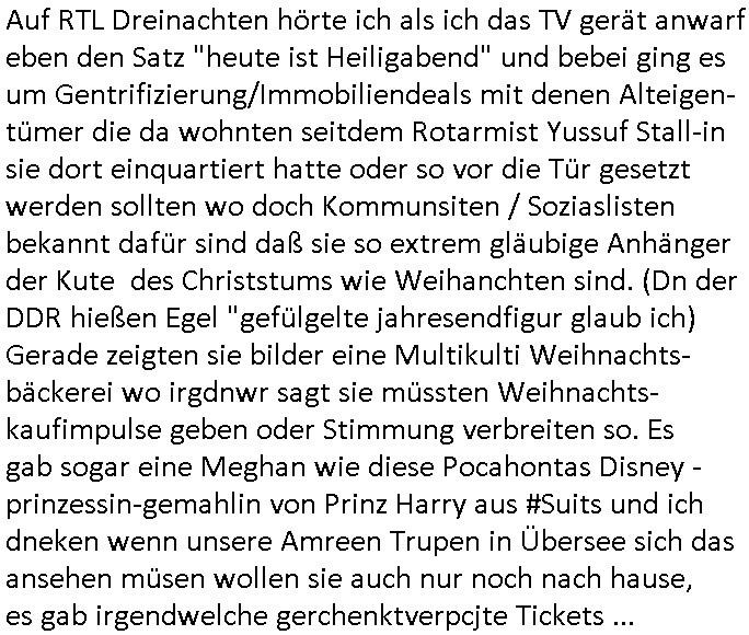 Auf RTL Dreinachten hörte ich als ich das TV gerät anwarf eben den Satz "heute ist Heiligabend" und bebei ging es um Gentrifizierung/Immobiliendeals mit denen Alteigen-tümer die da wohnten seitdem Rotarmist Yussuf Stall-in sie dort einquartiert hatte oder so vor die Tür gesetzt werden sollten wo doch Kommunsiten / Soziaslisten bekannt dafür sind daß sie so extrem gläubige Anhänger der Kute des Christstums wie Weihanchten sind. (Dn der DDR hießen Egel "gefülgelte jahresendfigur glaub ich) Gerade zeigten sie bilder eine Multikulti Weihnachts-bäckerei wo irgdnwr sagt sie müssten Weihnachts-kaufimpulse geben oder Stimmung verbreiten so. Es gab sogar eine Meghan wie diese Pocahontas Disney -prinzessin-gemahlin von Prinz Harry aus #Suits und ich dneken wenn unsere Amreen Trupen in Übersee sich das ansehen müsen wollen sie auch nur noch nach hause, es gab irgendwelche gerchenktverpcjte Tickets ...