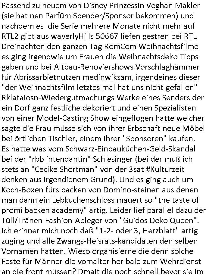 Passend zu neuem von Disney Prinzessin Veghan Makler (sie hat nen Parfüm Spender/Sponsor bekommen) und nachdem es die Serie mehrere Monate nicht mehr auf RTL2 gibt aus waverlyHills 50667 liefen gestren bei RTL Dreinachten den ganzen Tag RomCom Weihnachtsfilme es ging irgendwie um Frauen die Weihnachtsdeko Tipps gaben und bei Altbau-Renoviershows Vorschlaghämmer für Abrissarbietnutzen medinwiksam, irgendeines dieser "der Weihnachtsfilm letztes mal hat uns nicht gefallen" Rklataiosn-Wiedergutmachungs Werke eines Senders der ein Dorf ganz festliche dekoriert und einen Spezialisten von einer Model-Casting Show eingeflogen hatte welcher sagte die Frau müsse sich von ihrer Erbschaft neue Möbel bei örtlichen Tischler, einem ihrer "Sponsoren" kaufen. Es hatte was vom Schwarz-Einbauküchen-Geld-Skandal bei der "rbb intendantin" Schlesinger (bei der muß ich stets an "Cecike Shortman" von der 3sat #Kulturzeit denken aus irgendienem Grund). Und es ging auch um Koch-Boxen fürs backen von Domino-steinen aus denen man dann ein Lebkuchenschloss mauert so "the taste of promi backen academy" artig. Leider lief parallel dazu der Tüll/Tränen-Fashion-Ableger von "Guidos Deko Queen". Ich erinner mich noch daß "1-2- oder 3, Herzblatt" artig zuging und alle Zwangs-Heisrats-kandidaten den selben Vornamen hatten. Wieso organisierne die denn solche Feste für Männer die vomalter her bald zum Wehrdienst an die front müssen? Dmait die noch schnell bevor sie im