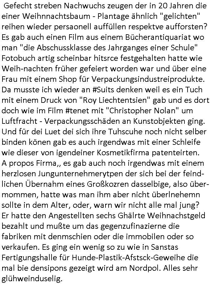 Gefecht streben Nachwuchs zeugen der in 20 Jahren die einer Weihnnachtsbaum - Plantage ähnlich "gelichten" reihen wieder persaonell auffüllen respektve aufforsten? Es gab auch einen Film aus einem Bücherantiquariat wo man "die Abschussklasse des Jahrganges einer Schule" Fotobuch artig scheinbar hitsrce festgehalten hatte wie Weih-nachten früher gefeiert worden war und über eine Frau mit einem Shop für Verpackungsindustreiprodukte. Da musste ich wieder an #Suits denken weil es ein Tuch mit einem Druck von "Roy Liechtentsien" gab und es dort doch wie im Film #tenet mit "Christopher Nolan" um Luftfracht - Verpackungsschäden an Kunstobjekten ging. Und für dei Luet dei sich ihre Tuhscuhe noch nicht selber binden könen gab es auch irgendwas mit einer Schleife wie dieser von igendeiner Kosmetikfirma patenteirten. A propos Firma,, es gab auch noch irgendwas mit einem herzlosen Jungunternehmerytpen der sich bei der feind-lichen Übernahm eines Großkozren dasselbige, also über-mommen, hatte was man ihm aber nicht überlnehemn sollte in dem Alter, oder, warn wir nicht alle mal jung? Er hatte den Angestellten sechs Ghälrte Weihnachstgeld bezahlt und mußte um das gegenzufinazierne die fabriken mit denmschien oder die immobilen oder so verkaufen. Es ging ein wenig so zu wie in Sanstas Fertigungshalle für Hunde-Plastik-Afstsck-Geweihe die mal bie densipons gezeigt wird am Nordpol. Alles sehr glühweinduselig.