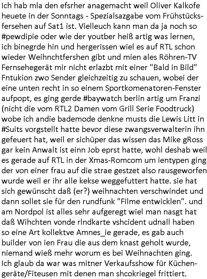 Ich hab mla den efsrher anagemacht weil Oliver Kalkofe heuete in der Sonntags - Spezialsazgabe vom Frühstücks- fersehen auf Sat1 ist. Vielleuch kann man da ja noch so #pewdipie oder wie der youtber heiß artig was lernen, ich binegrde hin und hergerissen wiel es auf RTL schon wieder Weihnchtfershen gibt und mien ales Röhren-TV Fernsehegerät mir nicht erlazbt mit einer "Bald in Bild" Fntukion zwo Sender gleichzeitig zu schauen, wobei der eine unten recht in so einem Sportkomenatoren-Fenster aufpopt, es ging gerde #baywatch berlin artig um Franzi (nicht die vom RTL2 Damen vom Grill Serie Foodtruck) wobe ich andie bademode denkne musts die Lewis Litt in #Suits vorgstellt hatte bevor diese zwangsverwalterin ihn gefeuert hat, weil er sichüper das wissen das Mike gRoss gar kein Anwalt ist einn Job eprst hatte, wohl deshab weil es gerade auf RTL in der Xmas-Romcom um ientypen ging der von einer frau auf die strae gestzet also rausgeworfen wurde weil er ihr alle kekse weggefuttert hatte. sie hat sich gewünscht daß (er?) weihnachten verschwindet und dann sollet sie für den rundfunk "Filme entwicklen". und am Nordpol ist alles sehr aufgeregt wiel man nasgt hat daß Wihchten vonde rlndkarte vshcident udnall haben so eine Art kollektve Amnes_ie gerade, es gab auch builder von ien Frau die aus dem knast geholt wurde, niemand wieß mehr worum es bei Weihnachten ging. Ich glaub da war was mitner Verkaufsshow für Küchen- geräte/Fiteusen mit denen man shcokriegel frittiert.