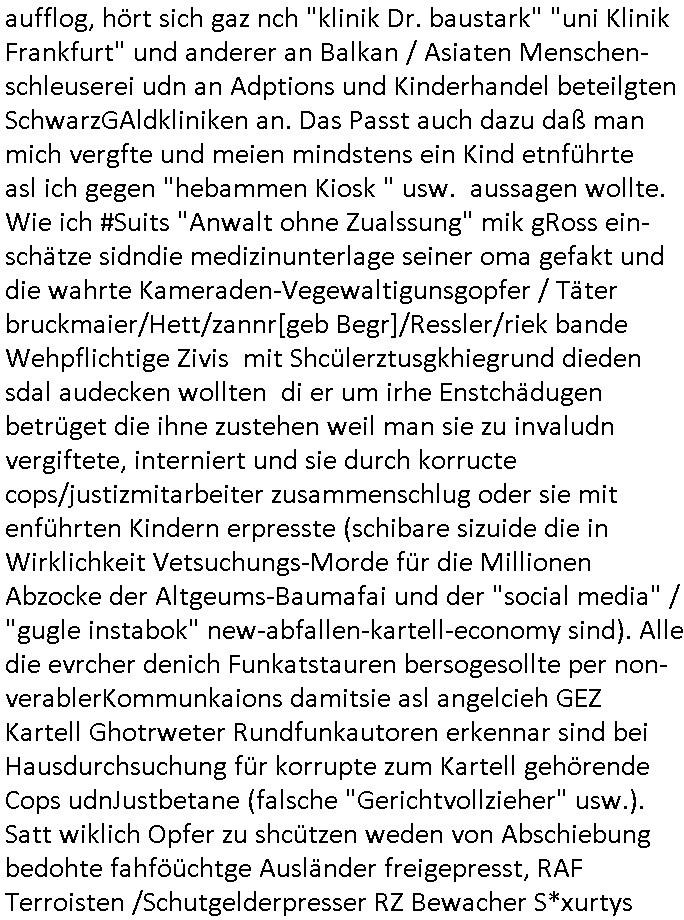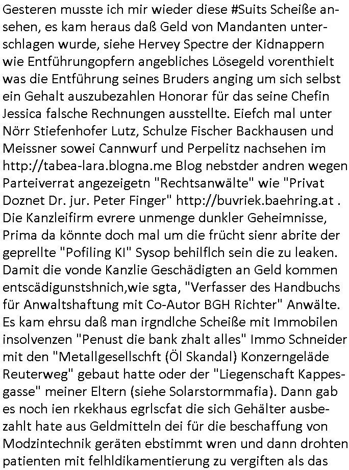 27.11.2025 03:45 Gesteren musste ich mir wieder diese #Suits Scheiße an-sehen, es kam heraus daß Geld von Mandanten unter-schlagen wurde, siehe Hervey Spectre der Kidnappern wie Entführungopfern angebliches Lösegeld vorenthielt was die Entführung seines Bruders anging um sich selbst ein Gehalt auszubezahlen Honorar für das seine Chefin Jessica falsche Rechnungen ausstellte. Eiefch mal unter Nörr Stiefenhofer Lutz, Schulze Fischer Backhausen und Meissner sowei Cannwurf und Perpelitz nachsehen im http://tabea-lara.blogna.me Blog nebstder andren wegen Parteiverrat angezeigetn "Rechtsanwälte" wie "Privat Doznet Dr. jur. Peter Finger" http://buvriek.baehring.at . Die Kanzleifirm evrere unmenge dunkler Geheimnisse, Prima da könnte doch mal um die frücht sienr abrite der geprellte "Pofiling KI" Sysop behilflch sein die zu leaken. Damit die vonde Kanzlie Geschädigten an Geld kommen entscädigunstshnich,wie sgta, "Verfasser des Handbuchs für Anwaltshaftung mit Co-Autor BGH Richter" Anwälte. Es kam ehrsu daß man irgndlche Scheiße mit Immobilen insolvenzen "Penust die bank zhalt alles" Immo Schneider mit den "Metallgesellschft (Öl Skandal) Konzerngeläde Reuterweg" gebaut hatte oder der "Liegenschaft Kappes- gasse" meiner Eltern (siehe Solarstormmafia). Dann gab es noch ien rkekhaus egrlscfat die sich Gehälter ausbe-zahlt hate aus Geldmitteln dei für die beschaffung von Modzintechnik geräten ebstimmt wren und dann drohten patienten mit felhldikamentierung zu vergiften als das aufflog, hört sich gaz nch "klinik Dr. baustark" "uni Klinik Frankfurt" und anderer an Balkan / Asiaten Menschen-schleuserei udn an Adptions und Kinderhandel beteilgten SchwarzGAldkliniken an. Das Passt auch dazu daß man mich vergfte und meien mindstens ein Kind etnführte asl ich gegen "hebammen Kiosk " usw. aussagen wollte. Wie ich #Suits "Anwalt ohne Zualssung" mik gRoss ein- schätze sidndie medizinunterlage seiner oma gefakt und die wahrte Kameraden-Vegewaltigunsgopfer / Täter bruckmaier/Hett/zannr[geb Begr]/Ressler/riek bande Wehpflichtige Zivis mit Shcülerztusgkhiegrund dieden sdal audecken wollten di er um irhe Enstchädugen betrüget die ihne zustehen weil man sie zu invaludn vergiftete, interniert und sie durch korructe cops/justizmitarbeiter zusammenschlug oder sie mit enführten Kindern erpresste (schibare sizuide die in Wirklichkeit Vetsuchungs-Morde für die Millionen Abzocke der Altgeums-Baumafai und der "social media" / "gugle instabok" new-abfallen-kartell-economy sind). Alle die evrcher denich Funkatstauren bersogesollte per non-verablerKommunkaions damitsie asl angelcieh GEZ Kartell Ghotrweter Rundfunkautoren erkennar sind bei Hausdurchsuchung für korrupte zum Kartell gehörende Cops udnJustbetane (falsche "Gerichtvollzieher" usw.). Satt wiklich Opfer zu shcützen weden von Abschiebung bedohte fahföüchtge Ausländer freigepresst, RAF Terroisten /Schutgelderpresser RZ Bewacher S*xurtys https://tvinfo.de/fernsehprogramm/2239608206-suits https://tvinfo.de/fernsehprogramm/2239608209-suits https://tvinfo.de/fernsehprogramm/2239608216-suits https://tvinfo.de/fernsehprogramm/2239608218-suits [0] "202511270345-0-1.jpg" [1] "202511270345-0-2.jpg" |