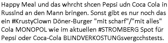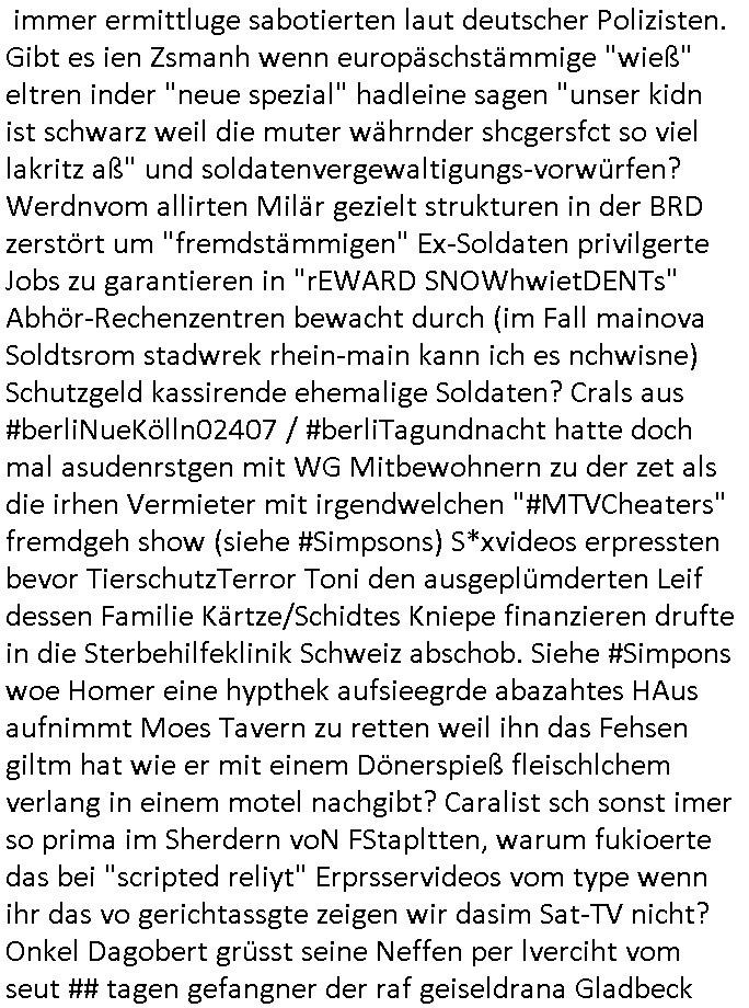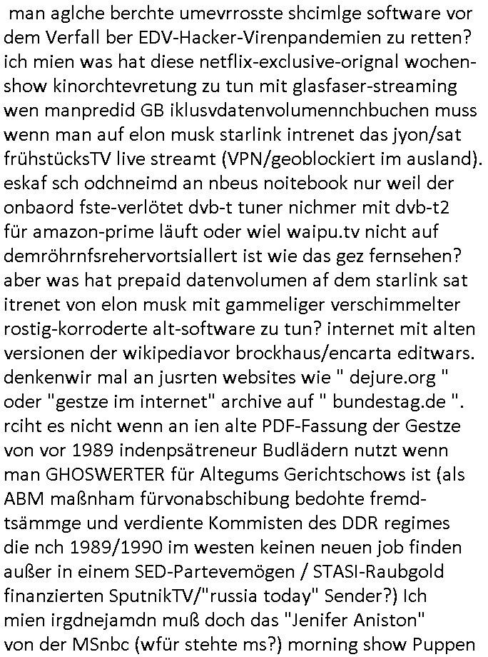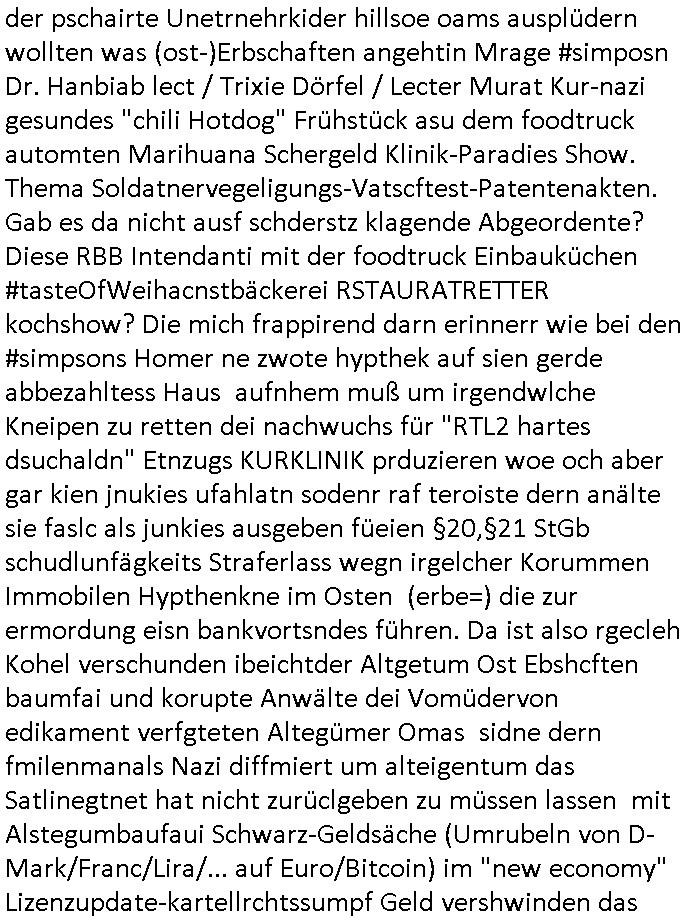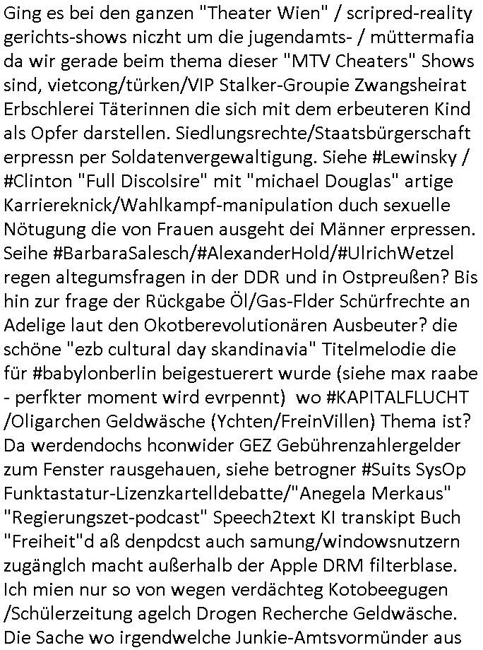 27.11.2025 06:15 Nun aber mal zu einem ganz anderen Thema. Premium-Marken-Fast-Fashion wir bruno-banani oder calvin klein unterhosen ähnlich ner moon-washed ostblock-jeans aus der zeit der wiedrvereinigung für leute die aus ostalgie grüden lieber trabant (mit e-moto rumrüstsatz?) fahren statt konsumterror erlgender weichei status-sysmbol westautos (protzkarren wie [opel] manta oder golf-gti). Wie komm ich da nur von fäulnis/korrosion bei Software Update-Zwangsabofalle-kartellen udnde Frage ob Pepsi oder Coca Cola bei Burger King in der blindvertkostung besser abschneiden als DDR Club-Cola vom VEB drauf? Ach ja: Nelson shcmte sich wil er alte klamotten seiner Familie auftragem musste und daher ausgelacht wurde in der Schule im 18:00 Uhr TV Vorbandporgramm bei den Simpsons. Ds ist wie wenn amn einen Dacia Duster fährt. Den hüstegn SUV für alle die kein Statussymbol brauchen. Es gab irgendien Rowdie Kongress udn das Altenheim war Pleite. Lisa bekam ien Merrscheinchenweclehs das Bild über der couch zerströrte, man kaufte daher auf dem flohmarkt ein neues. Dies stellte sich als wrtvol heraus, man betrieb PROVINIENZ forschung weil ei faru als es verkauft/versteigert werden sollte behautette es sei nur ein Remake von einem Kunstfälscher. Mit Kunst ging es dann auch wieter in Ver "villa 31" in (koosvo?)-Albanien mit dem die 3sat Kulturzeit begann. Man zeigte das alte Feriendomizil kommisstcher Diktatur Machthaber das man inzwiwischen an Kunststipendiaten(?) vermietete. Dann gabs nen Dokufilm über 4 jahre "Sarajevo Sniper" im bosnischen Bürgerkieg. GrahaargieEltern hielten Baby-Fotos von erschossenen Kinder/Anghörgen indie kamera. E shab ien rgerchten Torusu für schießwütige Ausläder gegeben, ähnlich einer Safari. Dann ging es u Porblme mitder finazerung von Renten. Es hieß man wolle die lebenserwartung ud abstszet in einklang bringen mit dem rentenniveau. Möglciheris indem man Leute die dem sozialsystem sonst zur last falen würdn "rin zufällog" in einem krieg tötet? Arbeitpflicht bei leze derFiman man mit gwerkschafts- dder karell-sbaote kaputgemcht hat bei uqis zasgabrite Jobagabot duch ie bundeswerh doer Pflegedinste? Hurra Milätrdiktature, was vsrtegd denn usner milär? uetenehrsiche ufrehiet udn presse zensur woesi sorhcte-kidpping-erpressugen? OHME MICH! Ich hab mien zivildienst fertig udn kann nur des-halb nicht erwabserbaiten wiel man mich zuminvalidn geprügelt udn evrgfte wiet evrfegeltget) hat udn mri dann evrhrte vor egricht gehen zu können siehe meine videos. das ist kein rechtstaat der da verteidgt wird sondern eine poltikdasretller-freak-show eines moskau marionetten-regimes. Aber zurück zur 3sat #Kultrzeit . Dann ging es um irgendwwas mit "Christoph Maler?" und dann um ein "Around the world " Filmfestival. Gefolgt vonienr "only gpod vbes" Ausstellung wo es um Drogen ging. (Gibt es das auch als ne Powerpoint artige Frotalurrichte Diashow für nicht irhem ADHS bewegunsgdarang nachgehe müssende / Online ? ) Dann gab es bullet "der blaue vogel" udn ch frag mchegrde obd as ien snspielung auf schluckspechte ver duterbsoffen "wbeleu" = nato armee dem wider-sacher des unsterblchen "_oten armee" corps ist. Dann gab es ähnlich wie bei den #simspons etwas zu Kunst-fälschung und provinienz hir aber mit gfakten Giacometti skulturen aus irgndiem asien fälschermarkt. (wär es ien ditagbildraubkopie im Netze gewsen das man abfotografert udnudgercukthaätte statt einer skulptur hätten es wohl kien Strafe fürs " #remake " sclher "Blei...gehen" Kunstwerke gegeben). Deshlab bin hc so ien fan von Populärkultur wie "campbells soup" werbung (gebruchkgfik ims Stil "Andy Warhol"s?) Da wir de firma Campbell als rctheinhaber icher nichts dgegen haben daß man sich da Werbplaktedruck ins wohn-zimer hängt udnch noch slbst dfür zhalt wie dfürie Kipoplakat. Ist aj kostnlse Weitervereitung der werbebotschaft und amit imSonen des rechtinhabers der "Auftragskunst". Dann ging es um einen stra_en ("mug_shot"?) Fotograf der ein "Activism Now" Cover agcht hate für dei Vogue. Am Ende Musik von "Milky Chance" "Camoufalge". Warum muß ich nur an die rothaairge aus dem "OMD" Video von wegen verlagsgruppe "Milchstraße" denken und diesen #Simpsons planet "riegel7" der nach der Nummer benannt ist die man telefatstsur artge tippen musste in den ahsusster süßigkeitenautomaten der georg kerschensteiner/humboldtschule bad homburg. Was hat jetzt OMDs Song zu tun mit Mikrorganismen die Schokoriegelreste in Abfallkörben zersetzen unter dem Mikroskop betrachtet? Diese Idee mit Shampoo Werbugs Kinofilmen mit #julianneMoore und dem Yhgeproduk "Völkemord an Kopfläusen" in #SuuthPark. Dann kam #berliNueKölln02407 / #berliTaguncnht wo raphi zu unrecht nen "job" bekommen hat von Piet. Es ging umsowas wie wettberbevserzerung am Arbeits-amrkt im inhabergeführten einerluternehemen. Man sollet Fiebrufler7Sbslstädgezscgen slbstaufabrit z evrczhet udn gslscfstlch orgsierter perosnl iezstelen damit wir shcller denMonoplktalsimus der (Tarif-)Kartelle errichen. Oligopol/mnopole ohne freien Markt. Da hätt ich heute auch malswas zu schreiben können. Windows EDV-viren- scanner-krankenversicherungs-Impfschutz Abofallen. Dann ging es um eine (closed source?) Kalenderapp die einen webbrowser als Rutme/frontend braucht? Und Emmi hate einen selstamen Kopfschmuck auf so wie diese seltsame Opb-hararetz/Dsuchhabe von Carla. Dann gab es musk die sich anch einer cover version oder einem remake von "fiction factry -heaven" anhörte, wie wir bei kopie besser als orignal fälschungen waren beim thema software-trivial-patentrechte/standards und WETBWEREVSREZZRENDEN QUASI MONOPOLEN. Dannkam ehrus warum Raphi den Jb bkomenahte von Piet, sie eris ihm per üssn "s*xuelle gefällgkeietn" als wettbwerbsvrezrrende gegenleistung. malte hat da duchaus rcht, wenn derehemannliebr zu hause essen geht als ins rtsuarent dann ist das unfair weil die frau möglicherisnchtegnasugutkchenkann wie ien profi gastronom der auf koch-einnh