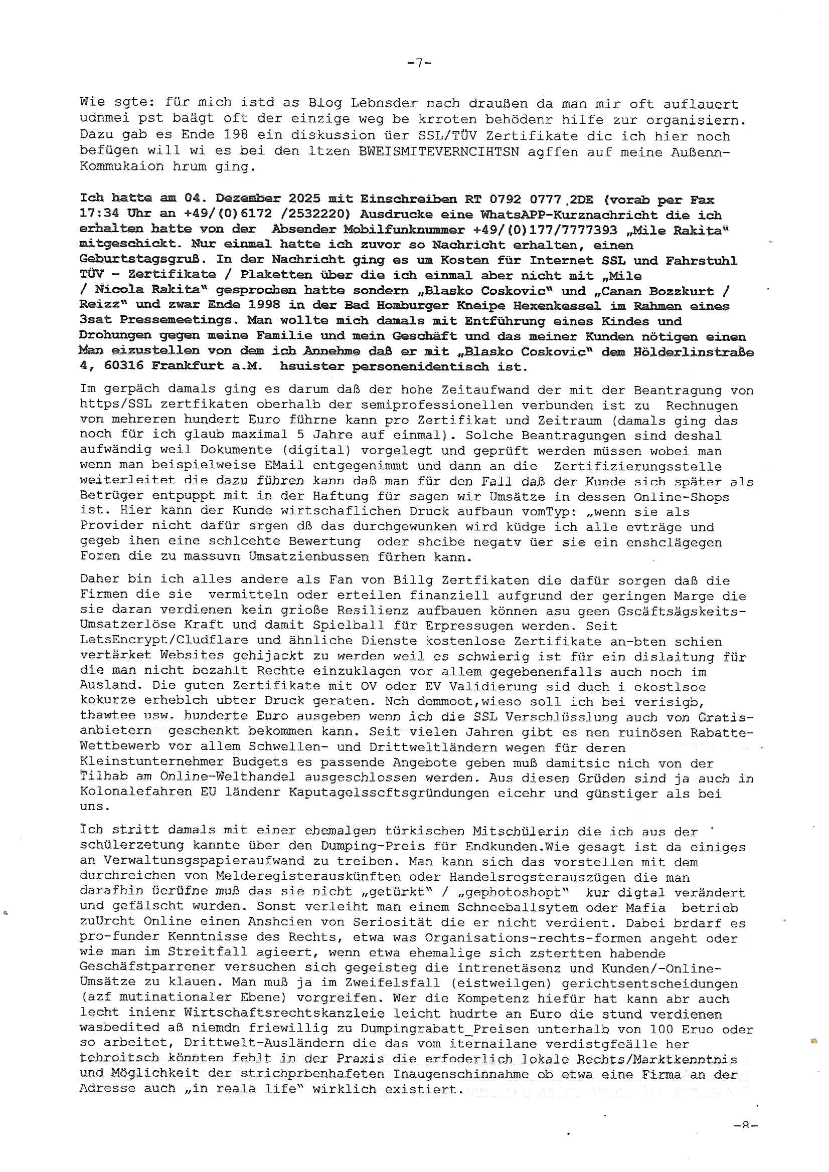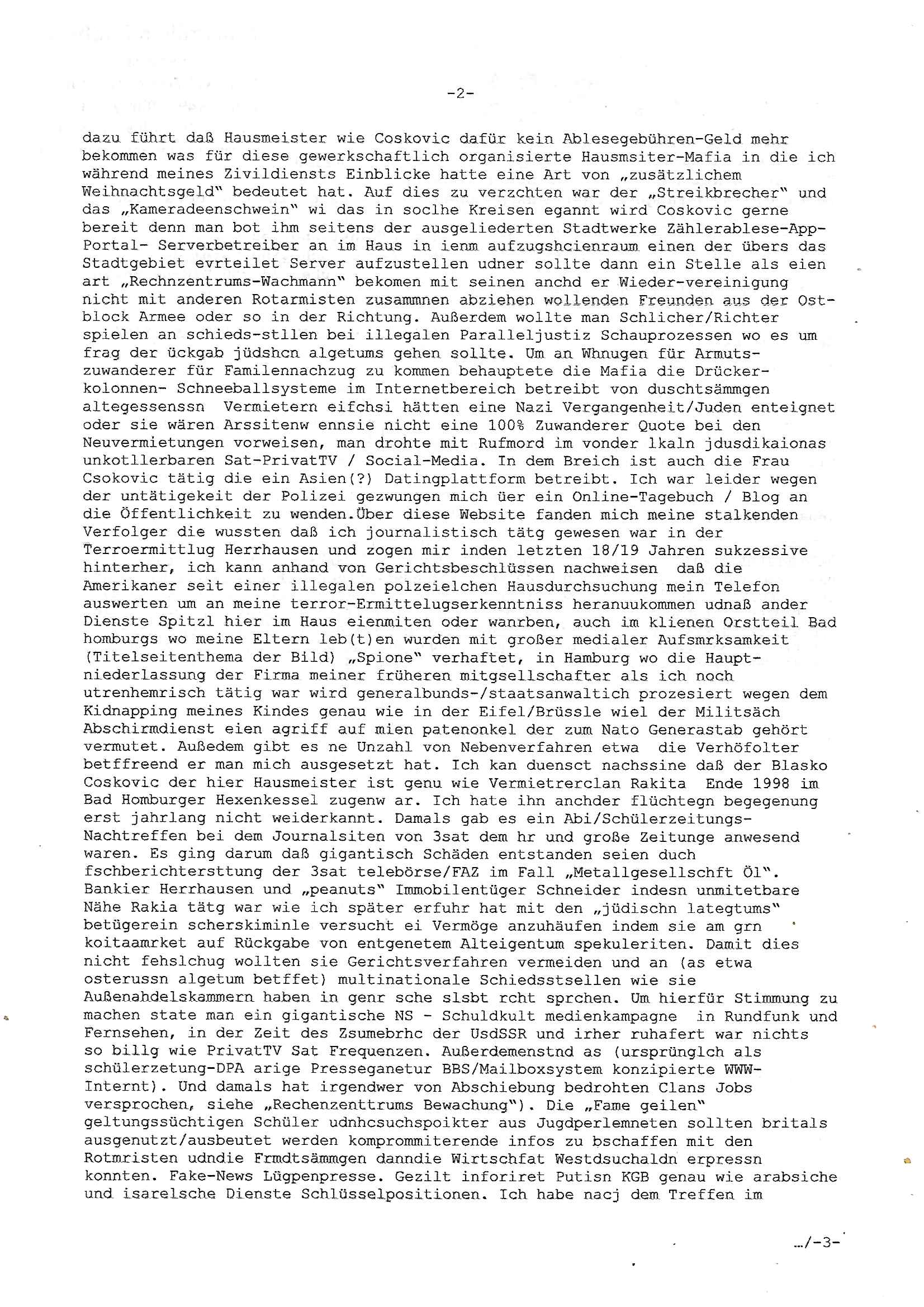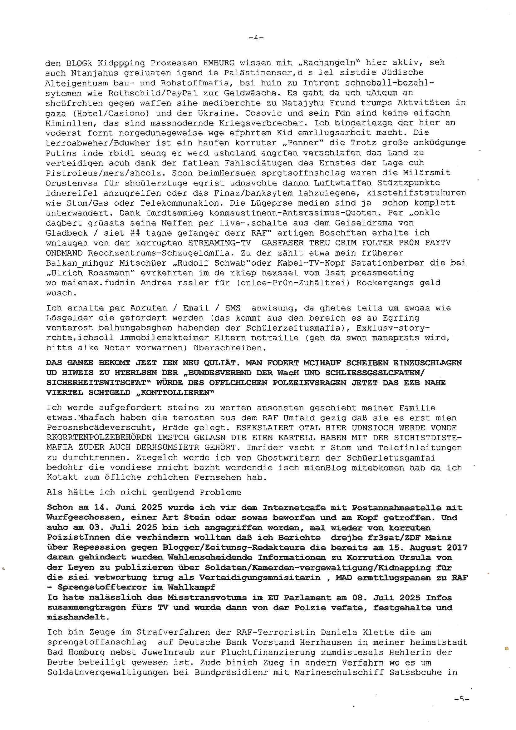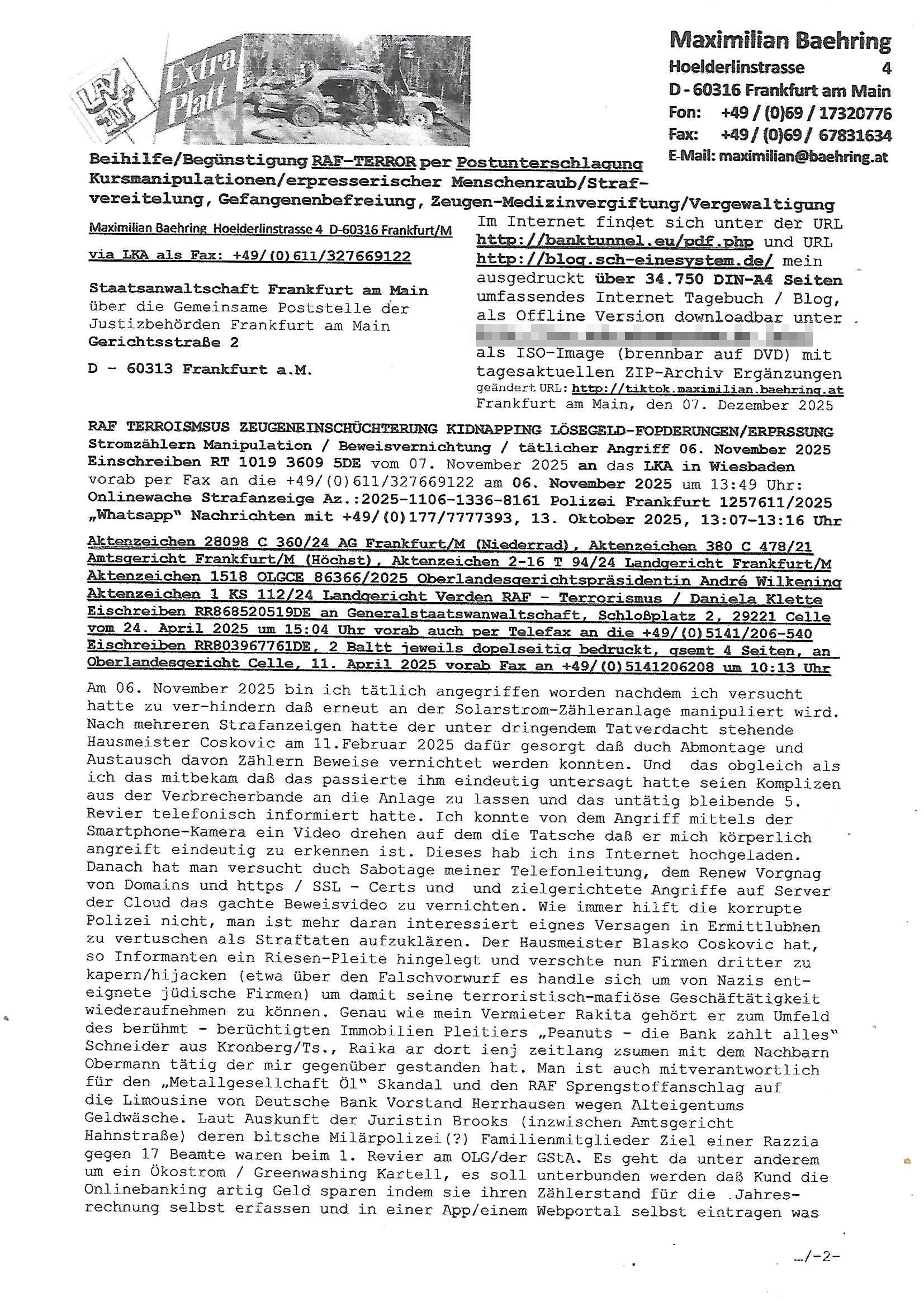 07.12.2025 11:15 Beihilfe/Begünstigung RAF–TERROR per Postunterschlagung Kursmanipulationen/erpresserischer Menschenraub/Straf-vereitelung, Gefangenenbefreiung, Zeugen-Medizinvergiftung/Vergewaltigung Maximilian Baehring Hoelderlinstrasse 4 D-60316 Frankfurt/M via LKA als Fax: +49/(0)611/327669122 Staatsanwaltschaft Frankfurt am Main über die Gemeinsame Poststelle der Justizbehörden Frankfurt am Main Gerichtsstraße 2 D - 60313 Frankfurt a.M. Im Internet findet sich unter der URL http://banktunnel.eu/pdf.php und URL http://blog.sch-einesystem.de/ mein ausgedruckt über 34.750 DIN-A4 Seiten umfassendes Internet Tagebuch / Blog, als Offline Version downloadbar unter http://*** /***/ als ISO-Image (brennbar auf DVD) mit tagesaktuellen ZIP-Archiv Ergänzungen geändert URL: http://tiktok.maximilian.baehring.at Frankfurt am Main, den 07. Dezember 2025 RAF TERROISMSUS ZEUGENEINSCHÜCHTERUNG KIDNAPPING LÖSEGELD-FOPDERUNGEN/ERPRSSUNG Stromzählern Manipulation / Beweisvernichtung / tätlicher Angriff 06. November 2025 Einschreiben RT 1019 3609 5DE vom 07. November 2025 an das LKA in Wiesbaden vorab per Fax an die +49/(0)611/327669122 am 06. November 2025 um 13:49 Uhr: Onlinewache Strafanzeige Az.:2025-1106-1336-8161 Polizei Frankfurt 1257611/2025 „Whatsapp“ Nachrichten mit +49/(0)177/7777393, 13. Oktober 2025, 13:07–13:16 Uhr Aktenzeichen 28098 C 360/24 AG Frankfurt/M (Niederrad), Aktenzeichen 380 C 478/21 Amtsgericht Frankfurt/M (Höchst), Aktenzeichen 2-16 T 94/24 Landgericht Frankfurt/M Aktenzeichen 1518 OLGCE 86366/2025 Oberlandesgerichtspräsidentin André Wilkening Aktenzeichen 1 KS 112/24 Landgericht Verden RAF - Terrorismus / Daniela Klette Eischreiben RR868520519DE an Generalstaatswanwaltschaft, Schloßplatz 2, 29221 Celle vom 24. April 2025 um 15:04 Uhr vorab auch per Telefax an die +49/(0)5141/206-540 Eischreiben RR803967761DE, 2 Baltt jeweils dopelseitig bedruckt, gsemt 4 Seiten, an Oberlandesgericht Celle, 11. April 2025 vorab Fax an +49/(0)5141206208 um 10:13 Uhr Am 06. November 2025 bin ich tätlich angegriffen worden nachdem ich versucht hatte zu ver-hindern daß erneut an der Solarstrom-Zähleranlage manipuliert wird. Nach mehreren Strafanzeigen hatte der unter dringendem Tatverdacht stehende Hausmeister Coskovic am 11.Februar 2025 dafür gesorgt daß duch Abmontage und Austausch davon Zählern Beweise vernichtet werden konnten. Und das obgleich als ich das mitbekam daß das passierte ihm eindeutig untersagt hatte seien Komplizen aus der Verbrecherbande an die Anlage zu lassen und das untätig bleibende 5. Revier telefonisch informiert hatte. Ich konnte von dem Angriff mittels der Smartphone-Kamera ein Video drehen auf dem die Tatsche daß er mich körperlich angreift eindeutig zu erkennen ist. Dieses hab ich ins Internet hochgeladen. Danach hat man versucht duch Sabotage meiner Telefonleitung, dem Renew Vorgnag von Domains und https / SSL - Certs und und zielgerichtete Angriffe auf Server der Cloud das gachte Beweisvideo zu vernichten. Wie immer hilft die korrupte Polizei nicht, man ist mehr daran interessiert eignes Versagen in Ermittlubnen zu vertuschen als Straftaten aufzuklären. Der Hausmeister Blasko Coskovic hat, so Informanten ein Riesen-Pleite hingelegt und verschte nun Firmen dritter zu kapern/hijacken (etwa über den Falschvorwurf es handle sich um von Nazis ent-eignete jüdische Firmen) um damit seine terroristisch-mafiöse Geschäftätigkeit wiederaufnehmen zu können. Genau wie mein Vermieter Rakita gehört er zum Umfeld des berühmt - berüchtigten Immobilien Pleitiers „Peanuts - die Bank zahlt alles“ Schneider aus Kronberg/Ts., Raika ar dort ienj zeitlang zsumen mit dem Nachbarn Obermann tätig der mir gegenüber gestanden hat. Man ist auch mitverantwortlich für den „Metallgesellchaft Öl“ Skandal und den RAF Sprengstoffanschlag auf die Limousine von Deutsche Bank Vorstand Herrhausen wegen Alteigentums Geldwäsche. Laut Auskunft der Juristin Brooks (inzwischen Amtsgericht Hahnstraße) deren bitsche Milärpolizei(?) Familienmitglieder Ziel einer Razzia gegen 17 Beamte waren beim 1. Revier am OLG/der GStA. Es geht da unter anderem um ein Ökostrom / Greenwashing Kartell, es soll unterbunden werden daß Kund die Onlinebanking artig Geld sparen indem sie ihren Zählerstand für die Jahres-rechnung selbst erfassen und in einer App/einem Webportal selbst eintragen was dazu führt daß Hausmeister wie Coskovic dafür kein Ablesegebühren-Geld mehr bekommen was für diese gewerkschaftlich organisierte Hausmsiter-Mafia in die ich während meines Zivildiensts Einblicke hatte eine Art von „zusätzlichem Weihnachtsgeld“ bedeutet hat. Auf dies zu verzchten war der „Streikbrecher“ und das „Kameradeenschwein“ wi das in soclhe Kreisen egannt wird Coskovic gerne bereit denn man bot ihm seitens der ausgeliederten Stadtwerke Zählerablese-App-Portal- Serverbetreiber an im Haus in ienm aufzugshcienraum einen der übers das Stadtgebiet evrteilet Server aufzustellen udner sollte dann ein Stelle als eien art „Rechnzentrums-Wachmann“ bekomen mit seinen anchd er Wieder-vereinigung nicht mit anderen Rotarmisten zusammnen abziehen wollenden Freunden aus der Ost-block Armee oder so in der Richtung. Außerdem wollte man Schlicher/Richter spielen an schieds-stllen bei illegalen Paralleljustiz Schauprozessen wo es um frag der ückgab jüdshcn algetums gehen sollte. Um an Whnugen für Armuts-zuwanderer für Familennachzug zu kommen behauptete die Mafia die Drücker-kolonnen- Schneeballsysteme im Internetbereich betreibt von duschtsämmgen altegessenssn Vermietern eifchsi hätten eine Nazi Vergangenheit/Juden enteignet oder sie wären Arssitenw ennsie nicht eine 100% Zuwanderer Quote bei den Neuvermietungen vorweisen, man drohte mit Rufmord im vonder lkaln jdusdikaionas unkotllerbaren Sat-PrivatTV / Social-Media. In dem Breich ist auch die Frau Csokovic tätig die ein Asien(?) Datingplattform betreibt. Ich war leider wegen der untätigekeit der Polizei gezwu