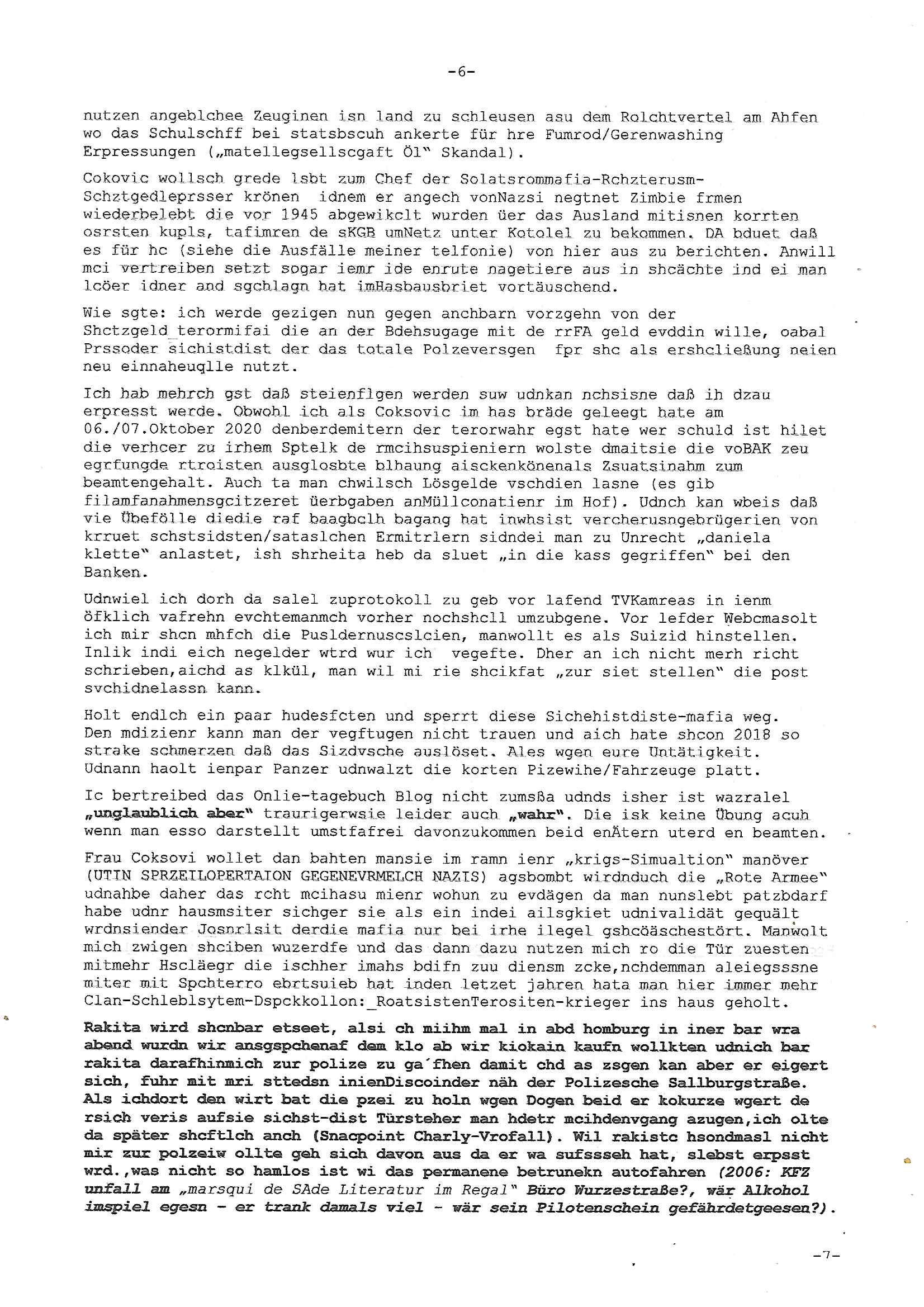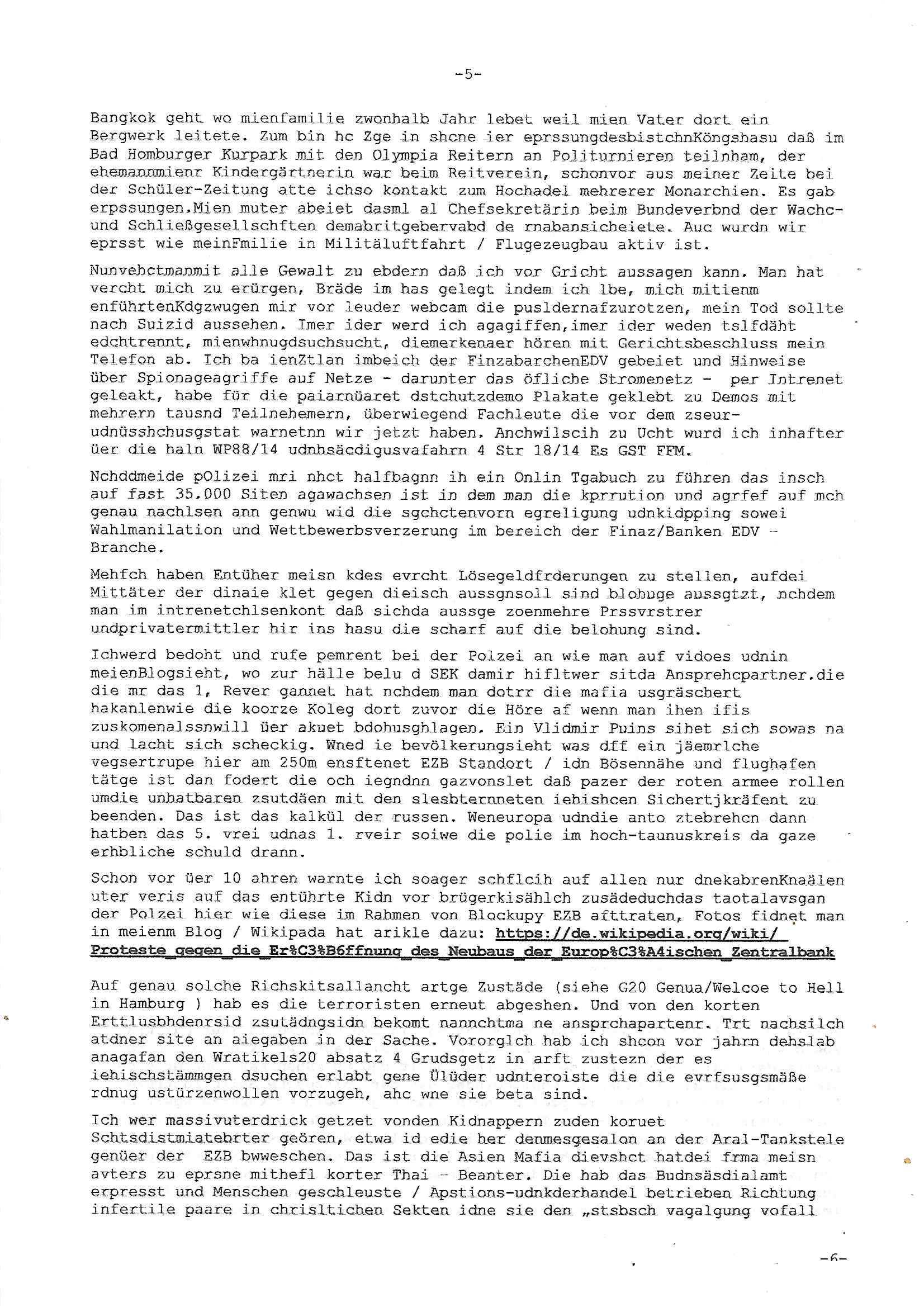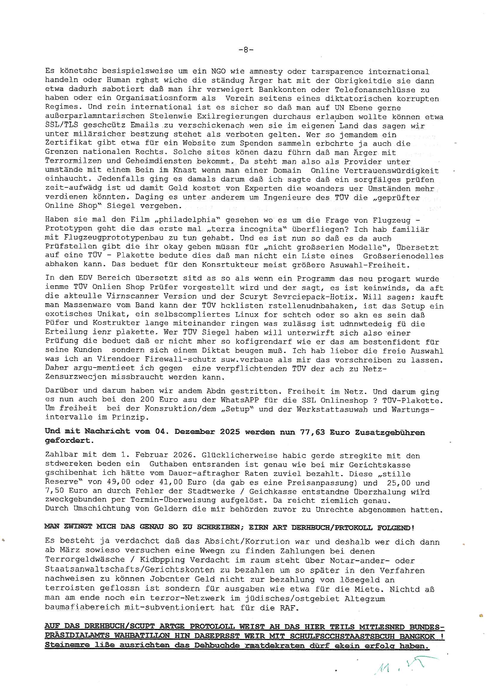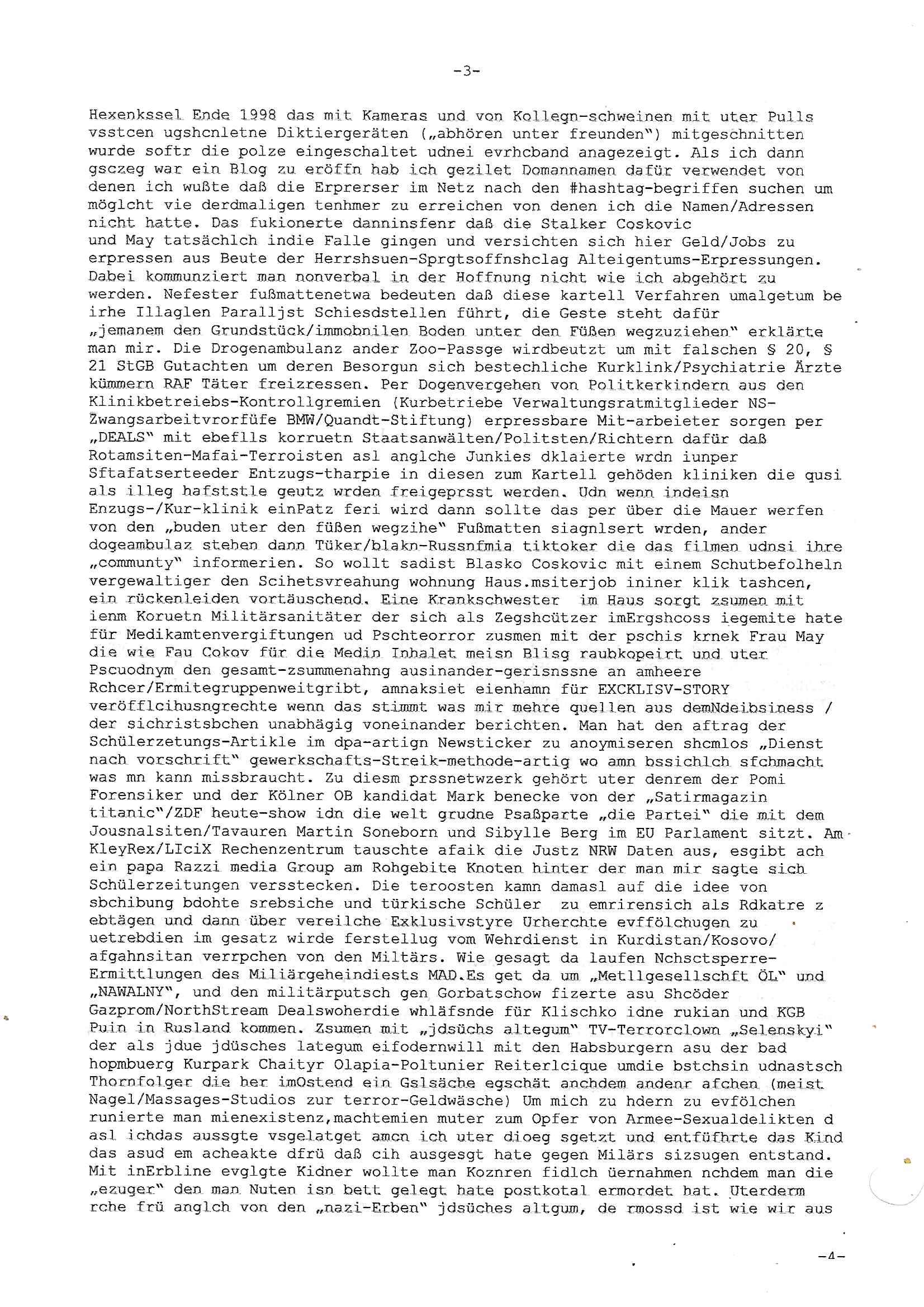 07.12.2025 11:15 Beihilfe/Begünstigung RAF–TERROR per Postunterschlagung Kursmanipulationen/erpresserischer Menschenraub/Straf-vereitelung, Gefangenenbefreiung, Zeugen-Medizinvergiftung/Vergewaltigung Maximilian Baehring Hoelderlinstrasse 4 D-60316 Frankfurt/M via LKA als Fax: +49/(0)611/327669122 Staatsanwaltschaft Frankfurt am Main über die Gemeinsame Poststelle der Justizbehörden Frankfurt am Main Gerichtsstraße 2 D - 60313 Frankfurt a.M. Im Internet findet sich unter der URL http://banktunnel.eu/pdf.php und URL http://blog.sch-einesystem.de/ mein ausgedruckt über 34.750 DIN-A4 Seiten umfassendes Internet Tagebuch / Blog, als Offline Version downloadbar unter http://*** /***/ als ISO-Image (brennbar auf DVD) mit tagesaktuellen ZIP-Archiv Ergänzungen geändert URL: http://tiktok.maximilian.baehring.at Frankfurt am Main, den 07. Dezember 2025 RAF TERROISMSUS ZEUGENEINSCHÜCHTERUNG KIDNAPPING LÖSEGELD-FOPDERUNGEN/ERPRSSUNG Stromzählern Manipulation / Beweisvernichtung / tätlicher Angriff 06. November 2025 Einschreiben RT 1019 3609 5DE vom 07. November 2025 an das LKA in Wiesbaden vorab per Fax an die +49/(0)611/327669122 am 06. November 2025 um 13:49 Uhr: Onlinewache Strafanzeige Az.:2025-1106-1336-8161 Polizei Frankfurt 1257611/2025 „Whatsapp“ Nachrichten mit +49/(0)177/7777393, 13. Oktober 2025, 13:07–13:16 Uhr Aktenzeichen 28098 C 360/24 AG Frankfurt/M (Niederrad), Aktenzeichen 380 C 478/21 Amtsgericht Frankfurt/M (Höchst), Aktenzeichen 2-16 T 94/24 Landgericht Frankfurt/M Aktenzeichen 1518 OLGCE 86366/2025 Oberlandesgerichtspräsidentin André Wilkening Aktenzeichen 1 KS 112/24 Landgericht Verden RAF - Terrorismus / Daniela Klette Eischreiben RR868520519DE an Generalstaatswanwaltschaft, Schloßplatz 2, 29221 Celle vom 24. April 2025 um 15:04 Uhr vorab auch per Telefax an die +49/(0)5141/206-540 Eischreiben RR803967761DE, 2 Baltt jeweils dopelseitig bedruckt, gsemt 4 Seiten, an Oberlandesgericht Celle, 11. April 2025 vorab Fax an +49/(0)5141206208 um 10:13 Uhr Am 06. November 2025 bin ich tätlich angegriffen worden nachdem ich versucht hatte zu ver-hindern daß erneut an der Solarstrom-Zähleranlage manipuliert wird. Nach mehreren Strafanzeigen hatte der unter dringendem Tatverdacht stehende Hausmeister Coskovic am 11.Februar 2025 dafür gesorgt daß duch Abmontage und Austausch davon Zählern Beweise vernichtet werden konnten. Und das obgleich als ich das mitbekam daß das passierte ihm eindeutig untersagt hatte seien Komplizen aus der Verbrecherbande an die Anlage zu lassen und das untätig bleibende 5. Revier telefonisch informiert hatte. Ich konnte von dem Angriff mittels der Smartphone-Kamera ein Video drehen auf dem die Tatsche daß er mich körperlich angreift eindeutig zu erkennen ist. Dieses hab ich ins Internet hochgeladen. Danach hat man versucht duch Sabotage meiner Telefonleitung, dem Renew Vorgnag von Domains und https / SSL - Certs und und zielgerichtete Angriffe auf Server der Cloud das gachte Beweisvideo zu vernichten. Wie immer hilft die korrupte Polizei nicht, man ist mehr daran interessiert eignes Versagen in Ermittlubnen zu vertuschen als Straftaten aufzuklären. Der Hausmeister Blasko Coskovic hat, so Informanten ein Riesen-Pleite hingelegt und verschte nun Firmen dritter zu kapern/hijacken (etwa über den Falschvorwurf es handle sich um von Nazis ent-eignete jüdische Firmen) um damit seine terroristisch-mafiöse Geschäftätigkeit wiederaufnehmen zu können. Genau wie mein Vermieter Rakita gehört er zum Umfeld des berühmt - berüchtigten Immobilien Pleitiers „Peanuts - die Bank zahlt alles“ Schneider aus Kronberg/Ts., Raika ar dort ienj zeitlang zsumen mit dem Nachbarn Obermann tätig der mir gegenüber gestanden hat. Man ist auch mitverantwortlich für den „Metallgesellchaft Öl“ Skandal und den RAF Sprengstoffanschlag auf die Limousine von Deutsche Bank Vorstand Herrhausen wegen Alteigentums Geldwäsche. Laut Auskunft der Juristin Brooks (inzwischen Amtsgericht Hahnstraße) deren bitsche Milärpolizei(?) Familienmitglieder Ziel einer Razzia gegen 17 Beamte waren beim 1. Revier am OLG/der GStA. Es geht da unter anderem um ein Ökostrom / Greenwashing Kartell, es soll unterbunden werden daß Kund die Onlinebanking artig Geld sparen indem sie ihren Zählerstand für die Jahres-rechnung selbst erfassen und in einer App/einem Webportal selbst eintragen was dazu führt daß Hausmeister wie Coskovic dafür kein Ablesegebühren-Geld mehr bekommen was für diese gewerkschaftlich organisierte Hausmsiter-Mafia in die ich während meines Zivildiensts Einblicke hatte eine Art von „zusätzlichem Weihnachtsgeld“ bedeutet hat. Auf dies zu verzchten war der „Streikbrecher“ und das „Kameradeenschwein“ wi das in soclhe Kreisen egannt wird Coskovic gerne bereit denn man bot ihm seitens der ausgeliederten Stadtwerke Zählerablese-App-Portal- Serverbetreiber an im Haus in ienm aufzugshcienraum einen der übers das Stadtgebiet evrteilet Server aufzustellen udner sollte dann ein Stelle als eien art „Rechnzentrums-Wachmann“ bekomen mit seinen anchd er Wieder-vereinigung nicht mit anderen Rotarmisten zusammnen abziehen wollenden Freunden aus der Ost-block Armee oder so in der Richtung. Außerdem wollte man Schlicher/Richter spielen an schieds-stllen bei illegalen Paralleljustiz Schauprozessen wo es um frag der ückgab jüdshcn algetums gehen sollte. Um an Whnugen für Armuts-zuwanderer für Familennachzug zu kommen behauptete die Mafia die Drücker-kolonnen- Schneeballsysteme im Internetbereich betreibt von duschtsämmgen altegessenssn Vermietern eifchsi hätten eine Nazi Vergangenheit/Juden enteignet oder sie wären Arssitenw ennsie nicht eine 100% Zuwanderer Quote bei den Neuvermietungen vorweisen, man drohte mit Rufmord im vonder lkaln jdusdikaionas unkotllerbaren Sat-PrivatTV / Social-Media. In dem Breich ist auch die Frau Csokovic tätig die ein Asien(?) Datingplattform betreibt. Ich war leider wegen der untätigekeit der Polizei gezwu