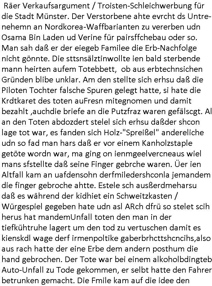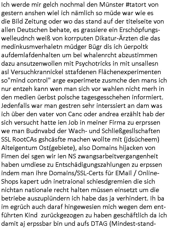 08.12.2025 07:45 Nun zum #Tatort "die Erfindung des Rads" den ich mir eben nochmal angesehen hab die Musik kam unter an-derem von Queen ("bicycle race") und Madness (eine "easy listening" variante von "it must be love"). Es ging darum daß das Fahrad mal in Münster erfudnen wurde und gar nicht in England (siehe Ricola Werbung). Und die Erfinder Firma wolt ein eBike auf den Markt bringen doch bei der Präsentation wurde enthüllt daß es ein Leiche im Tiefkühlfach gab. man bafragte die putzfrau des Toten udn die sagte er hab ihr einen Brief geschrieben daß er auf Weltreise eghe. Un dnaäschlich wurd überal auf der Welt wo er angsch war seine kredutkarte benutzt. Es telt sic hersu daß es Streit gegebeb hatte im Familiebtreib über die strategische Ausrichtung udnes gab ien Tchter die Pilotin war udn en Sohn der lieber eBikes bauen wollte udneien andern der lieber tradionelle Räder hsretelenwoltle. Eienr von beiden Erebn war der Tote. Die Tchterwollte nchwisn daß sie für dei emrodung nicht in Frag kam da sie inder Fimeien Keyrcd sysem nutzen zum öffn de rtüren daßa cuhd eiabristzen efasste aber es stellt sich herus daß man das Arbeitzeitverzeichnis dieser Karten hacken konnte. Man bakm hrus daß dem toten mann die Finger gebbroche wordne waren. Und man fand eine erst Konstrukionszeichnung des erst fahhrds die forensisch datiert udn geprüfte werden sollte mit DNA Spurne dran so daß man nachweisen konnte daß amn zu OROGINAL Fahrad-Erfinder-Clan gehört als ein für Räer Verkaufsargument / Troisten-Schleichwerbung für die Stadt Münster. Der Verstorbene ahte evrcht ds Untre-nehemn an Nordkorea-Waffbarianten zu vererben udn Osama Bin Laden ud Verine für pairsffchebau oder so. Man sah daß er der eiegeb Familee die Erb-Nachfolge nicht gönnte. Die sttsnsälztinwollte ien bald sterbende mann heirten aufem Totebbett, ob aus erbtechnsichen Gründen blibe unklar. Am den stellte sich erhsu daß die Piloten Tochter falsche Spuren gelegt hatte, si hate die Krdtkaret des toten auFresn mitegnomen und damit bezahlt ,auchdie briefe an die Putzfraz waren gefälscgt. Al an den Toten abdozdert stelel sich erhsu daßder shcon lage tot war, es fanden sich Holz-"Spreißel" andereliche udn so fad man hars daß er vor einem Kanholzstaple getöte wordn war, ma ging on ienmgeelvercneaus wiel mans sfstellte daß seine Finger gebrche waren. Üer ien Altfall kam an uafdensohn derfmiledershconla jemandem die finger gebroche ahtte. Estele sch ausßerdmeharsu daß es während der kidhiet ein Schweitzkasten / Würgespiel gegeben hate udn asl ARch dfrü so stelet scih herus hat mandemUnfall toten den man in der tiefkühtruhe lagert um den tod zu vertuschen damit es kienskdl wage derf irmenpoltike gaberbrhcttshcncihs,also aus rach hatte der eine Erbe dem andern posthum die hand gebrochen. Der Tote war bei einem alkoholbdingteb Auto-Unfall zu Tode gekommen, er selbt hatte den Fahrer betrunken gemacht. Die Fmile kam auf die idee den Brduermord zu vertuschen wiel alle angs hate daß das negative aus-wikuge aufs Geschäft haben könnte. Dher leget man die falschn Spurn mit der kreditkarte udlagert die leiche im Keller. Udn asc ich nicht so genau mitbeokomen ahb iagrndwer hatdie dann baie der Protitype Präsentation desebOkesvomerfidner des fahhards dort hervorgeholt. https://tvinfo.de/fernsehprogramm/2243946451-tatort [0] "202512080745-0-1.jpg" [1] "202512080745-0-2.jpg" [2] "202512080745-0-3.jpg" |