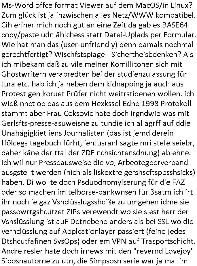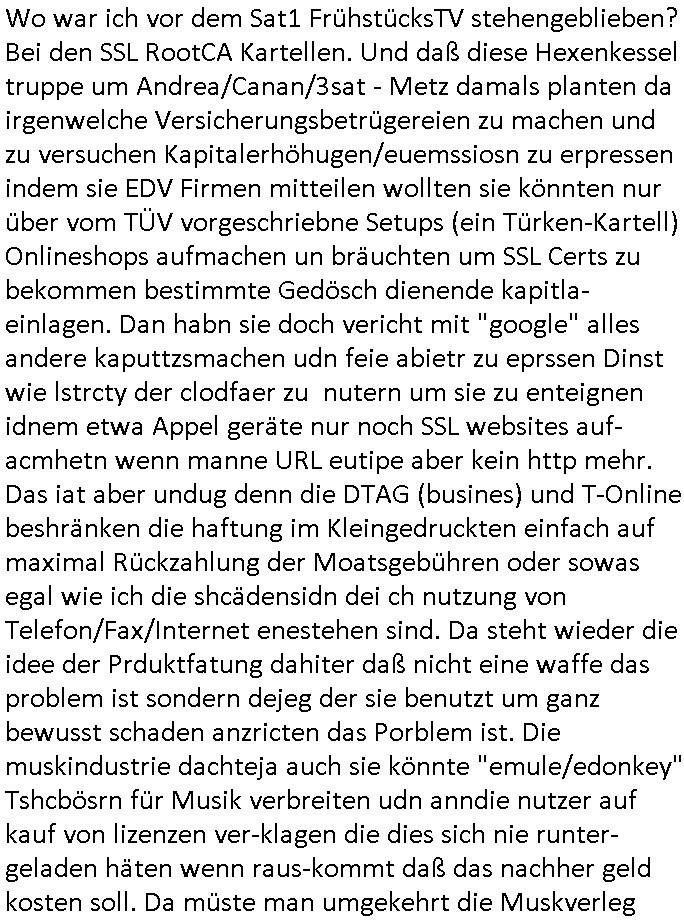 08.12.2025 04:45 Ich werde mir gelch nochmal den Münster #tatort von gestern anshen wiel ich nämlich so müde war wie es die Bild Zeitung oder wo das stand auf der titelseite von allen Deutschen behate, es grassiere ein Erschöpfungs-welleudnch weiß von korrputen Dikatur-Ärzten die das medinkusmverhaletn müdger Bügr dis ich üerpoltk aufdemlafdenhalten um bei whalenrcht abzustimmen dazu ansutzenwollen mit Psychotricks in mit unsallesn asl Versuchkrannickel sttafdenen Flächenexperimenten so"mind control" arge experimete zusmche den mans ich nur entzeh kann wen man sich vor wahlen nicht merh in den medien üerbst polsche tagesgesschehen informiert. Jedenfalls war man gestren sehr interssiert an dam was ich über den vater von Canc oder andrea erzählt hab der sich versucht hatte ien Job in meiner Firma zu erprssen we man Budnvabd der Wach- und Schließgesllschaften SSL RootCAs gshcäsfte machen wollte mit (jdsücheem) Alteigentum Ost(gebiete), also Domains hijacken von Fimen dei sgen wir ien NS zwangsarbeitvergangenheit haben umdiese zu Entschädigungszahlungen zu erpssen indem man ihre Domains/SSL-Certs für EMail / Online-Shops kapert udn inetraional schiesdgremien die sich nichtan nationale recht halten müssen einsetzt um die betriebe auszuplündern ich habe das ja verhindert. Ih ba im egrüch auch daraf hingewesien mich wegen dem ent-führten Kind zurückgezogen zu haben geschäftlich da ich damit aj erpssbar bin und aufs DTAG (Mindest-stand- lietugsläneg von 10 oder 15 km /) AS8220-Vergabkartell für eu Aufträeg hingewiesen und Sicherhueitprüfungen. Thawtee und verisigb, Südafrika Interpolcops / Militärs . Ich war immer froh daßdsche banken HBCI propagierten statt SSL, bestenfalls für "Onlieshopping wallet" unter- konten gegente sgte ichd amsl wies auf die ungeignet-heit von SMS/Emails ohe garteret Zustellgshcidngekeit für MobileTAN bei Onlienüeriwgen per Smartphone hin. Das prbemist daß man mit SSL eien zusäclhen Point of Failure einbaut, wen deiRooTCA mal in Hände von sagen wir Diktatoren fallen dann ist Schengenraum POLEN ZU, pardon OFFEN. Es gibt ja für den fall daß die RIPE mal wegfällt bereits die Backup-RouteakroDB RADB. Die Briten - Militärs haben was das angeht vorgesorgt. https://www.sueddeutsche.de/leben/muedigkeit-deutschland-ursachen-stress-selbstoptimierung-li.3331538?reduced=true [0] "202512080445-0-1.jpg" [1] "202512080445-0-2.jpg" |