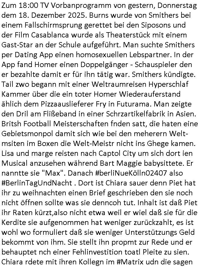 Zum 18:00 TV Vorbanprogramm von gestern, Donnerstag dem 18. Dezember 2025. Burns wurde von Smithers bei einem Fallschirmsprung gerettet bei den Siposons und der Film Casablanca wurde als Theaterstück mit einem Gast-Star an der Schule aufgeführt. Man suchte Smithers per Dating App einen homosexuellen Lebspartner. In der App fand Homer einen Doppelgänger - Schauspieler den er bezahlte damit er für ihn tätig war. Smithers kündigte. Tail zwo begann mit einer Weltraumreisen Hyperschlaf Kammer über die ein toter Homer Wiederauferstand ählich dem Pizzaauslieferer Fry in Futurama. Man zeigte den Dril am Flißeband in einer Schrzartikelfabrik in Asien. Britsh Football Meisterschaften fnden satt, die haten eine Gebietsmonpol damit sich wie bei den meherern Welt-msiten im Boxen die Welt-Meistr nicht ins Ghege kamen. Lisa und marge reisten nach Captol City um sich dort ien Musical anzusehen während Bart Maggie babysittete. Er nanntte sie "Max". Danach #berliNueKölln02407 also #BerlinTagUndNacht . Dort ist Chiara sauer denn Piet hat ihr zu weihnachten einen Brief geschrieben den sie noch nicht öffnen sollte was sie denncoh tut. Inhalt ist daß Piet ihr Raten kürzt,also nicht etwa weil er wiel daß sie für die Kerdite sie aufgenommen hat weniger zurückzahlt, es ist wohl wo formuliert daß sie weniger Unterstützungs Geld bekommt von ihm. Sie stellt ihn propmt zur Rede und er behauptet nch einer Fehlinvestition toatl Pleite zu sien. Chiara rdete mit ihren Kollegn im #Matrix udn die sagen