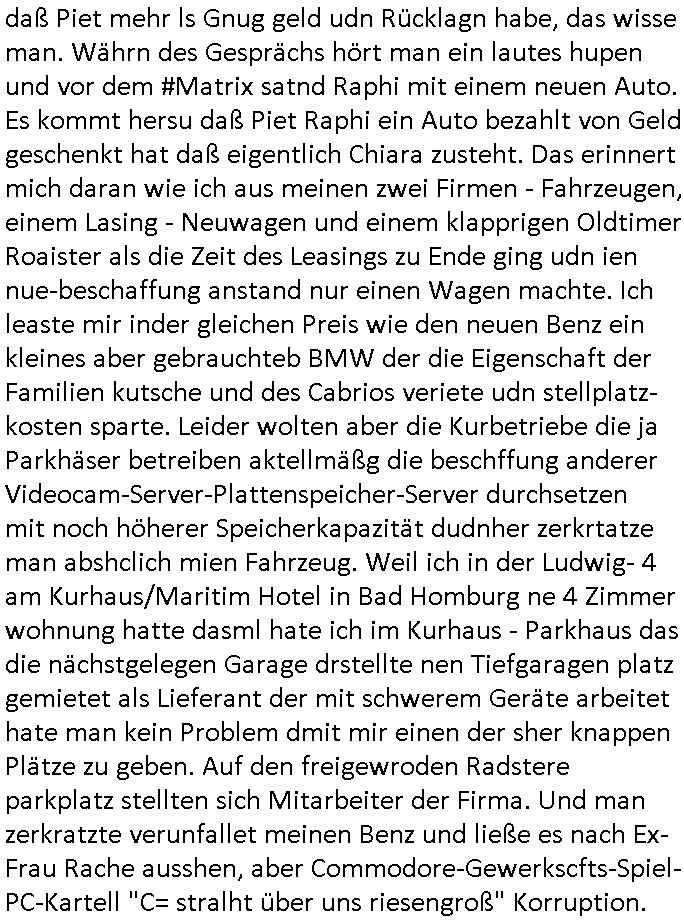 daß Piet mehr ls Gnug geld udn Rücklagn habe, das wisse man. Währn des Gesprächs hört man ein lautes hupen und vor dem #Matrix satnd Raphi mit einem neuen Auto. Es kommt hersu daß Piet Raphi ein Auto bezahlt von Geld geschenkt hat daß eigentlich Chiara zusteht. Das erinnert mich daran wie ich aus meinen zwei Firmen - Fahrzeugen, einem Lasing - Neuwagen und einem klapprigen Oldtimer Roaister als die Zeit des Leasings zu Ende ging udn ien nue-beschaffung anstand nur einen Wagen machte. Ich leaste mir inder gleichen Preis wie den neuen Benz ein kleines aber gebrauchteb BMW der die Eigenschaft der Familien kutsche und des Cabrios veriete udn stellplatz-kosten sparte. Leider wolten aber die Kurbetriebe die ja Parkhäser betreiben aktellmäßg die beschffung anderer Videocam-Server-Plattenspeicher-Server durchsetzen mit noch höherer Speicherkapazität dudnher zerkrtatze man abshclich mien Fahrzeug. Weil ich in der Ludwig- 4 am Kurhaus/Maritim Hotel in Bad Homburg ne 4 Zimmer wohnung hatte dasml hate ich im Kurhaus - Parkhaus das die nächstgelegen Garage drstellte nen Tiefgaragen platz gemietet als Lieferant der mit schwerem Geräte arbeitet hate man kein Problem dmit mir einen der sher knappen Plätze zu geben. Auf den freigewroden Radstere parkplatz stellten sich Mitarbeiter der Firma. Und man zerkratzte verunfallet meinen Benz und ließe es nach Ex-Frau Rache ausshen, aber Commodore-Gewerkscfts-Spiel-PC-Kartell "C= stralht über uns riesengroß" Korruption.