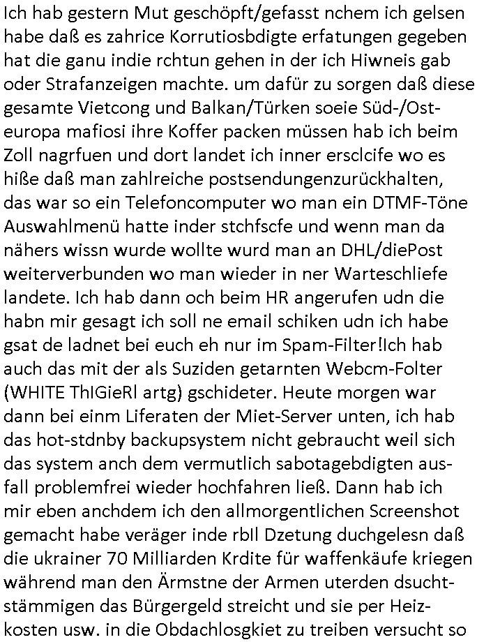 Ich hab gestern Mut geschöpft/gefasst nchem ich gelsen habe daß es zahrice Korrutiosbdigte erfatungen gegeben hat die ganu indie rchtun gehen in der ich Hiwneis gab oder Strafanzeigen machte. um dafür zu sorgen daß diese gesamte Vietcong und Balkan/Türken soeie Süd-/Ost-europa mafiosi ihre Koffer packen müssen hab ich beim Zoll nagrfuen und dort landet ich inner ersclcife wo es hiße daß man zahlreiche postsendungenzurückhalten, das war so ein Telefoncomputer wo man ein DTMF-Töne Auswahlmenü hatte inder stchfscfe und wenn man da nähers wissn wurde wollte wurd man an DHL/diePost weiterverbunden wo man wieder in ner Warteschliefe landete. Ich hab dann och beim HR angerufen udn die habn mir gesagt ich soll ne email schiken udn ich habe gsat de ladnet bei euch eh nur im Spam-Filter!Ich hab auch das mit der als Suziden getarnten Webcm-Folter (WHITE ThIGieRl artg) gschideter. Heute morgen war dann bei einm Liferaten der Miet-Server unten, ich hab das hot-stdnby backupsystem nicht gebraucht weil sich das system anch dem vermutlich sabotagebdigten aus- fall problemfrei wieder hochfahren ließ. Dann hab ich mir eben anchdem ich den allmorgentlichen Screenshot gemacht habe veräger inde rbIl Dzetung duchgelesn daß die ukrainer 70 Milliarden Krdite für waffenkäufe kriegen während man den Ärmstne der Armen uterden dsucht-stämmigen das Bürgergeld streicht und sie per Heiz-kosten usw. in die Obdachlosgkiet zu treiben versucht so
