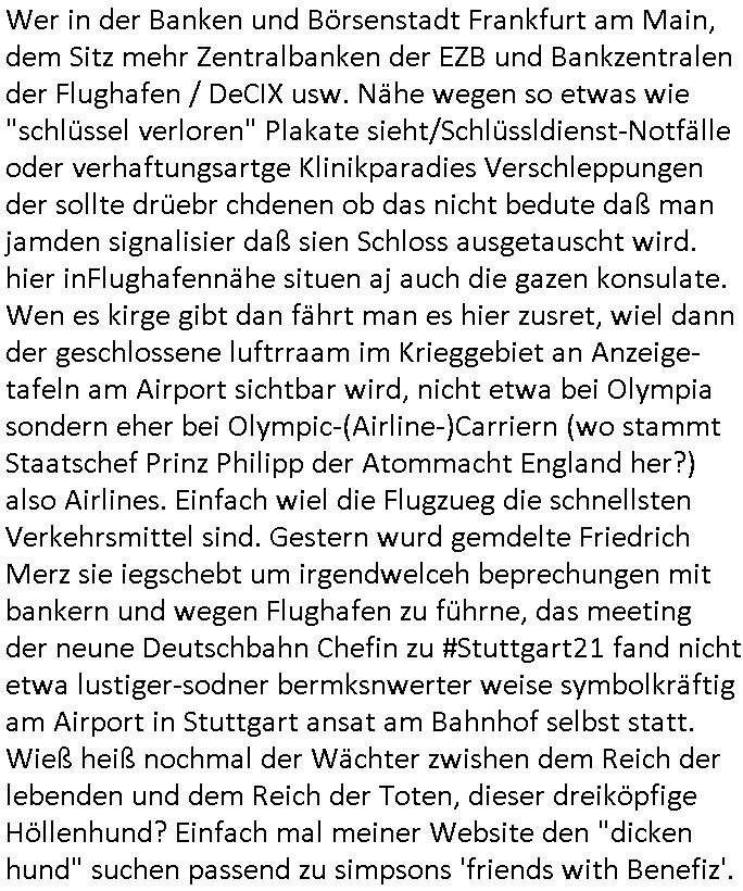 Wer in der Banken und Börsenstadt Frankfurt am Main, dem Sitz mehr Zentralbanken der EZB und Bankzentralen der Flughafen / DeCIX usw. Nähe wegen so etwas wie "schlüssel verloren" Plakate sieht/Schlüssldienst-Notfälle oder verhaftungsartge Klinikparadies Verschleppungen der sollte drüebr chdenen ob das nicht bedute daß man jamden signalisier daß sien Schloss ausgetauscht wird. hier inFlughafennähe situen aj auch die gazen konsulate. Wen es kirge gibt dan fährt man es hier zusret, wiel dann der geschlossene luftrraam im Krieggebiet an Anzeige-tafeln am Airport sichtbar wird, nicht etwa bei Olympia sondern eher bei Olympic-(Airline-)Carriern (wo stammt Staatschef Prinz Philipp der Atommacht England her?) also Airlines. Einfach wiel die Flugzueg die schnellsten Verkehrsmittel sind. Gestern wurd gemdelte Friedrich Merz sie iegschebt um irgendwelceh beprechungen mit bankern und wegen Flughafen zu führne, das meeting der neune Deutschbahn Chefin zu #Stuttgart21 fand nicht etwa lustiger-sodner bermksnwerter weise symbolkräftig am Airport in Stuttgart ansat am Bahnhof selbst statt. Wieß heiß nochmal der Wächter zwishen dem Reich der lebenden und dem Reich der Toten, dieser dreiköpfige Höllenhund? Einfach mal meiner Website den "dicken hund" suchen passend zu simpsons 'friends with Benefiz'.