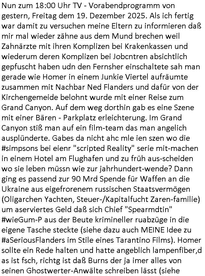 20.12.2025 02:30 Nun zum 18:00 Uhr TV - Vorabendprogramm von gestern, Freitag dem 19. Dezember 2025. Als ich fertig war damit zu versuchen meine Eltern zu informieren daß mir mal wieder zähne aus dem Mund brechen weil Zahnärzte mit ihren Komplizen bei Krakenkassen und wiederum deren Komplizen bei Jobcntren absichtlich gepfuscht haben udn den Fernsher einschaltete sah man gerade wie Homer in einem Junkie Viertel aufräumte zusammen mit Nachbar Ned Flanders und dafür von der Kirchengemeide belohnt wurde mit einer Reise zum Grand Canyon. Auf dem weg dorthin gab es eine Szene mit einer Bären - Parkplatz erleichterung. Im Grand Canyon stiß man auf ein film-team das man angelich ausplünderte. Gabes da nicht ahc mle ien szen wo die #simpsons bei eienr "scripted Reality" serie mit-machen in einem Hotel am Flughafen und zu früh aus-scheiden wo sie leben müssn wie zur jahrhundert-wende? Dann ging es passend zur 90 Mrd Spende für Waffen an die Ukraine aus eigefrorenem russischen Staatsvermögen (Oligarchen Yachten, Steuer-/Kapitalfucht Zaren-familie) um aserviertes Geld daß sich Chief "Spearmdtin" #wieGum-P aus der Beute krimineller ruabzüge in die eigene Tasche steckte (siehe dazu auch MEINE Idee zu #aSeriousFlanders im Stile eines Tarantino Films). Homer sollte ein Rede halten und hatte angeblich lampenfiber,d as ist fsch, richtg ist daß Burns der ja imer alles von seinen Ghostwerter-Anwälte schreiben lässt (siehe mikeGross #Suits) ihm sein Rede-manuskript stahl (per EDV-hack wie Frau C**kovic Inhate küftegr simposn folgen aus mien Blog das sie unerlaubterweise pseudononyosuiert nchdem sie dch ien medikanetn-ver-giftung dertwgen ich nicht mer shciben kann ordlche erricht hat daß man mir eine Sekrtäterin bezahlt damt mien aussge fürs gericht ditrert werdnekanndwobe sie aber das Diktat sinetsletend verfälscht und mienPost abfängt?) Es entstand der Mythos Hoemr hab angst ien rde zu haten "ANST IM DUKLEN ZU REDEN" (stimmt nicht, ich erinnere mal als Gewebis epximrnt an die as der Stehgreif Reden die wir im BWL Studium proben sollten oder fats imemr gut bewertete Refate von mir in der Schule). Ich glaube da gings eher darum einem von der Balkan- Geburtstags-clown-Mafia (siehe Vater Kur-Einstellungs-Gesundheitscheck musterung "Suizid" Film #theGame/#fullDisclosure mit Michael Douglas) nen Impro-Comedy "Caching Beratervertrag" zu geben von dieser "U-Bahn Kontrollöre" a-cappella Sychornsprcher Kidnapper Mafia um Matthias Keller vom Kinder-fernsehen. Homer sollte als "open microphone / Spke word" veranstaltung "Stslsistch hsuporzess gerichts-poesie" Stand-Up Comedian lernen auf Bühnen vor großem Publikum zu sprechen. Ich gabe es gibt da ganz andere Gründe für sie anst vor ien Auftitt, einfach mal an "Monika Lewinsky" alias "vera Zanner (geb. Berger)/Kita-heirat Ehefrau Tina Kreuzer" denken siehe diese "Blues brothers" Stalkerin aus dem Stadionkatakomben-Tunnel beim "th_Police" Auftritt. Angst vor Kidapping (Kongress-Sauna Anschlag Folge)/"herrhausen Attentat" Spreng-stoff-explosionen. Auch das thema der Rede im Kollegekreis wurde klar: Homer saß im Bunker der Studios (das ExtraPlatt Schülerzeitungsbüro, Humboldt-schule, Jacobisstraße 37, 61348 Bad Homburg) und machte zur "MAUER-FALL" Zeit Wahlkampf per TV statt per "Straßenwahlkampf" wegen der Stalerinnen - Gang. Es gibt noch ne zwote solche "Wahlkampf-panne" folge in den #Simpsons dort tritt #tomHanks auf udn st er müsse als Stunt-Double einsrpringen für den Präsidenten wegen der Subprrme oder auch "Euro-Krise" damals. Dann kam #berliNueKölln02407/#berlinTagUndNacht wo es um Christ-Stol_en Weihnachst-bäckerei "taste of" Tsraisttster Koch-Show Product-Placement Content ging. Aueßrdem darum daß Trennusgkder kien Lust af Weih-nachten haben wielsie kien intakte klein-Famile haben mit ihen liebcheneltren udn sie das Fest sie stets vor LOYALITÄTS-/GEWISSENS-KONFLIKTE stellt, fier ic mit demieneltzreteil dann mcheichd an dnern traurig/sauer. Auch Krätze bakm mal wieder Besuch von seinem Sohn, dem Trennungs/Scheidungskind "Ben Daniel" der sich wohl erher sein "zusatzeltetiel- satt gemeisames Eltern" Geschenk abholen wollte. Das Kind wurde genötigt bei einem Krippen-spiel/theatersrücke mitzumachen wo es ums erbetteln von Geld aus eventuellen weihnachtsgeld zahlungen ging, man spielte was christams Carol artiges mit Scrooge als anspielung auf den "herzlosen Piet" der (sind forschung und lehre nicht frei) sich weigerte chiara Studiendarlehen zu finanzieren asuden sich Lehrer wie Schul-Direktor Oliver oder Asia-Yanni dann ihre Löhne /Gehälter (vgl. [deutsch] arbeits-lohn und [englisch] loan (lehen) für Kredit-finanzierung) bezahlen. Siehe dazu das thema Abrtgeber-verband-Kita udn gewrkschafts-fuktionäre bettelie bis hin zu Morden/Attentaten durch linke gewerkschaftler ('siet # tagen gefangr der roten...') Nicht nur der herzlose Piet wird gemobbt, auch die herz-lose Milla ferte liebr im #Matrix als ohne ihre Familie. was wurde mal bsgehen von Tochter Amelie mit ihren Adoptiv-Pflege-Eltern aus lovern wie dubai-tom oder dem infertilen (zeugungsunfähigen) uganda-basti, dieses Asien Kinder-/Adoptionshandel/Leihmutterschaft Thema uAbsatmmung das auch beiden #simpsons vorkommt? Jedenfall drehte man in einer Sepia-Filter-Optik Blder dei aussahen asl stammten diese direkt vom Titlbalte von "der Wachturm" diesem "zeugen Jhoovers" magazin das in Fußgägerzone feilgeboten wird ben dem "kostelosen Kuran" von der "lies!" (tell me lies, tell me sweet little lies) Stiftung (bilder davon "aria free zone" im Blog, sihe das thema "vaterlose Einelternfamilie" dank unbefleckte empfängnis in der christ-lichen weihnachtsgeschichte, rolle der frau in der katholschen Kiche (unerwünscht)). Es gab zu den schönen Nikolausroten-Morgenmantel tahreafführungs Bildern von "christmas carol" Hausboot Weihnachtsfeier "jealousy" Bilder vom herzlosen Piet und Raphi ud Milla die alleine im Büro Chpagnerparty feierte. Schul-Direktor Oli hatte ein WG - W