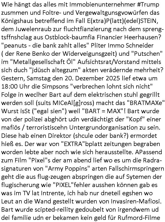 21.12.2025 04:45 Wie hängt das alles mit Immobienunternehmer #Trump zusmmen und Foltre- und Vergewaltgunsgvowürfen das Königshaus betreffend im Fall E(xtra)P(latt)(edel)STEIN, dem Juwelenraub zur fluchtfianzierung nach dem spreng-tsffnshclag aus Ostblock-baumfia Financier Heerhausen? "peanuts - die bank zahlt alles" Pliter Immo Schneider ( der Rene Benko der Widerveigunsgzeit) und "Putschen" im "Metallgesellschaft Öl" Aufsichtsrat/Vorstand mittels sich duch "jdüsch altegzum" akten verädernde mehrheit? Gestern, Samstag den 20. Dezember 2025 lief etwa um 18:00 Uhr die Simpsons "verbrechen lohnt sich nicht" Folge in weclher Bart auf dem elektrischen stuhl gegrillt werden soll (suits MICeAl[g]ross) macht das "BRATMAXe" Wurst isSt ("egal sien") weil "BART = MAX"! Bart wurde von der polizei abghört udn verdächtigt der "Kopf" einer mafiös / terroristiscehn Untergrundorganisation zu sein. Diese hab einen Direktor (shcule oder bank?) ermordet hieß es. Der war von "EXTRA"bplatt zeitungen begraben worden lebte aber noch wie sich herausstellte. APassend zum Film "Pixel"s der am abend lief wo es um die Radra-signaturen von "Army Poppins" arten Fallschirmspringern geht die aus flug-zeugen abspringen die auf Sytemen der flugischerung wie "PIXEL"fehler ausshen können gab es was im TV lat Intrente, ich hab nur dneteil egshen wo Leut an die Wand gestellt wurden von Invasiren-Mafiosi. Bart wurde scipted-reility gedoubelt von irgendwem ud dei familie udn er bekamen kein geld für Rufmord-Filme in denen man trotz daß es einen freispruch gegeben hatte bart auch weiterhin als einen Mörder hinstellte. Es hieß man hab die Reliärt oder reale Story/Gscihte genau soweit #PSEUDONONYMOUS verfremdet daß die scretd reliyt Film-Produktionsfirma sich herusreden könne das sei zwar "bsiernd auf iner wahrer begebenheit"/"based upon a true story" aber dennoch fiktionaler content. https://tvinfo.de/fernsehprogramm/2269571937-die-simpsons https://tvinfo.de/fernsehprogramm/2269574947-pixels https://www.youtube.com/watch?v=_p7_hI4_ZyA https://www.meica.de/produkte/bratwuerste [BRAT-MAX] [0] "202512210445-0-1.jpg" [1] "202512210445-0-2.jpg" [2] "202512210445-0-3.jpg" |