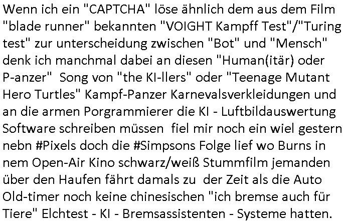 21.12.2025 12:00 Wenn ich ein "CAPTCHA" löse ähnlich dem aus dem Film "blade runner" bekannten "VOIGHT Kampff Test"/"Turing test" zur unterscheidung zwischen "Bot" und "Mensch" denk ich manchmal dabei an diesen "Human(itär) oder P-anzer" Song von "the KI-llers" oder "Teenage Mutant Hero Turtles" Kampf-Panzer Karnevalsverkleidungen und an die armen Porgrammierer die KI - Luftbildauswertung Software schreiben müssen fiel mir noch ein wiel gestern nebn #Pixels doch die #Simpsons Folge lief wo Burns in nem Open-Air Kino schwarz/weiß Stummfilm jemanden über den Haufen fährt damals zu der Zeit als die Auto Old-timer noch keine chinesischen "ich bremse auch für Tiere" Elchtest - KI - Bremsassistenten - Systeme hatten. https://de.wikipedia.org/wiki/Captcha https://bladerunner.fandom.com/wiki/Voight-Kampff_test https://de.wikipedia.org/wiki/Turing-Test https://www.tvinfo.de/fernsehprogramm/2269571980-die-simpsons https://www.trolley-mission.de/de/fluechtlinge-weltkrieg-eisenbahn-bruecke-mulde-bennewitz-wurzen https://simpsonswiki.com/wiki/Bart_Gets_Hit_by_a_Car [0] "202512211200-0-1.jpg" [1] "202512211200-0-2.jpg" |