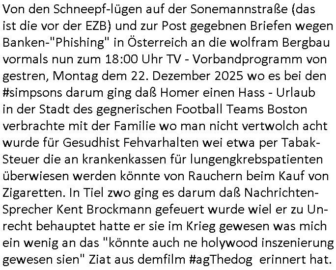 23.12.2025 13:30 Von den Schneepf-lügen auf der Sonemannstraße (das ist die vor der EZB) und zur Post gegebnen Briefen wegen Banken-"Phishing" in Österreich an die wolfram Bergbau vormals nun zum 18:00 Uhr TV - Vorbandprogramm von gestren, Montag dem 22. Dezember 2025 wo es bei den #simpsons darum ging daß Homer einen Hass - Urlaub in der Stadt des gegnerischen Football Teams Boston verbrachte mit der Familie wo man nicht vertwolch acht wurde für Gesudhist Fehvarhalten wei etwa per Tabak-Steuer die an krankenkassen für lungengkrebspatienten überwiesen werden könnte von Rauchern beim Kauf von Zigaretten. In Tiel zwo ging es darum daß Nachrichten-Sprecher Kent Brockmann gefeuert wurde wiel er zu Un-recht behauptet hatte er sie im Krieg gewesen was mich ein wenig an das "könnte auch ne holywood inszenierung gewesen sien" Ziat aus dem Film #wagTheDog erinnerte. https://tvinfo.de/fernsehprogramm/2269572426-die-simpsons https://tvinfo.de/fernsehprogramm/2269572435-die-simpsons [0] "202512231330-0-1.jpg" |