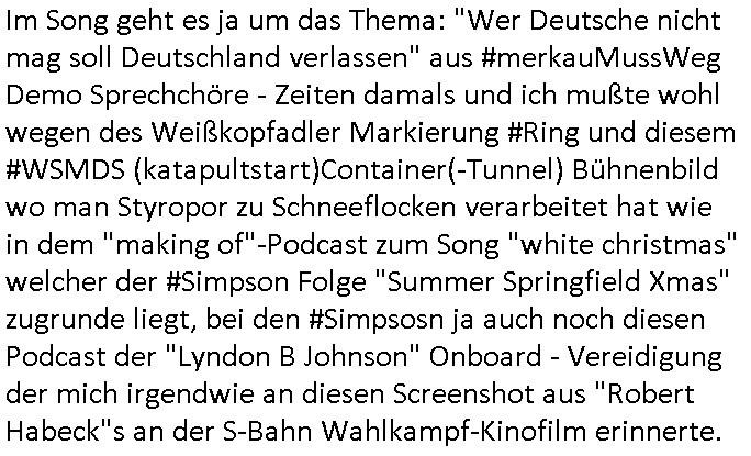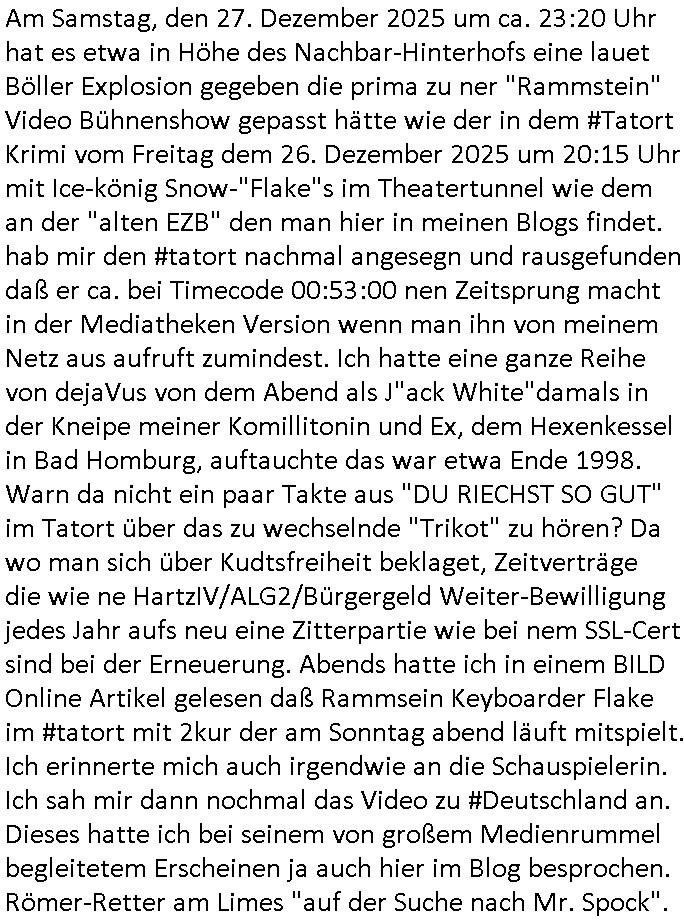 28.12.2025 00:00 Am Samstag, den 27. Dezember 2025 um ca. 23:20 Uhr hat es etwa in Höhe des Nachbar-Hinterhofs eine lauet Böller Explosion gegeben die prima zu ner "Rammstein" Video Bühnenshow gepasst hätte wie der in dem #Tatort Krimi vom Freitag dem 26. Dezember 2025 um 20:15 Uhr mit Ice-könig Snow-"Flake"s im Theatertunnel wie dem an der "alten EZB" den man hier in meinen Blogs findet. hab mir den #tatort nachmal angesegn und rausgefunden daß er ca. bei Timecode 00:53:00 nen Zeitsprung macht in der Mediatheken Version wenn man ihn von meinem Netz aus aufruft zumindest. Ich hatte eine ganze Reihe von dejaVus von dem Abend als J"ack White"damals in der Kneipe meiner Komillitonin und Ex, dem Hexenkessel in Bad Homburg, auftauchte das war etwa Ende 1998.Warn da nicht ein paar Takte aus "DU RIECHST SO GUT" im Tatort über das zu wechselnde "Trikot" zu hören? Da wo man sich über Kudtsfreiheit beklaget, Zeitverträge die wie ne HartzIV/ALG2/Bürgergeld Weiter-Bewilligung jedes Jahr aufs neu eine Zitterpartie wie bei nem SSL-Cert sind bei der Erneuerung. Abends hatte ich in einem BILD Online Artikel gelesen daß Rammsein Keyboarder Flake im #tatort mit 2kur der am Sonntag abend läuft mitspielt. Ich erinnerte mich auch irgendwie an die Schauspielerin. Ich sah mir dann nochmal das Video zu #Deutschland an. Dieses hatte ich bei seinem von großem Medienrummel begleitetem Erscheinen ja auch hier im Blog besprochen. Römer-Retter am Limes "auf der Suche nach Mr. Spock". Im Song geht es ja um das Thema: "Wer Deutsche nicht mag soll Deutschland verlassen" aus #merkauMussWeg Demo Sprechchöre - Zeiten damals und ich mußte wohl wegen des Weißkopfadler Markierung #Ring und diesem #WSMDS (katapultstart)Container(-Tunnel) Bühnenbild wo man Styropor zu Schneeflocken verarbeitet hat wie in dem "making of"-Podcast zum Song "white christmas" welcher der #Simpson Folge "Summer Springfield Xmas" zugrunde liegt, bei den #Simpsosn ja auch noch diesen Podcast der "Lyndon B Johnson" Onboard - Vereidigung der mich irgendwie an diesen Screenshot aus "Robert Habeck"s an der S-Bahn Wahlkampf-Kinofilm erinnerte. https://www.bild.de/unterhaltung/tatort-wegen-rammstein-skandal-schon-vor-krimi-ausstrahlung-694fc581a447568d66cf716e https://www.ardmediathek.de/tv-programm/691af39a688bff5ddbd71e9c https://www.youtube.com/watch?v=NeQM1c-XCDc https://en.wikipedia.org/wiki/A_Springfield_Summer_Christmas_for_Christmas https://www.ndr.de/kultur/film/tipps/jetzt-wohin-nachdenkliche-doku-ueber-scheitern-von-robert-habeck,jetztwohin-100.html [0] "202512280000-0-1.jpg" [1] "202512280000-0-2.jpg" [2] "202512280000-0-3.jpg" |