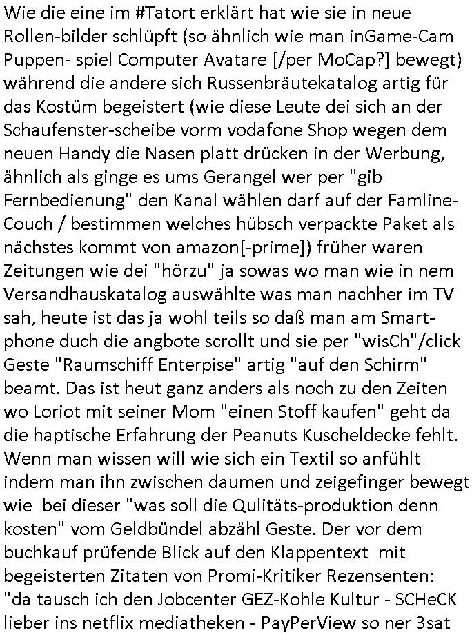 28.12.2025 07:00 Wie die eine im #Tatort erklärt hat wie sie in neue Rollen-bilder schlüpft (so ähnlich wie man inGame-Cam Puppen- spiel Computer Avatare [/per MoCap?] bewegt) während die andere sich Russenbräutekatalog artig für das Kostüm begeistert (wie diese Leute dei sich an der Schaufenster-scheibe vorm vodafone Shop wegen dem neuen Handy die Nasen platt drücken in der Werbung, ähnlich als ginge es ums Gerangel wer per "gib Fernbedienung" den Kanal wählen darf auf der Famline-Couch / bestimmen welches hübsch verpackte Paket als nächstes kommt von amazon[-prime]) früher waren Zeitungen wie dei "hörzu" ja sowas wo man wie in nem Versandhauskatalog auswählte was man nachher im TV sah, heute ist das ja wohl teils so daß man am Smart-phone duch die angbote scrollt und sie per "wisCh"/click Geste "Raumschiff Enterpise" artig "auf den Schirm" beamt. Das ist heut ganz anders als noch zu den Zeiten wo Loriot mit seiner Mom "einen Stoff kaufen" geht da die haptische Erfahrung der Peanuts Kuscheldecke fehlt. Wenn man wissen will wie sich ein Textil so anfühlt indem man ihn zwischen daumen und zeigefinger bewegt wie bei dieser "was soll die Qulitäts-produktion denn kosten" vom Geldbündel abzähl Geste. Der vor dem buchkauf prüfende Blick auf den Klappentext mit begeisterten Zitaten von Promi-Kritiker Rezensenten: "da tausch ich den Jobcenter GEZ-Kohle Kultur - SCHeCK lieber ins netflix mediatheken - PayPerView so ner 3sat Buchmesse Lesenswert Sendung in der Professor*Innen talk-show artig erklären ob sich ein sparen auf die neuen 'mit Farbschnitt' Verlagsprodukte zur komplettierung von Lücken in Bücherwänden als Videocall-Hintergrund lohnt" soundsoviel "amazon" kunden gaben hart verdientes Geld in Form von "google pay" Prepaid Guthaben karten aus dem Supermarkt aus um sich dies Import-Betsteller-Buch (oft tausende kilometer weit) "einfliegen" zu lassen als ePaper und habens behalten ohne es später gebraucht per Netz weiterverramschen zu wollen. ich mein denken wir an "margot käßmann" "ich fuhr zwar betrunken aber war es nicht doch shlußendlich Gott der das Unfall-Fahr-zeug lenkte?" : "eine Verteidgungsschrift". wer macht da nicht von seinem 14 tägigen online Rückgaberecht (trotz leichter kafferänderfleck gebrauchspuren) gebrauch so-bald er es aus-gelesen hat ( dieses "Mission Impossible" CD zerstört sich nach dem anhören selbst "Buch ohne Inhalt" das man in sich hineinsaugte wie Sylble Bergs Heldinnen irhen Milch-kaffee)? Wenn die Verbraucher knappes Geld ausgeben müssen, "Bildungspaket"-schecks vom Jobcenter oder Geschenk-Gutscheine einlösen,ich mein würden sie dann den "tod durch alkohol" #Tatort der GEZ trotzdem genausogern ansehen wie sagen wir "Nick Cage - Leaving als Vegas" Selbstmord auf Raten? Wo sie asl sie ihm den Flachmann gibt wie bei nem Strick oder Waffenkauf quasi noch "Sterbehilfe als Geschenk" (wie #Simpsons Mon_y Burns sie kaufem will) anbietet? https://www.bild.de/unterhaltung/stars-und-leute/margot-kaessmann-ueber-berufung-und-familie-mein-leben-ist-ein-einziges-buntes-chaos-69404a5811416590a630c07e https://tvinfo.de/fernsehprogramm/2260871336-tatort https://www.bmas.de/DE/Arbeit/Grundsicherung-Buergergeld/Bildungspaket/bildungspaket.html https://www.amazon.de/b?ie=UTF8&node=92139969031 [0] "202512280700-0-1.jpg" [1] "202512280700-0-2.jpg" [2] "202512280700-0-3.jpg" |