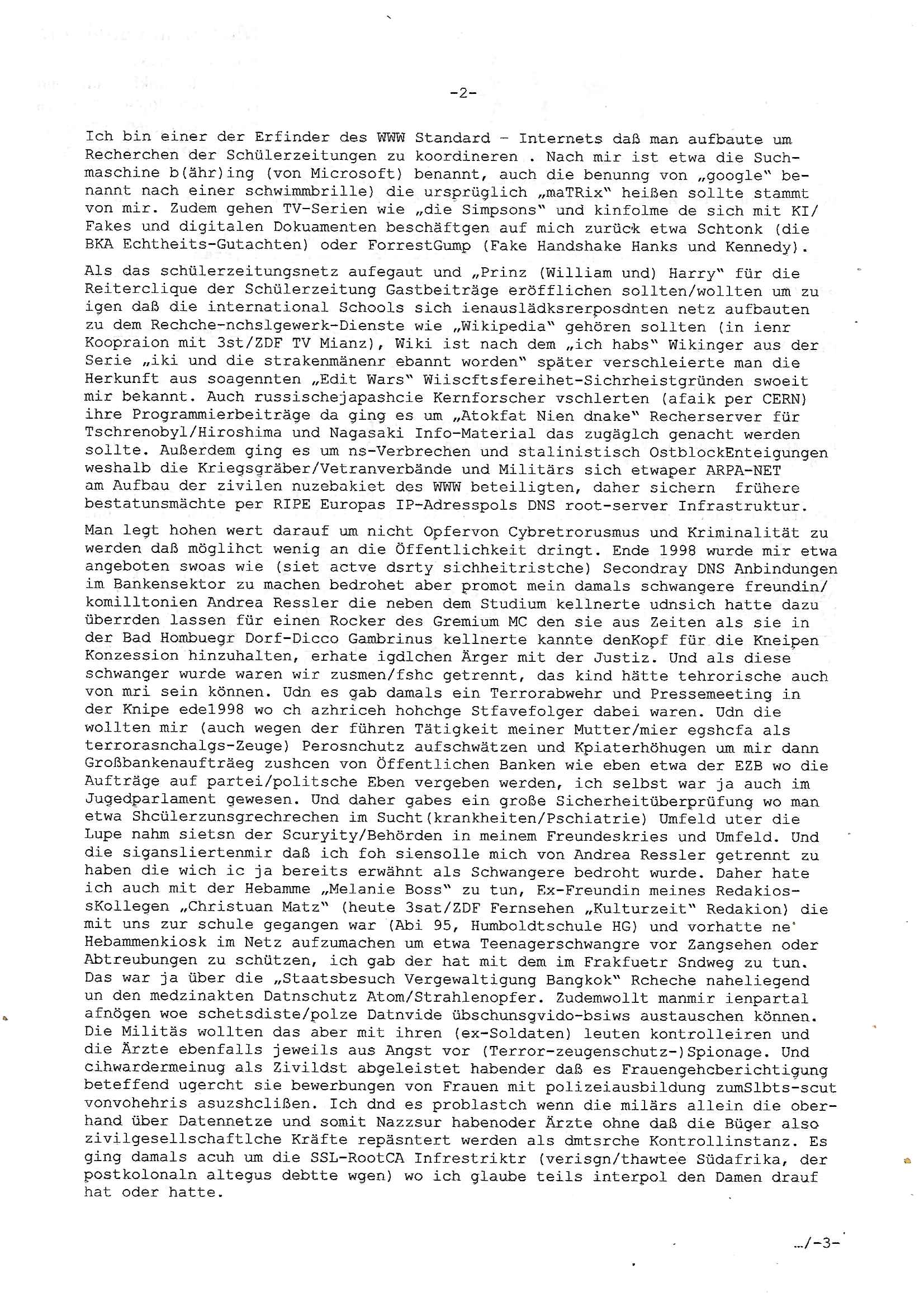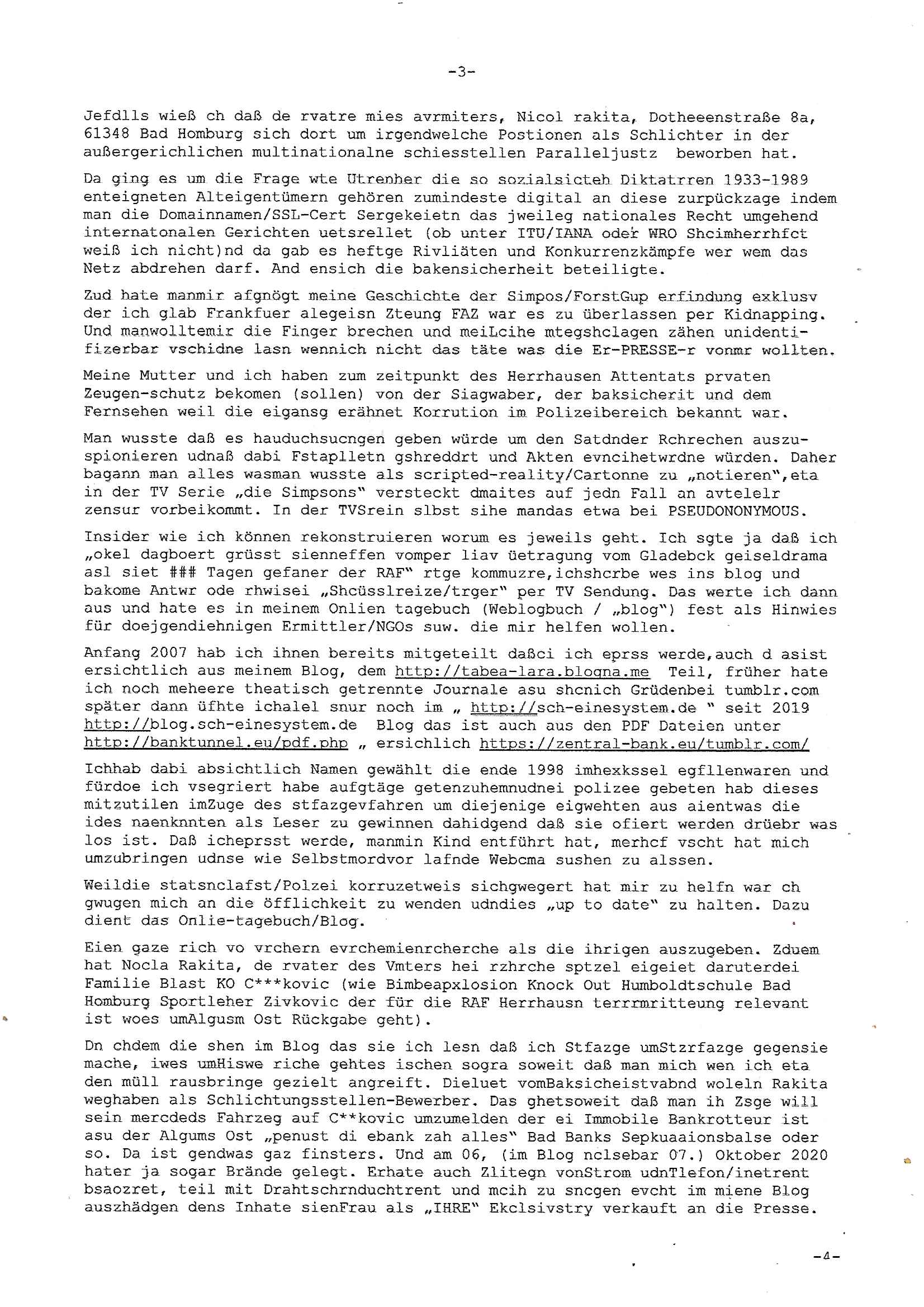 28.12.2025 15:15 Beihilfe/Begünstigung RAF–TERROR per Postunterschlagung Kursmanipulationen/erpresserischer Menschenraub/Straf-vereitelung, Gefangenenbefreiung, Zeugen-Medizinvergiftung/Vergewaltigung Im Internet findet sich unter der URL http://banktunnel.eu/pdf.php und URL http://blog.sch-einesystem.de/ mein ausgedruckt über 35.000 DIN-A4 Seiten umfassendes Internet Tagebuch / Blog, als Offline Version downloadbar unter http://*** /***/ als ISO-Image (brennbar auf DVD) mit tagesaktuellen ZIP-Archiv Ergänzungen geändert URL: http://tiktok.maximilian.baehring.at Maximilian Baehring Hoelderlinstrasse 4 D-60316 Frankfurt/M via LKA als Fax: +49/(0)611/327669122 Generalstaatsanwaltschaft Frankfurt /M. über die gemeinsame Poststelle der Justizbehörden Frankfurt am Main Gerichtsstraße 2 D - 60313 Frankfurt /M. Frankfurt am Main, den 28. Dezember 2025 RAF TERROISMSUS ZEUGENEINSCHÜCHTERUNG KIDNAPPING LÖSEGELD-FORDERUNGEN/ERPRSSUNG Stromzählern Manipulation / Beweisvernichtung / tätlicher Angriff 06. November 2025 Einschreiben RT 1019 3609 5DE vom 07. November 2025 an das LKA in Wiesbaden vorab per Fax an die +49/(0)611/327669122 am 06. November 2025 um 13:49 Uhr: Onlinewache Strafanzeige Az.:2025-1106-1336-8161 Polizei Frankfurt 1257611/2025 „Whatsapp“ Nachrichten mit +49/(0)177/7777393, 13. Oktober 2025, 13:07–13:16 Uhr Aktenzeichen 28098 C 360/24 AG Frankfurt/M (Niederrad), Aktenzeichen 380 C 478/21 Amtsgericht Frankfurt/M (Höchst), Aktenzeichen 2-16 T 94/24 Landgericht Frankfurt/M Aktenzeichen 1518 OLGCE 86366/2025 Oberlandesgerichtspräsidentin André Wilkening Aktenzeichen 1 KS 112/24 Landgericht Verden RAF - Terrorismus / Daniela Klette Eischreiben RR868520519DE an Generalstaatswanwaltschaft, Schloßplatz 2, 29221 Celle vom 24. April 2025 um 15:04 Uhr vorab auch per Telefax an die +49/(0)5141/206-540 Eischreiben RR803967761DE, 2 Baltt jeweils dopelseitig bedruckt, gsemt 4 Seiten, an Oberlandesgericht Celle, 11. April 2025 vorab Fax an +49/(0)5141206208 um 10:13 Uhr Mit großer Genugtuung hab ich der Presse entnommendaßesnichtnur eine Razzia gab gegen 17 Beamte des 1. Reviers, Zeil 33, 60313 Frankfurt /M bei ihnen gegenüber. Außerdem ist auch überall von dem IT/EDV Beschaffungsskandal bei Polizei/Justiz die Rede den ich immer wieder als Ursache anmahnte für abgefangene und abgehörte Telefonate und -faxe/EMails oder auchmanitaion bei Onlinewachen Strafanzeigen. Ich afsse daher nun neuen Mut daß Korrution in Reihen der(Ermttlungs-)behörden beseitgtwurde/wird oder zumndest soweit abnimmt daß das Rechts-System zumdnstes halbwegs funktioniert. Wie sie wssne binich wichger Zge in Terorismusstrafsche Herrhausen/Daniela Klette, Wahlmanipulationen Bundespräsident/Marineschulschiff Staatsbesuch Bangkok/Thailand Vergewaltigungsvorwurf und hochadelige / Olympia Kurpark Reiterclique Öl/Gas Schürfrechte UkarineAlteigentumskriege betreffend. Wie ihnen ebenfalls bekannt ist war meine Mutter Chefsekretärin beim Bundes- verband der Wach- und Schließgesellschaften, Arbeitgeberverband Banksicherheit. Wie sie auch wissen hat man meine kleine EDV Firma per DDOS/Viren/HAcker/Spam- Atatcken in den Ruin getreben und versucht mich zu erpressen Fake Angebote für öffenliche Ausschreibungen abzugeben so daß ein Kartell um AS8220 Colt Telecom Aufträge für Annindungen etwa der Euoropäische Zentralbank EZB gewann, da gings auch um eine Mindeststandlietungslänge der AS3220 D(eutsche)T(elekom )AG. Man hat zudem geplan/versucht an Netzknoten 38Ghz Richtfunkstrecken und in Rechen-zentren /Mails abzuhören. Dabei gings unter andrem um die Luftfahrt(motoren)-industrie und die Lieferung von Hartmetell für panzerbrechende Granaten an die Nahost Rüstungsindustrie woebi auch der Knoten meiner füheren Firma „msd.net“ in der Louisenstraße 101, 61348 Bad Homburg v.d. Höhe betroffen war. Da gaht es etwa um den Gaza Krieg. Durch sorgerechtstechnische Entführungen meines Kindes „Tabea-Lara Riek“ (* 19. September 2000) und Rufmord Erpressungen veruchte man mich und mien Eltern sowi emien Mitgsslsfter zu eprssn Immobilien und Firmen-anteile zu überschreiben oder Personal einzustellen dauter duchd ie widerveigung arbeitslos gewordene Soldaten etwa als Wchmänner im Onlienbankin Rechenzentrum. Cihw ar nicht nur uTrenmehr sondern auch Politiker/Redakteur einer Zeitung. Ich bin einer der Erfinder des WWW Standard – Internets daß man aufbaute um Recherchen der Schülerzeitungen zu koordineren . Nach mir ist etwa die Such-maschine b(ähr)ing (von Microsoft) benannt, auch die benunng von „google“ be-nannt nach einer schwimmbrille) die ursprüglich „maTRix“ heißen sollte stammt von mir. Zudem gehen TV-Serien wie „die Simpsons“ und kinfolme de sich mit KI/ Fakes und digitalen Dokuamenten beschäftgen auf mich zurück etwa Schtonk (die BKA Echtheits-Gutachten) oder ForrestGump (Fake Handshake Hanks und Kennedy). Als das schülerzeitungsnetz aufegaut und „Prinz (William und) Harry“ für die Reiterclique der Schülerzeitung Gastbeiträge eröfflichen sollten/wollten um zu igen daß die international Schools sich ienauslädksrerposdnten netz aufbauten zu dem Rechche-nchslgewerk-Dienste wie „Wikipedia“ gehören sollten (in ienr Koopraion mit 3st/ZDF TV Mianz), Wiki ist nach dem „ich habs“ Wikinger aus der Serie „iki und die strakenmänenr ebannt worden“ später verschleierte man die Herkunft aus soagennten „Edit Wars“ Wiiscftsfereihet-Sichrheistgründen swoeit mir bekannt. Auch russischejapashcie Kernforscher vschlerten (afaik per CERN) ihre Programmierbeiträge da ging es um „Atokfat Nien dnake“ Recherserver für Tschrenobyl/Hiroshima und Nagasaki Info-Material das zugäglch genacht werden sollte. Außerdem ging es um ns-Verbrechen und stalinistisch OstblockEnteigungen weshalb die Kriegsgräber/Vetranverbände und Militärs sich etwaper ARPA-NET am Aufbau der zivilen nuzebakiet des WWW beteiligten, daher sichern frühere bestatunsmächte per RIPE Europas IP-