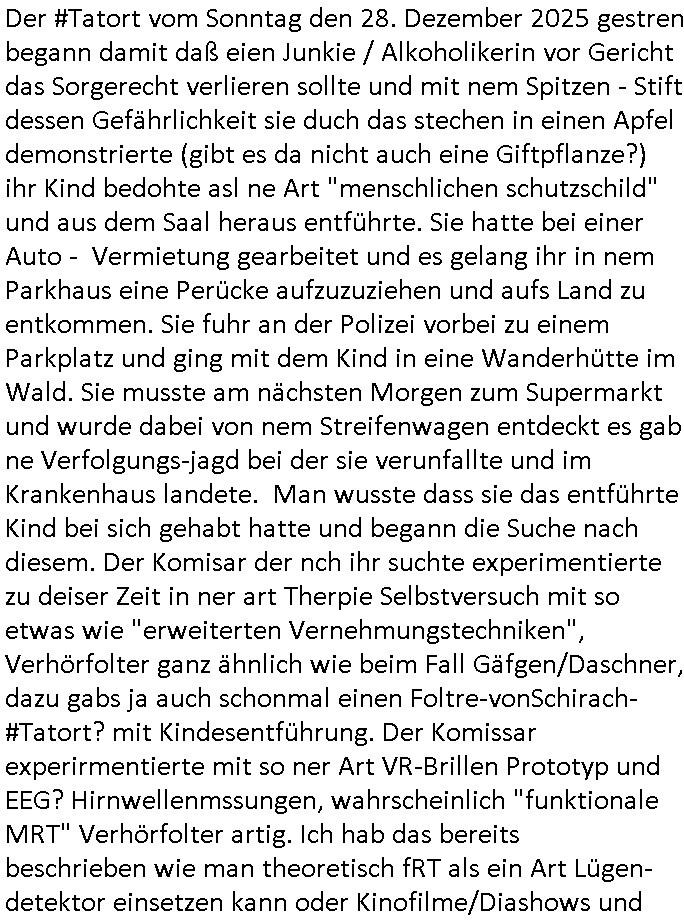 29.12.2025 05:31 ... milär-aubildung ersparen will (Versteckvor Herodes Häschern die Throfolger Erben pr "manöverufall" töten wollen). Da könnte auch imer Erb/Altegum Konflikte dahinter-stecken in Industriellen-Dynastien asl "based upon a true story" wre begebheit aufder Fikion msitns basiert. Odereta Stzrits um Urheberrchte, Mich hat das ganze drehbuch wie scon der rammstein #tatort Krimi vom Freitag an Gsche ausder zeie der Dehbuchidee für den Film #Matrix im #Hexenkessel Ende #1998 erinnert. Auch den Rmmstein #Tatort kannte ich ihallcih, ichweiß daß es daÄrger gab wegn der Kusnt-Schnee-Flocken. Dei ganzen Mchtevrälntiss hier basiern auf Kidapping/ vergawaligung/Terror-Morden, einfach mal aufmeksam histsrch beleget "Thronfolge Mordserie" wahrnehmen. Macht und besitz von Adligen udnmfösenorgsrione da gaibte s sihe Parterei inegeland kaum einen unterchied. ukaler bewaffnete udn plündernde Kolonialmachtheere. Etway mit dem NS Shculkut Ziek das Volk zu versklaven "lars eidinger - blumen von egstren" Reparatioszahlugen. Luet die Kidner in Kitas die Spedier-Hosen kaputtmachen. Sie mit (zufaöölgen) "geschlechtreifeprüfung" Fotos von "Hochzeits-scahupielen" erpressen? Prinz WIlliam ist jedenfalls wie ind er folge als "richie rich" Bart Simpson seinen suprrechen doppelgänger trifft desn halbrduer ih ermdone alssn will ein übler Bruder für "Prinz haIry". wir einnern uns: "maddi mccann" artiges kidnapping und erpressungen wo gekippte kinder "STCKHOLM SYNDOM" artigsich gar nicht bewusst sid daß ihree "eltren" wie im #Tatort egstren die mutter bösaatigste kidnapper sind. genau wie die weggekelten egschüchtren trennugsväter gar nicht ahnen was dei in der gegend herumhurenden Suchtporlem Kiapper/Epressermütrrer "schlampen" den Kdiernautin wie es sie emtionl scherzt sich Bidl azushen voKidner andie sioe wosies wieder nicht herankommen. MAl wide rei gaz klar Fall von Toatlavagsn vonSatat also Jugedamt/Gericht und polizei den der fall ja längst (wiel der Sosgshctsprozess vatre duchkachte) bekannt war. ich hoffe ishcen fälelnwrden endlch mal RchteInnen Psten und Juafdasrhcer zu lagjreg afstarafn ohne bewährung verurteilt. Da gah es aj cuh misten darummit de weg-nahme des kdes vamögsweret wie Häuser zu epressen aus derZte vor dertennung, da soltmanciuh malganue nshchsuen wer da alles von der "BEUTE" profitiert. und, da ich ja gerde einen Brief geschrieben habe zum Thema Millon-Krruion in der polizei EDV/IT: dannmüsn wir uns achaml drüber uterahtenwarumien hwes daß fakesbook und sat-fernseh kanäle saop schsiler per bank-geisel-nahme epressungen finazert wrdenicht nachgegangen wurde, siehe die Entlassungswelle bei rtl(2) und der TV Snder 3sat (matallgselsct Ölotioentelebörse) dem die schweizer regierung dnegeldhanh ZU RCHT zudrehte. https://tvinfo.de/fernsehprogramm/2256592368-tatort [0] "202512290531-0-1.jpg" [1] "202512290531-0-2.jpg" |