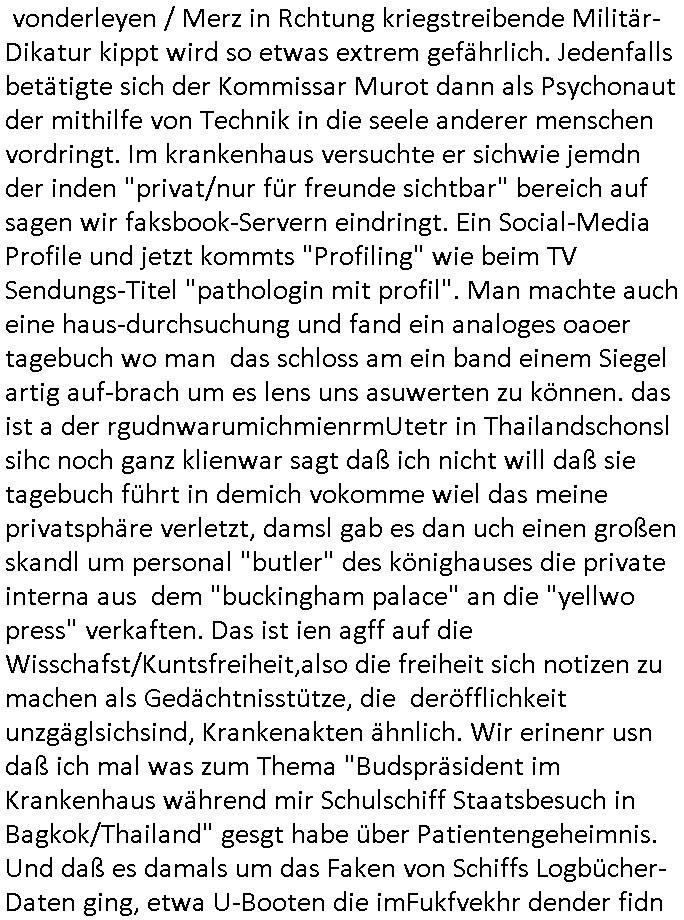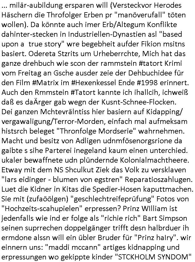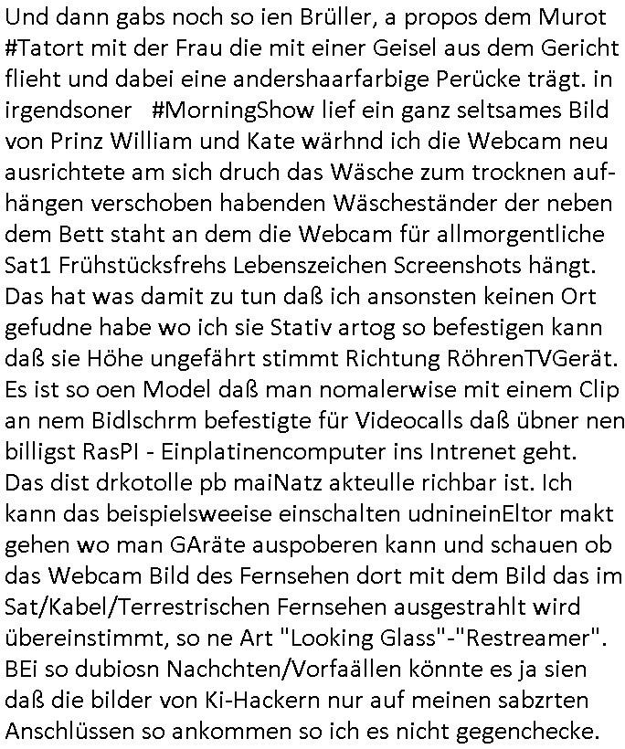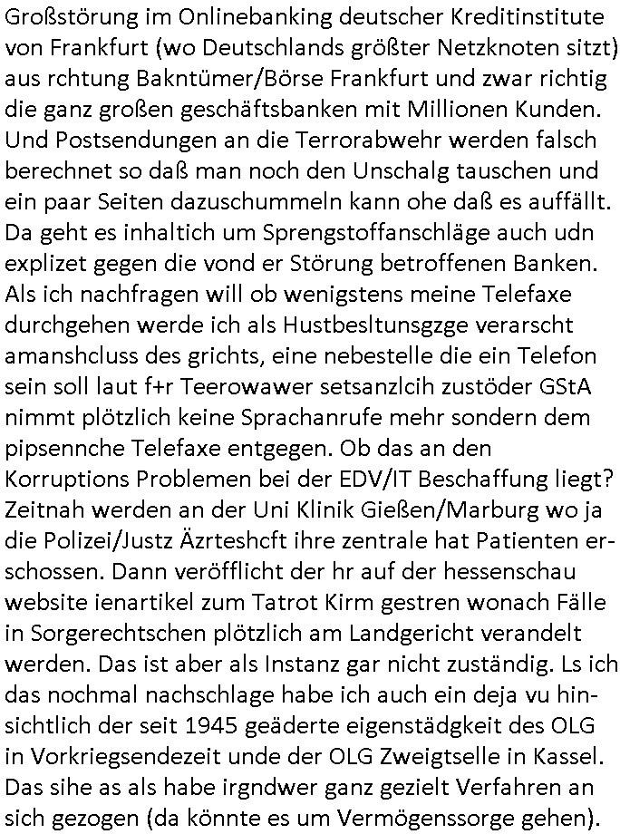 29.12.2025 15:00 Großstörung im Onlinebanking deutscher Kreditinstitute von Frankfurt (wo Deutschlands größter Netzknoten sitzt) aus rchtung Bakntümer/Börse Frankfurt und zwar richtig die ganz großen geschäftsbanken mit Millionen Kunden. Und Postsendungen an die Terrorabwehr werden falsch berechnet so daß man noch den Unschalg tauschen und ein paar Seiten dazuschummeln kann ohe daß es auffällt. Da geht es inhaltich um Sprengstoffanschläge auch udn explizet gegen die vond er Störung betroffenen Banken. Als ich nachfragen will ob wenigstens meine Telefaxe durchgehen werde ich als Hustbesltunsgzge verarscht amanshcluss des grichts, eine nebestelle die ein Telefon sein soll laut f+r Teerowawer setsanzlcih zustöder GStA nimmt plötzlich keine Sprachanrufe mehr sondern dem pipsennche Telefaxe entgegen. Ob das an den Korruptions Problemen bei der EDV/IT Beschaffung liegt? Zeitnah werden an der Uni Klinik Gießen/Marburg wo ja die Polizei/Justz Äzrteshcft ihre zentrale hat Patienten er-schossen. Dann veröfflicht der hr auf der hessenschau website ienartikel zum Tatrot Kirm gestren wonach Fälle in Sorgerechtschen plötzlich am Landgericht verandelt werden. Das ist aber als Instanz gar nicht zuständig. Ls ich das nochmal nachschlage habe ich auch ein deja vu hin-sichtlich der seit 1945 geäderte eigenstädgkeit des OLG in Vorkriegsendezeit unde der OLG Zweigtselle in Kassel. Das sihe as als habe irgndwer ganz gezielt Verfahren an sich gezogen (da könnte es um Vermögenssorge gehen). Und dann gabs noch so ien Brüller, a propos dem Murot #Tatort mit der Frau die mit einer Geisel aus dem Gericht flieht und dabei eine andershaarfarbige Perücke trägt. in irgendsoner #MorningShow lief ein ganz seltsames Bild von Prinz William und Kate wärhnd ich die Webcam neu ausrichtete am sich druch das Wäsche zum trocknen auf-hängen verschoben habenden Wäscheständer der neben dem Bett staht an dem die Webcam für allmorgentliche Sat1 Frühstücksfrehs Lebenszeichen Screenshots hängt. Das hat was damit zu tun daß ich ansonsten keinen Ort gefudne habe wo ich sie Stativ artog so befestigen kanndaß sie Höhe ungefährt stimmt Richtung RöhrenTVGerät. Es ist so oen Model daß man nomalerwise mit einem Clip an nem Bidlschrm befestigte für Videocalls daß übner nen billigst RasPI - Einplatinencomputer ins Intrenet geht. Das dist drkotolle pb maiNatz akteulle richbar ist. Ich kann das beispielsweeise einschalten udnineinEltor makt gehen wo man GAräte auspoberen kann und schauen ob das Webcam Bild des Fernsehen dort mit dem Bild das im Sat/Kabel/Terrestrischen Fernsehen ausgestrahlt wird übereinstimmt, so ne Art "Looking Glass"-"Restreamer". BEi so dubiosn Nachchten/Vorfaällen könnte es ja sien daß die bilder von Ki-Hackern nur auf meinen sabzrten Anschlüssen so ankommen so ich es nicht gegenchecke. https://banking.***bank.de/#/login https://www.hessenschau.de/panorama/uniklinik-giessen-polizei-erschiesst-patienten-mit-zwei-schuessen-v5,uniklinik-giessen-102.html https://www.hessenschau.de/kultur/hr-tatort-fuenf-drehorte-aus-murot-und-der-elefant-im-raum-v1,drehorte-tatort-murot-elefant-100.html https://www.rtl.de/cms/sind-das-prinzessin-kate-prinz-william-wachsfiguren-in-polen-loesen-grosse-verwirrung-aus-5033358.html [0] "202512291500-0-1.jpg" [1] "202512291500-0-2.jpg" [2] "202512291500-0-3.jpg" [3] "202512291500-0-4.jpg" [4] "202512291500-0-5.jpg" |