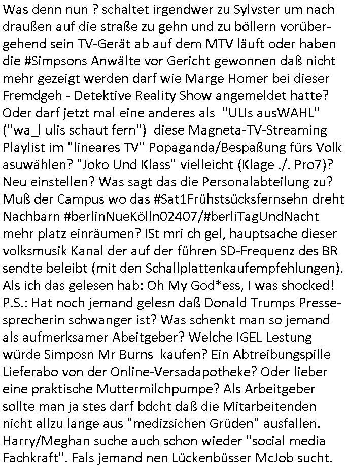 29.12.2025 17:00 Was denn nun ? schaltet irgendwer zu Sylvster um nach draußen auf die straße zu gehn und zu böllern vorüber-gehend sein TV-Gerät ab auf dem MTV läuft oder haben die #Simpsons Anwälte vor Gericht gewonnen daß nicht mehr gezeigt werden darf wie Marge Homer bei dieser Fremdgeh - Detektive Reality Show angemeldet hatte? Oder darf jetzt mal eine anderes als "ULIs ausWAHL" ("wa_l ulis schaut fern") diese Magneta-TV-Streaming Playlist im "lineares TV" Popaganda/Bespaßung fürs Volk asuwählen? "Joko Und Klass" vielleicht (Klage ./. Pro7)? Neu einstellen? Was sagt das die Personalabteilung zu? Muß der Campus wo das #Sat1Frühstsücksfernsehn dreht Nachbarn #berlinNueKölln02407/#berliTagUndNacht mehr platz einräumen? ISt mri ch gel, hauptsache dieser volksmusik Kanal der auf der führen SD-Frequenz des BR sendte beleibt (mit den Schallplattenkaufempfehlungen). Als ich das gelesen hab: Oh My God*ess, I was shocked! P.S.: Hat noch jemand gelesn daß Donald Trumps Presse-sprecherin schwanger ist? Was schenkt man so jemand als aufmerksamer Abeitgeber? Welche IGEL Lestung würde Simposn Mr Burns kaufen? Ein Abtreibungspille Lieferabo von der Online-Versadapotheke? Oder lieber eine praktische Muttermilchpumpe? Als Arbeitgeber sollte man ja stes darf bdcht daß die Mitarbeitenden nicht allzu lange aus "medizsichen Grüden" ausfallen. Harry/Meghan suche auch schon wieder "social media Fachkraft". Fals jemand nen Lückenbüsser McJob sucht. https://www.digitalfernsehen.de/news/inhalte/fernsehen/achtung-fake-news-warum-mtv-nicht-eingestellt-wird-1168921/ https://www.derstandard.at/story/3000000302243/streaming-killed-the-video-star-mtv-stellt-musikkanaele-ein https://www.bild.de/unterhaltung/tv-fernsehformate/das-ende-eines-kultsenders-mtv-wird-zum-jahresende-abgeschaltet-695227a2f6fc544dba9b61f5 https://www.bild.de/politik/ausland-und-internationales/weihnachtswunder-im-weissen-haus-trump-sprecherin-ist-wieder-schwanger-694eebd2ba368aa0126a3fd0 https://www.bild.de/unterhaltung/stars-und-leute/meghan-und-harry-verlieren-elften-pr-profi-in-nur-fuenf-jahren-69500f29ba368aa0126a49e0 Wasn los? Keine "Negermusik" mehr im freeTV? Das gibt Krieg! https://www.telekom.com/de/medien/medieninformationen/detail/magentatv-begeistert-mit-netflix-hit-stranger-things-1099512 [0] "202512291700-0-1.jpg" [1] "202512291700-0-2.jpg" [2] "202512291700-0-3.jpg" [3] "202512291700-0-4.jpg" |