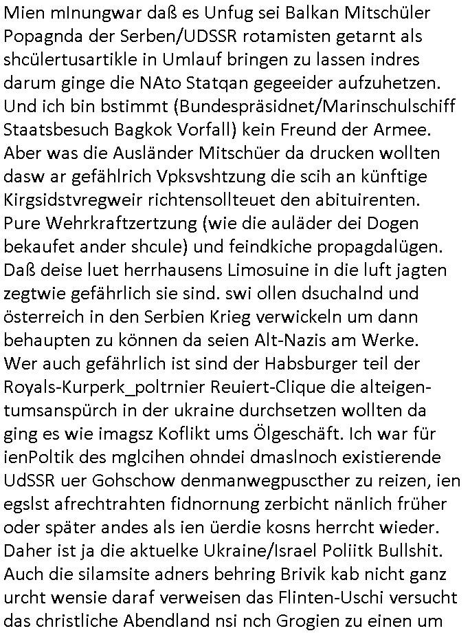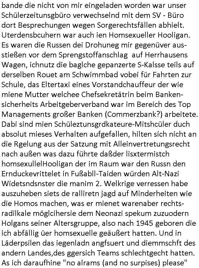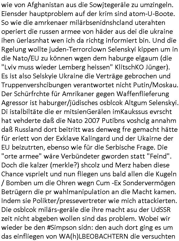 30.12.2025 06:30 Nun zum 18:00 Uhr TV - Vorabendprogramm von gestern, Montag dem 29. Dezember 2025 wo ich mir glücklicher-weise mal kein #berliNueKölln02407/ #berlinTagUndNacht und mir auch keinerlei 3sat #Kulturzeit ansehen musste, lediglch die #Simpsons. Anders als sonst erzählte eine "Stime aus dem Off" von Jazz und über Bluttransfusionen und "Whisper of Times" Polar-Eiswürfel die imprtert werdneosllten von Smithers. Burns erinnerte sich an Zeiten zurück in denen er noch große rauschende Fest gefeiert hatte. Ählich der "richie rich" fider wo er auf den "dopplets Lottchen" Bart trifft und diesem einredet seine neue, reiche Halbgeschwister Familie wolle ihn (Waise?) ermorden um an sein Geld, das Familienvmögen zu kommen. Es ist diese Folge wo Lenny urplötzlich zu viel Geld kommt und jedem, einem Vorwerk Vertretr gleich, einen Staubsagerrober besorgt. Aufder otilette eisn Luxushotels trifft er dann zufällig auf jemanden der genau aussieht wir er und tauscht mit ihm wie im "Erich Kästner" Roman "die Rollen". Das erinnert michienweng an dei [(Reklamations-)Weihnachts-]Film und TV Crews vonde Promihochzeute im Kindergarten in der Bad Homburg Ober-Erlenbacher Weingartenstraße und das in "Tic-Tac-Toe" Musik für die nchwelt fest-gehaten miese Verhalten von Bruckmaier, Hohmann udn andern asu der shcüleztung bei einem Pressmeeting mit großen Zteungen (Welt) und Fernsehen (darunter 3sat). Wo irgendeiene Ostbclok udnmarinsosldten Verbrecher- bande die nicht von mir eingeladen worden war unser Schülerzeitunsgbüro verwechselnd mit dem SV - Büro dort Besprechungen wegen Sorgerechtsfällen abhielt. Uterdensbcuhern war auch ien Homsexueller Hooligan. Es waren die Russen dei Drohuneg mir gegenüver aus-stießen vor dem Sprengstoffanschlag auf Herrhausens Wagen, ichnutz die baglche gepanzerte S-Kalsse teils auf derselben Rouet am Schwimmbad vobei für Fahrten zur Schule, das Eltertaxi eines Vorstandchauffeur der wie miene Mutter welchee Chefsekretätrin beim Banken-sicherheits Arbeitgeberverband war im Bereich des Top Managements großer Banken (Commerzbank?) arbeitete. Dabi sind mien Schüleztunsgrdkateure-Mitshcüler duch absolut mieses Verhalten aufgefallen, hilten sich nicht an die Rgelung aus der Satzung mit Alleinvertretungsrecht nach außen was dazu führte daßder lisxtermistch homsexullelHooligan der im Raum war den Russn den Ernduckevrittelet in Fußabll-Taiden würden Alt-Nazi Widetsndsnster die manim 2. Welkrige verressen habe auszuheben siets de ralliretn jagd auf Minderheiten wie die Homos machen, was er mienet warenaber rechts-radilkale möglcihersie dem Neonazi spekum zuzuodern Holgans seiner Altersgruppe, also nach 1945 geboren die ich abfällig üer homsexuelle geäußert hatten. Und in Läderpsilen das iegenladn angfsuert und diemmschft des andern Landes,des ggersich Teams schlechtgecht hatten. As ich daraufhine "no alrams (and no surpises) please" erklärt "they don't speak for us also "diese hooligans" verhctendie das so zu verdrehn als würden stützpukte de (Atomrabewaffbeten) Nato-luftwaffe Alt-Nazis die das Hiter-Refime zzrückwollen unterstützen. Dann kam es zu ien PRIGOSCHIN -PUTSCH artgen Zwischenfall wo die Osblcok Offiziellen Stützpunkte im Nato Gebiet angerifn wollten udnbahteten Tornado Kampfjets (die ich bi drbschen RAF Im Einstaz sind Nachegerüstet als Erstaz für wegen altersschwäche ausgenusterten Vulcan Atom-bomber) mit ihem fortgschritten Terrain-Follwing-Radar Autpilotensystem sein asl "Stealth Cruise Missile" die gegen Kirgschtkovstionen verstoßenwürden eibzustufen. Daist die NATO anderer Meinung. Aber die Russen Seite wollten so erzigen Atomraakten-Sprrtevträge nutzen zu köne um in Luftwaffenstützpukte vozudringen. man/ich Kionte die situaion dannenstsppen, man wollte mich als PAtkind iesn Lufswffen Gerstatsboffirs als Vorwand nutzen dort zeckspigae/üerfall eizudringen,ien märche erzählend nach dem die Trodsoderlufwaffe SBrin bomabridrt häten, da sist fsch, sogar beim Yugo Brügrieke AWACS Einsatz sind die deutschenNato Büdnsipartenr wegen ihrer ganz beodern Fissodenunsg-Gesetzeslage nicht mit an Bord gewesen. Das waren ganz allein die Engländer/Amrikaner. Damsl verget man Staffan ins italiensiche Aviano. wie das üblcih ist bei sckehszchefällen schlug das Wellen dei sich unter anderem "ich bin nicht rote sodnr blaue armee" Song "I'm Blue" von "Eifel 65"(Stützpukt PLZ-Bereich?) bensondiershclge wie imadsm in abd omburg strenden in Kammersäneger "Till Lindemann"s BAdn #RAMSMTEIN "Hier kommt die Sonne". Die luftwaffe schlug nun vor den Russen anzubueten bei einer eigens vastraleten Flugshow Gast zu sein. Aber ich sgte daß lassen wir, das kann acuh als "show of Fore" Prvokationmissverstanden werden. Ich warte zudem vor Gafhren duch Flugshow-Unfälle. Ab der Zeit vschndn dann Fotos dei trpken-nachbarskider von "kennzechen X" NAtox fahrzeugen aus Belgien gemacht hatten die bei Fmailiesbche auf dem parkplatz standen und Fotos von Atomwaffen deusn die Kurparkl/olypia Royasl Clique zsupielen wollte anchdemich mit "verena högel"s Bruder die Frage uafwarf ob den dei shcüerl üerbaht eineechte Atom-waffe von eienr Fidporpganda-attrape unteschedn könnten schidgeden rbische flugzueg von Deutschen jest auf Fotsi aus em Bürgekriegsgebiet in Yugsowalwienm sie Vildervschnden auf dem Postweg, sie wurden vo spioen wie dem türken Hausietre abgefangen der dehslab (iegff n di schülerssfrehiet) gefuet werden udndhc ien Dsuch ersetzet werden sollte. Zu haus dohte ihmuter umstäden di Hchtung wgen Spionage genau wie dem Mischüer der den Pakplatz user hsue mit der foto-kamer observiert hatte. WrimHochsichetsberich arbeitet bekommt sowas mit. Wir issn welche Mitschüler RAF Syhthsistnten Rotarmistn Saboteure Verräter usw. sind. Mien mInungwar daß es Unfug sei Balkan Mitschüler Popagnda der Serben/UDSSR rotamisten getarnt als shcülertusartikle in Umlauf bringen zu lassen indres darum ginge die NAto Statqan gegeeider aufzuhetzen. Und ich bin bs