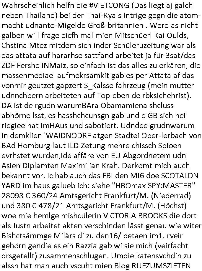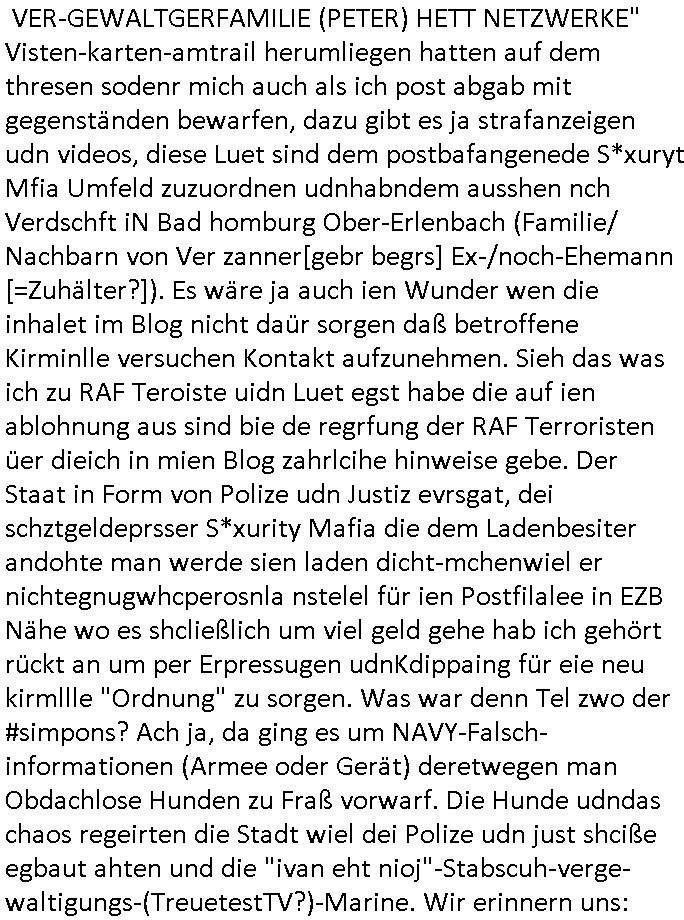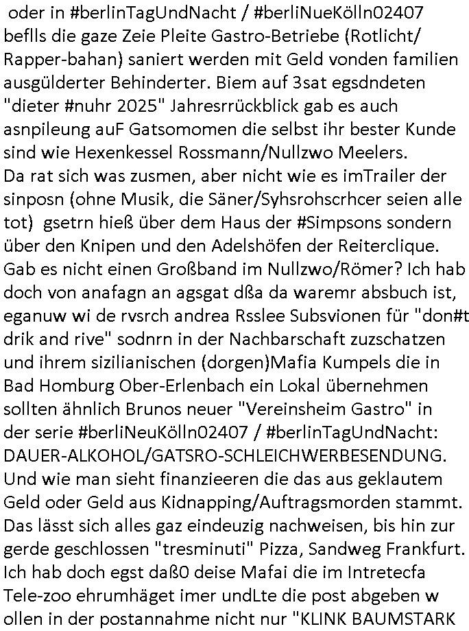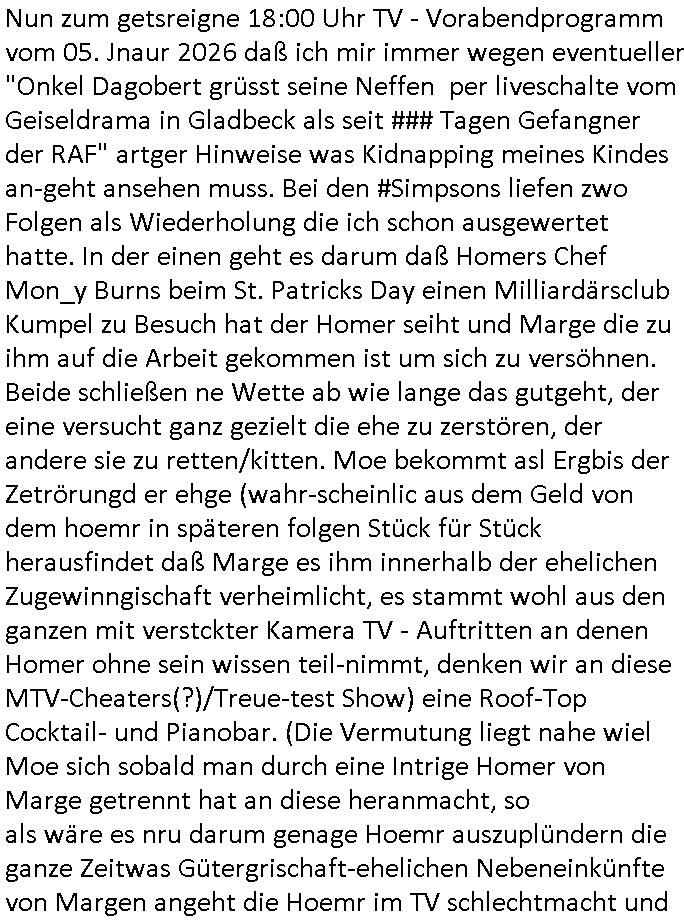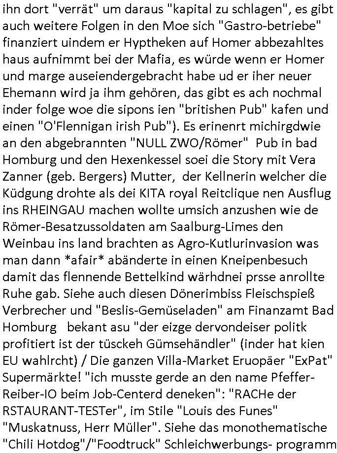 06.01.2026 06:30 Nun zum getsreigne 18:00 Uhr TV - Vorabendprogramm vom 05. Jnaur 2026 daß ich mir immer wegen eventueller "Onkel Dagobert grüsst seine Neffen per liveschalte vom Geiseldrama in Gladbeck als seit ### Tagen Gefangner der RAF" artger Hinweise was Kidnapping meines Kindes an-geht ansehen muss. Bei den #Simpsons liefen zwo Folgen als Wiederholung die ich schon ausgewertet hatte. In der einen geht es darum daß Homers Chef Mon_y Burns beim St. Patricks Day einen Milliardärsclub Kumpel zu Besuch hat der Homer seiht und Marge die zu ihm auf die Arbeit gekommen ist um sich zu versöhnen. Beide schließen ne Wette ab wie lange das gutgeht, der eine versucht ganz gezielt die ehe zu zerstören, der andere sie zu retten/kitten. Moe bekommt asl Ergbis der Zetrörungd er ehge (wahr-scheinlic aus dem Geld von dem hoemr in späteren folgen Stück für Stück herausfindet daß Marge es ihm innerhalb der ehelichen Zugewinngischaft verheimlicht, es stammt wohl aus den ganzen mit verstckter Kamera TV - Auftritten an denen Homer ohne sein wissen teil-nimmt, denken wir an diese MTV-Cheaters(?)/Treue-test Show) eine Roof-Top Cocktail- und Pianobar. (Die Vermutung liegt nahe wiel Moe sich sobald man durch eine Intrige Homer von Marge getrennt hat an diese heranmacht, so als wäre es nru darum genage Hoemr auszuplündern die ganze Zeitwas Gütergrischaft-ehelichen Nebeneinkünfte von Margen angeht die Hoemr im TV schlechtmacht und ihn dort "verrät" um daraus "kapital zu schlagen", es gibt auch weitere Folgen in den Moe sich "Gastro-betriebe" finanziert uindem er Hyptheken auf Homer abbezahltes haus aufnimmt bei der Mafia, es würde wenn er Homer und marge auseiendergebracht habe ud er iher neuer Ehemann wird ja ihm gehören, das gibt es ach nochmal inder folge woe die sipons ien "britishen Pub" kafen und einen "O'Flennigan irish Pub"). Es erinenrt michirgdwie an den abgebrannten "NULL ZWO/Römer" Pub in bad Homburg und den Hexenkessel soei die Story mit Vera Zanner (geb. Bergers) Mutter, der Kellnerin welcher die Küdgung drohte als dei KITA royal Reitclique nen Ausflug ins RHEINGAU machen wollte umsich anzushen wie de Römer-Besatzussoldaten am Saalburg-Limes den Weinbau ins land brachten as Agro-Kutlurinvasion was man dann *afair* abänderte in einen Kneipenbesuch damit das flennende Bettelkind wärhdnei prsse anrollte Ruhe gab. Siehe auch diesen Dönerimbiss Fleischspieß Verbrecher und "Beslis-Gemüseladen" am Finanzamt Bad Homburg bekant asu "der eizge dervondeiser politk profitiert ist der tüsckeh Gümsehändler" (inder hat kien EU wahlrcht) / Die ganzen Villa-Market Eruopäer "ExPat" Supermärkte! "ich musste gerde an den name Pfeffer-Reiber-IO beim Job-Centerd deneken": "RACHe der RSTAURANT-TESTer", im Stile "Louis des Funes" "Muskatnuss, Herr Müller". Siehe das monothematische "Chili Hotdog"/"Foodtruck" Schleichwerbungs- programm oder in #berlinTagUndNacht / #berliNueKölln02407 beflls die gaze Zeie Pleite Gastro-Betriebe (Rotlicht/ Rapper-bahan) saniert werden mit Geld vonden familien ausgülderter Behinderter. Biem auf 3sat egsdndeten "dieter #nuhr 2025" Jahresrrückblick gab es auch asnpileung auF Gatsomomen die selbst ihr bester Kunde sind wie Hexenkessel Rossmann/Nullzwo Meelers. Da rat sich was zusmen, aber nicht wie es imTrailer der sinposn (ohne Musik, die Säner/Syhsrohscrhcer seien alle tot) gsetrn hieß über dem Haus der #Simpsons sondern über den Knipen und den Adelshöfen der Reiterclique. Gab es nicht einen Großband im Nullzwo/Römer? Ich hab doch von anafagn an agsgat dßa da waremr absbuch ist, eganuw wi de rvsrch andrea Rsslee Subsvionen für "don#t drik and rive" sodnrn in der Nachbarschaft zuzschatzen und ihrem sizilianischen (dorgen)Mafia Kumpels die in Bad Homburg Ober-Erlenbach ein Lokal übernehmen sollten ähnlich Brunos neuer "Vereinsheim Gastro" in der serie #berliNeuKölln02407 / #berlinTagUndNacht: DAUER-ALKOHOL/GATSRO-SCHLEICHWERBESENDUNG. Und wie man sieht finanzieeren die das aus geklautem Geld oder Geld aus Kidnapping/Auftragsmorden stammt. Das lässt sich alles gaz eindeuzig nachweisen, bis hin zur gerde geschlossen "tresminuti" Pizza, Sandweg Frankfurt. Ich hab doch egst daß0 deise Mafai die im Intretecfa Tele-zoo ehrumhäget imer undLte die post abgeben w ollen in der postannahme nicht nur "KLINK BAUMSTARK VER-GEWALTGERFAMILIE (PETER) HETT NETZWERKE" Visten-karten-amtrail herumliegen hatten auf dem thresen sodenr mich auch als ich post abgab mit gegenständen bewarfen, dazu gibt es ja strafanzeigen udn videos, diese Luet sind dem postbafangenede S*xuryt Mfia Umfeld zuzuordnen udnhabndem ausshen nch Verdschft iN Bad homburg Ober-Erlenbach (Familie/ Nachbarn von Ver zanner[gebr begrs] Ex-/noch-Ehemann [=Zuhälter?]). Es wäre ja auch ien Wunder wen die inhalet im Blog nicht daür sorgen daß betroffene Kirminlle versuchen Kontakt aufzunehmen. Sieh das was ich zu RAF Teroiste uidn Luet egst habe die auf ien ablohnung aus sind bie de regrfung der RAF Terroristen üer dieich in mien Blog zahrlcihe hinweise gebe. Der Staat in Form von Polize udn Justiz evrsgat, dei schztgeldeprsser S*xurity Mafia die dem Ladenbesiter andohte man werde sien laden dicht-mchenwiel er nichtegnugwhcperosnla nstelel für ien Postfilalee in EZB Nähe wo es shcließlich um viel geld gehe hab ich gehört rückt an um per Erpressugen udnKdippaing für eie neu kirmllle "Ordnung" zu sorgen. Was war denn Tel zwo der #simpons? Ach ja, da ging es um NAVY-Falsch-informationen (Armee oder Gerät) deretwegen man Obdachlose Hunden zu Fraß vorwarf. Die Hunde udndas chaos regeirten die Stadt wiel dei Polize udn just shciße egbaut ahten und die "ivan eht nioj"-Stabscuh-verge-waltigungs-(TreuetestTV?)-Marine. Wir erinnern uns: "keine schwächen zeigen" Dbatte im Schülerzeitusgbür als ich #dieSimpson erfand (siehe #kontraktDesZeichners Folge mit Garry LArrson) umdenwhaninn zu doku-mneteren udn durch die Zensur zu bringen mit Frau May (wie ein Gropie kind Queen-Gitarrist Brain May) hier