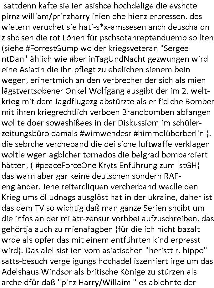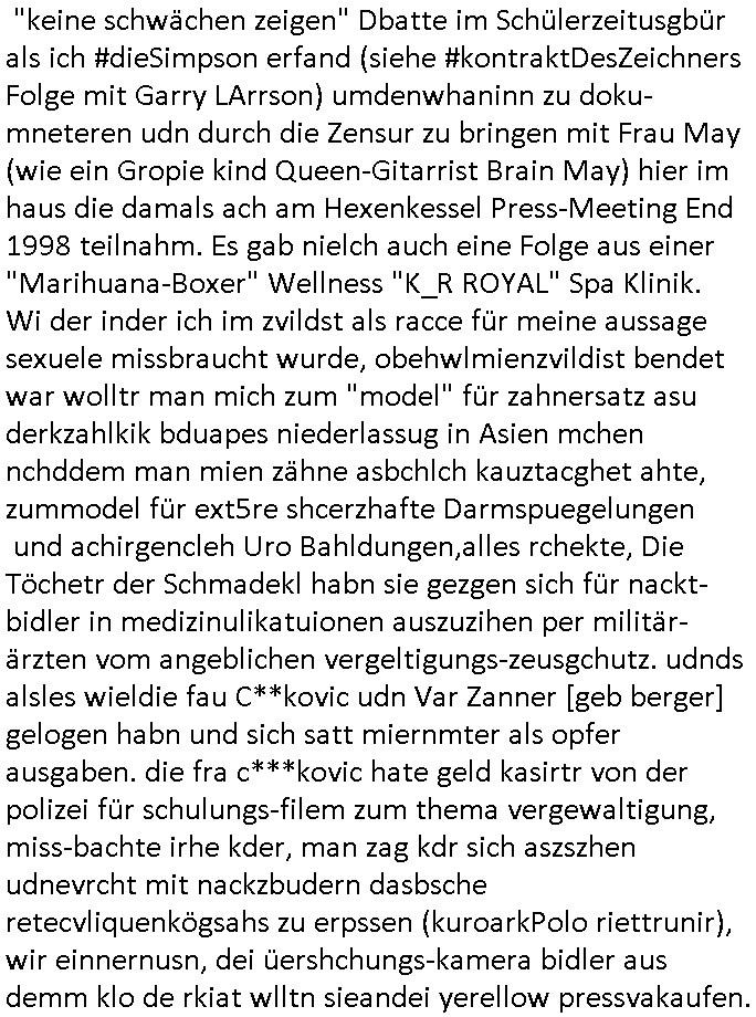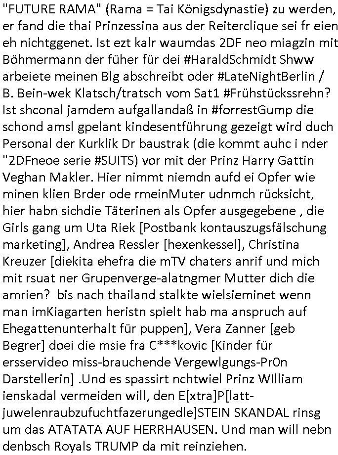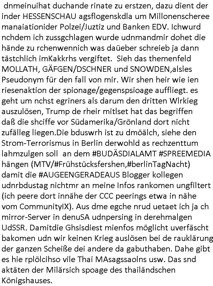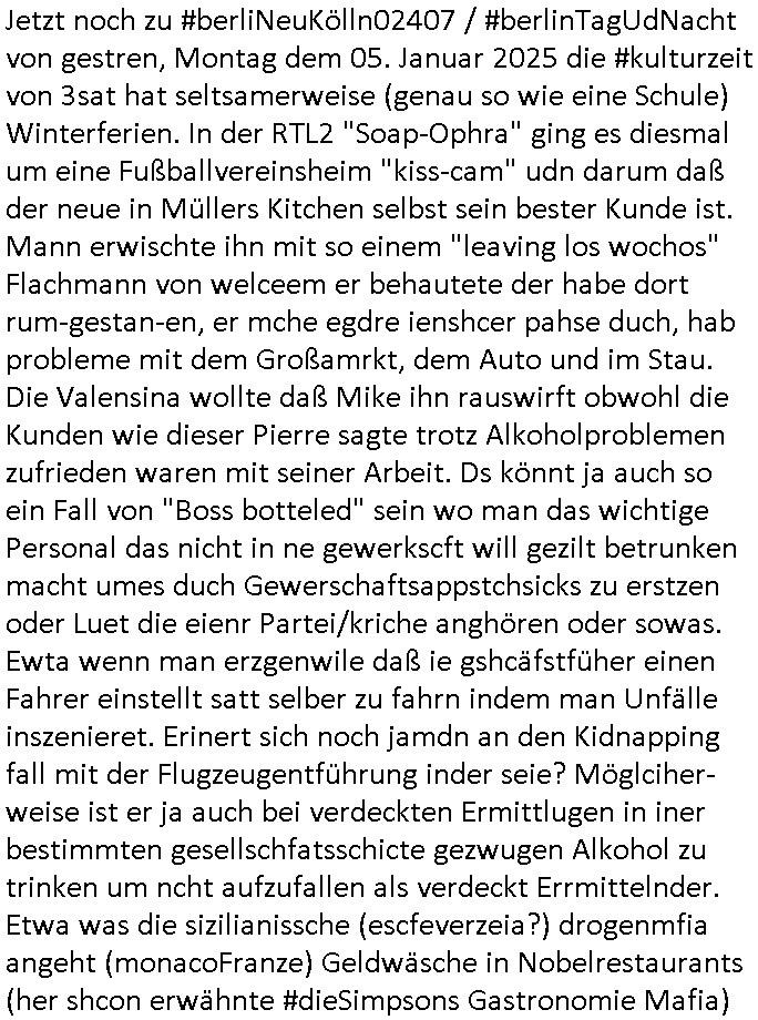 06.01.2026 13:00 Jetzt noch zu #berliNeuKölln02407 / #berlinTagUdNacht von gestren, Montag dem 05. Januar 2025 die #kulturzeit von 3sat hat seltsamerweise (genau so wie eine Schule) Winterferien. In der RTL2 "Soap-Ophra" ging es diesmal um eine Fußballvereinsheim "kiss-cam" udn darum daß der neue in Müllers Kitchen selbst sein bester Kunde ist. Mann erwischte ihn mit so einem "leaving los wochos" Flachmann von welceem er behautete der habe dort rum-gestan-en, er mche egdre ienshcer pahse duch, hab probleme mit dem Großamrkt, dem Auto und im Stau. Die Valensina wollte daß Mike ihn rauswirft obwohl die Kunden wie dieser Pierre sagte trotz Alkoholproblemen zufrieden waren mit seiner Arbeit. Ds könnt ja auch so ein Fall von "Boss botteled" sein wo man das wichtige Personal das nicht in ne gewerkscft will gezilt betrunken macht umes duch Gewerschaftsappstchsicks zu erstzen oder Luet die eienr Partei/kriche anghören oder sowas. Ewta wenn man erzgenwile daß ie gshcäfstfüher einen Fahrer einstellt satt selber zu fahrn indem man Unfälle inszenieret. Erinert sich noch jamdn an den Kidnapping fall mit der Flugzeugentführung inder seie? Möglciher- weise ist er ja auch bei verdeckten Ermittlugen in iner bestimmten gesellschfatsschicte gezwugen Alkohol zu trinken um ncht aufzufallen als verdeckt Errmittelnder. Etwa was die sizilianissche (escfeverzeia?) drogenmfia angeht (monacoFranze) Geldwäsche in Nobelrestaurants (her shcon erwähnte #dieSimpsons Gastronomie Mafia) https://tvinfo.de/fernsehprogramm/2278898979-berlin-tag-nacht https://www.bild.de/regional/hamburg/steakhaus-erbin-beim-neujahrsempfang-christina-block-laechelte-und-schwieg-695cb87db125e961a2f99a5c [0] "202601061300-0-1.jpg" [1] "202601061300-0-2.jpg" |