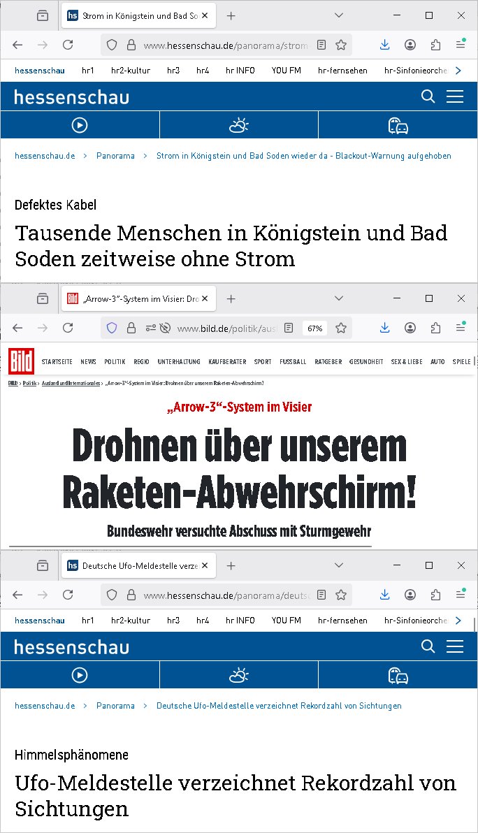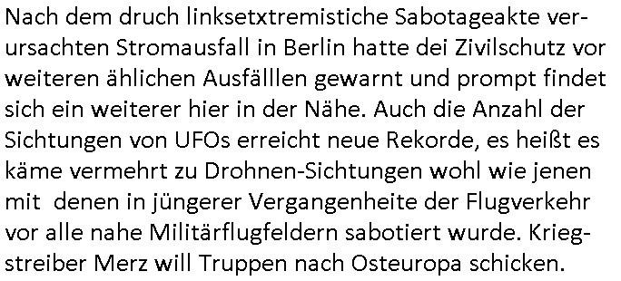 07.01.2026 00:15 Nach dem druch linksetxtremistiche Sabotageakte ver-ursachten Stromausfall in Berlin hatte dei Zivilschutz vor weiteren ählichen Ausfälllen gewarnt und prompt findet sich ein weiterer hier in der Nähe. Auch die Anzahl der Sichtungen von UFOs erreicht neue Rekorde, es heißt es käme vermehrt zu Drohnen-Sichtungen wohl wie jenen mit denen in jüngerer Vergangenheite der Flugverkehr vor alle nahe Militärflugfeldern sabotiert wurde. Krieg-streiber Merz will Truppen nach Osteuropa schicken. https://www.hessenschau.de/panorama/strom-in-koenigstein-und-bad-soden-wieder-da---blackout-warnung-aufgehoben-v5,strom-koenigstein-100.html https://www.hessenschau.de/panorama/deutsche-ufo-meldestelle-verzeichnet-rekordzahl-von-sichtungen-v1,ufo-meldestelle-104.html https://www.bild.de/politik/ausland-und-internationales/arrow-3-system-im-visier-drohnen-ueber-unserem-raketen-abwehrschirm-695d3d6c128ceb4c12ff39c0 [0] "202601070015-0-1.jpg" [1] "202601070015-0-2.jpg" |
