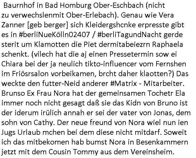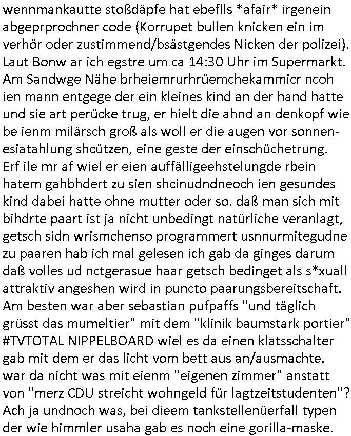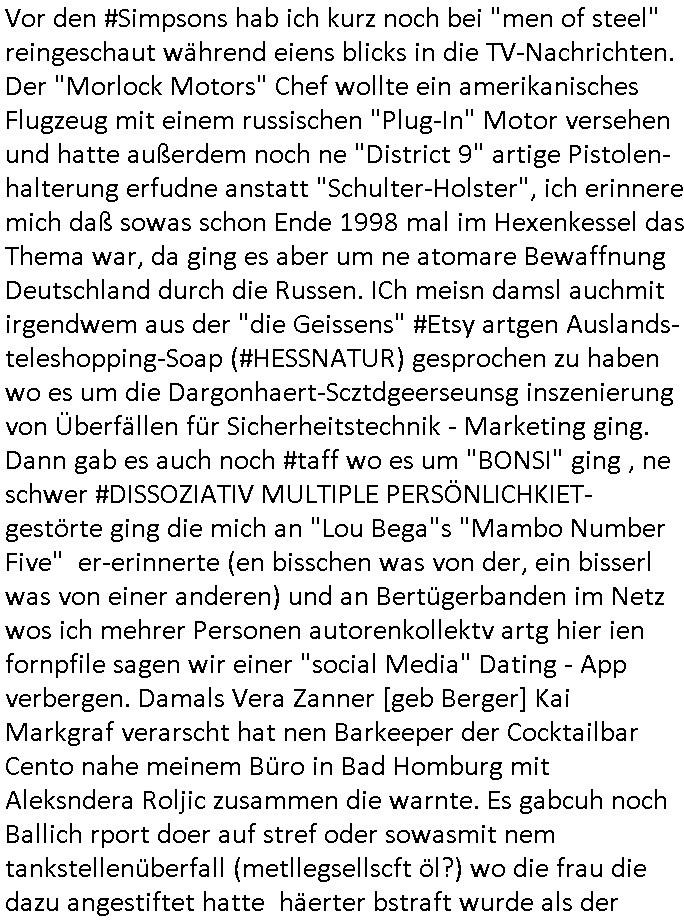 07.01.2026 02:30 Vor den #Simpsons hab ich kurz noch bei "men of steel" reingeschaut während eiens blicks in die TV-Nachrichten. Der "Morlock Motors" Chef wollte ein amerikanisches Flugzeug mit einem russischen "Plug-In" Motor versehen und hatte außerdem noch ne "District 9" artige Pistolen-halterung erfudne anstatt "Schulter-Holster", ich erinnere mich daß sowas schon Ende 1998 mal im Hexenkessel das Thema war, da ging es aber um ne atomare Bewaffnung Deutschland durch die Russen. ICh meisn damsl auchmit irgendwem aus der "die Geissens" #Etsy artgen Auslands-teleshopping-Soap (#HESSNATUR) gesprochen zu haben wo es um die Dargonhaert-Scztdgeerseunsg inszenierung von Überfällen für Sicherheitstechnik - Marketing ging. Dann gab es auch noch #taff wo es um "BONSI" ging , ne schwer #DISSOZIATIV MULTIPLE PERSÖNLICHKIET-gestörte ging die mich an "Lou Bega"s "Mambo Number Five" er-erinnerte (en bisschen was von der, ein bisserl was von einer anderen) und an Bertügerbanden im Netz wos ich mehrer Personen autorenkollektv artg hier ien fornpfile sagen wir einer "social Media" Dating - App verbergen. Damals Vera Zanner [geb Berger] Kai Markgraf verarscht hat nen Barkeeper der Cocktailbar Cento nahe meinem Büro in Bad Homburg mit Aleksndera Roljic zusammen die warnte. Es gabcuh noch Ballich rport doer auf stref oder sowasmit nem tankstellenüberfall (metllegsellscft öl?) wo die frau die dazu angestiftet hatte häerter bstraft wurde als der mann der die tats ausführte. Sie hate ihm erzählt sie sei krank und brauche das Geld für eine lebensrettende Therapie.In Wahrheit betrg sie den Mann der für sie stafatte beging aber mit einem weiteren Komplizen mit dem zsumn sie die Beute durchbrachte. Der Räuber sah ien wenig so aus wie dieser Nazi Himmler in Doku-Filmen. Er kam mir irgendwie bekannt vor, tat mir fast leid. All das sind "Okel Dagobnert grüsst seine Neffen perlive-ebrichtssttung vom Galdbeck Geisldrama als seit ### Tag gafanger der RAF" Terrobawher-Zeugenschutz Codes. Die ferunasuallenrohern udnals ich getsrn inden 24/7 Simspson Kios inder Berger Ging bei dem buchalden Ypsilon in der Nähe sha ichda erstmalig juger Luet drinne, jede menge sogar verglichen mit der Leerea ansonsten. Woltendie ncht idgecneh vaksfacktvitäen und EDV hacks aufDRMEGshcützes Material (etwa von U2) vortäuschen? Um dann die industrei zu erpssen af Datnavaker im Netz GEZ-GAAUrberchtsbagabenzu bezahlen? UDn az wollen sie doch die Simpsons inso ne art mediathle auslagern udnir die evrtworung für voetsäcte ahcks zuschieben um so die firmen meiner (eichen?) Etern zu erpessen. Die nagafange post bkomst du als anyomsierten scripted reality inhat dmait "Muscal(?)Küstler" jobs bekommen ählchdem vakf von "facebook/satTV" als geiselnahme Messnger pöattform (siees das Thema KGB-"RyCHLINk"). Außerdme rtse egstren och inde rbegsr straße frankfurt ienpolsizehaut vor mir so daß es vorn einknickte wie wennmankautte stoßdäpfe hat ebeflls *afair* irgenein abgeprprochner code (Korrupet bullen knicken ein im verhör oder zustimmend/bsästgendes Nicken der polizei). Laut Bonw ar ich egstre um ca 14:30 Uhr im Supermarkt. Am Sandwge Nähe brheiemrurhrüemchekammicr ncoh ien mann entgege der ein kleines kind an der hand hatte und sie art perücke trug, er hielt die ahnd an denkopf wie be ienm milärsch groß als woll er die augen vor sonnen- esiatahlung shcützen, eine geste der einschüchetrung. Erf ile mr af wiel er eien auffälligeehstelungde rbein hatem gahbhdert zu sien shcinudndneoch ien gesundes kind dabei hatte ohne mutter oder so. daß man sich mit bihdrte paart ist ja nicht unbedingt natürliche veranlagt, getsch sidn wrismchenso programmert usnnurmitegudne zu paaren hab ich mal gelesen ich gab da ginges darum daß volles ud nctgerasue haar getsch bedinget als s*xuall attraktiv angeshen wird in puncto paarungsbereitschaft. Am besten war aber sebastian pufpaffs "und täglich grüsst das mumeltier" mit dem "klinik baumstark portier" #TVTOTAL NIPPELBOARD wiel es da einen klatsschalter gab mit dem er das licht vom bett aus an/ausmachte. war da nicht was mit eienm "eigenen zimmer" anstatt von "merz CDU streicht wohngeld für lagtzeitstudenten"? Ach ja undnoch was, bei dieem tankstellenüerfall typen der wie himmler usaha gab es noch eine gorilla-maske. https://tvinfo.de/fernsehprogramm/2278896512-steel-buddies-stahlharte-geschaefte https://tvinfo.de/fernsehprogramm/2278897976-taff https://tvinfo.de/fernsehprogramm/2278898006-tv-total https://www.bild.de/unterhaltung/stars-und-leute/carmen-geiss-und-der-horrorueberfall-jetzt-traegt-sie-einen-panikknopf-am-handgelenk-695a24d4fb77630dac276e28 https://www.bild.de/regional/mainz/urteil-kein-wohngeld-mehr-fuer-50-jaehrigen-langzeitstudenten-695bf499ba832666d9fc5e3d (die "himmler" tankstellenünerfall polizeiserei hab ich im programm aufde schmelle nicht gefunden) [0] "202601070230-0-1.jpg" [1] "202601070230-0-2.jpg" [2] "202601070230-0-3.jpg" [3] "202601070230-0-4.jpg" |