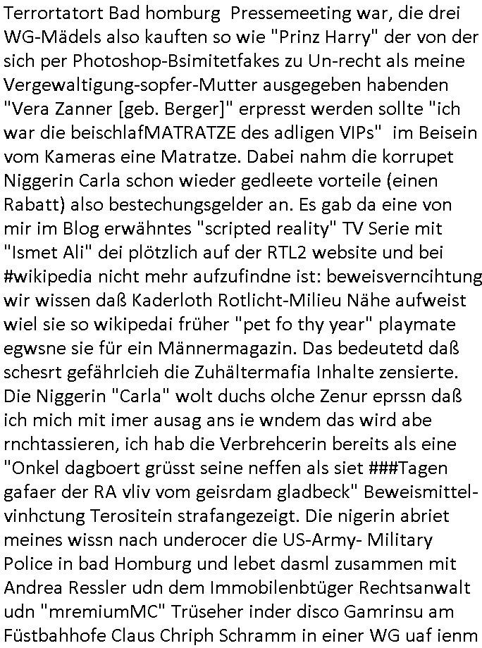 07.01.2026 09:30 Von #taff und den #Simpsons wo es in die "die böse Hexe des Westens" bei der "Einstweiligen Annäherungsverbot Verfügung" dort heißt sie "Restrainment order" für den stalkenden Schauspieler/Medienscffenden/Reporter geht von dem erklärt wird daß sich seine Figur aus mehreren andern Persönlichkeiten zusammensetzt während er ein "bitte melde dich" artiges "VHS tape" zeigt was ja genau das ist was das angeblche psychisch kranke tiktok-Starlet gestren so wiedergab im Pro7 Boulevardmagazin #taff nun zu #berlinNeuKölln02407 / #berlinTagUndNacht auf RTL2 dieser TV - Serie von gestren, dem 06. Januar 2025 . Dort gab es auch einen Inhat der aus der Schülerzeitungs-Redakion stammt vom "Prinz Harry" besuch. Das was man schon mit (drehen -Sie- sich um:) "Kader Loth" die damals entweder vor Ort war oder im Gespräche als ne "scripted reality" Rolle Besetzung war bei "Möbel Meiss" Louisenstraße 10X (gegenübee Rathaus/"alter bahnhof"/ Cento Bar) Bad Homburg Werbung für Matratzen/Betten. Siehe etwa die Bettwanzen / #MatratzenKönig Simpsons Folgen, die Mädels WG mit der Asiatin, dieser korrupten Daniee Kaltte Juwelenraub nach RAF-Sprengstoffanschlag Beweismittel-Festplattenschreddernden Polizistin und der #Matrix Kellenrein die mich vom Habitus her sehr an die angeblich bedohte schwangre Komillitonin Andrea Ressler erinerte, aus dieser Geldwäschekneipe "hexenkessel" am Untertor Bad Homburg das 3sat #Kulturzeit mitt chistian Metz mienm shcületugskollgen Terrortatort Bad homburg Pressemeeting war, die drei WG-Mädels also kauften so wie "Prinz Harry" der von der sich per Photoshop-Bsimitetfakes zu Un-recht als meine Vergewaltigung-sopfer-Mutter ausgegeben habenden "Vera Zanner [geb. Berger]" erpresst werden sollte "ich war die beischlafMATRATZE des adligen VIPs" im Beisein vom Kameras eine Matratze. Dabei nahm die korrupet Niggerin Carla schon wieder gedleete vorteile (einen Rabatt) also bestechungsgelder an. Es gab da eine von mir im Blog erwähntes "scripted reality" TV Serie mit "Ismet Ali" dei plötzlich auf der RTL2 website und bei #wikipedia nicht mehr aufzufindne ist: beweisverncihtung wir wissen daß Kaderloth Rotlicht-Milieu Nähe aufweist wiel sie so wikipedai früher "pet fo thy year" playmate egwsne sie für ein Männermagazin. Das bedeutetd daß schesrt gefährlcieh die Zuhältermafia Inhalte zensierte. Die Niggerin "Carla" wolt duchs olche Zenur eprssn daß ich mich mit imer ausag ans ie wndem das wird abe rnchtassieren, ich hab die Verbrehcerin bereits als eine "Onkel dagboert grüsst seine neffen als siet ###Tagen gafaer der RA vliv vom geisrdam gladbeck" Beweismittel-vinhctung Terositein strafangezeigt. Die nigerin abriet meines wissn nach underocer die US-Army- Military Police in bad Homburg und lebet dasml zusammen mit Andrea Ressler udn dem Immobilenbtüger Rechtsanwalt udn "mremiumMC" Trüseher inder disco Gamrinsu am Füstbahhofe Claus Chriph Schramm in einer WG uaf ienm Baurnhof in Bad Homburg Ober-Eschbach (nicht zu verwechslenmit Ober-Erlebach). Genau wie Vera Zanner [geb berger] sich Kleidergshcnke erpresste gibt es in #berliNueKölln02407 / #berliTagundNacht gerde sterit um Klamotten die Piet dermitabeiezrn Raphaela schenkt. (vilech hat die aj einen Pressetermin sow ei Chiara bei der ja neulich tikto-influencer vom Fernshen im Friösrsalon vorbeikamen, brcht daher klaotten?) Das weckte den futter-Neid anderer #Matrix - Mitarbeiter. Brunso Ex Frau Nora hat der gemeinsamen Tochetr Ela immer noch nicht gesagt daß sie das Kidn von Bruno ist der iderum irülich annah er sei der vater von Jonas, dem sohn von Cathy. Der neue freund von Nora wiel nun ien Jugs Urlaub mchen bei dem diese nicht mitdarf. Soweit ich das mitbekomen hab bumst Nora in Besenkammern jetzt mit dem Cousin Tommy aus dem Vereinsheim. https://www.joyn.de/serien/taff/2026-3-ich-bin-viele-wie-lebt-es-sich-mit-mehreren-persoenlichkeiten-in-einem-koerper https://simpsons.fandom.com/wiki/Gary_Busey_(character) https://www.youtube.com/watch?v=48Px4YvWzLA ( VHStape https://www.themoviedb.org/tv/75955-julia-leischik-sucht-bitte-melde-dich/images/posters ) https://simpsons.fandom.com/wiki/Mattress_King ( da fehlt eine RTL2 soap mit kader lothe Ismet Ali ) https://www.fernsehserien.de/kader-loth/filmografie [0] "202601070930-0-1.jpg" [1] "202601070930-0-2.jpg" [2] "202601070930-0-3.jpg" [3] "202601070930-0-4.jpg" |