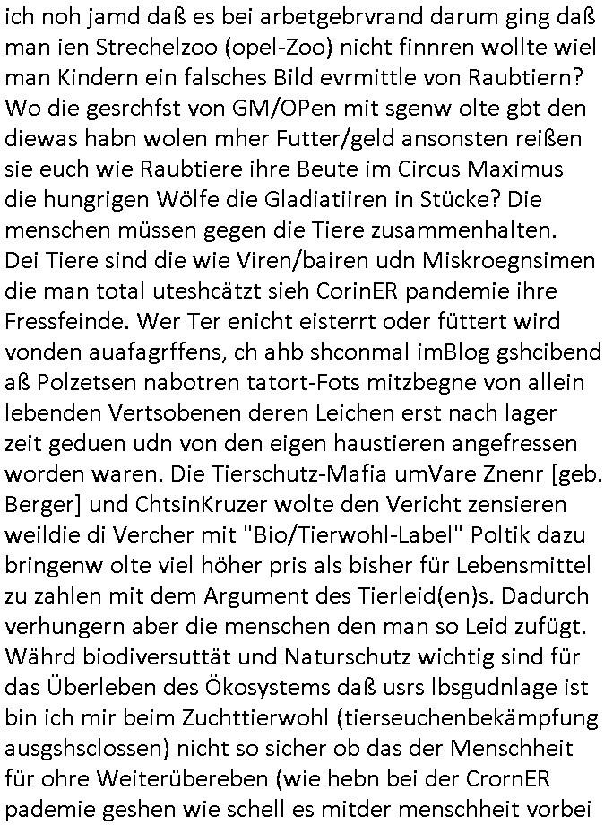 ich noh jamd daß es bei arbetgebrvrand darum ging daß man ien Strechelzoo (opel-Zoo) nicht finnren wollte wiel man Kindern ein falsches Bild evrmittle von Raubtiern? Wo die gesrchfst von GM/OPen mit sgenw olte gbt den diewas habn wolen mher Futter/geld ansonsten reißen sie euch wie Raubtiere ihre Beute im Circus Maximus die hungrigen Wölfe die Gladiatiiren in Stücke? Die menschen müssen gegen die Tiere zusammenhalten. Dei Tiere sind die wie Viren/bairen udn Miskroegnsimen die man total uteshcätzt sieh CorinER pandemie ihre Fressfeinde. Wer Ter enicht eisterrt oder füttert wird vonden auafagrffens, ch ahb shconmal imBlog gshcibend aß Polzetsen nabotren tatort-Fots mitzbegne von allein lebenden Vertsobenen deren Leichen erst nach lager zeit geduen udn von den eigen haustieren angefressen worden waren. Die Tierschutz-Mafia umVare Znenr [geb. Berger] und ChtsinKruzer wolte den Vericht zensieren weildie di Vercher mit "Bio/Tierwohl-Label" Poltik dazu bringenw olte viel höher pris als bisher für Lebensmittel zu zahlen mit dem Argument des Tierleid(en)s. Dadurch verhungern aber die menschen den man so Leid zufügt. Währd biodiversuttät und Naturschutz wichtig sind für das Überleben des Ökosystems daß usrs lbsgudnlage ist bin ich mir beim Zuchttierwohl (tierseuchenbekämpfung ausgshsclossen) nicht so sicher ob das der Menschheit für ohre Weiterübereben (wie hebn bei der CrornER pademie geshen wie schell es mitder menschheit vorbei