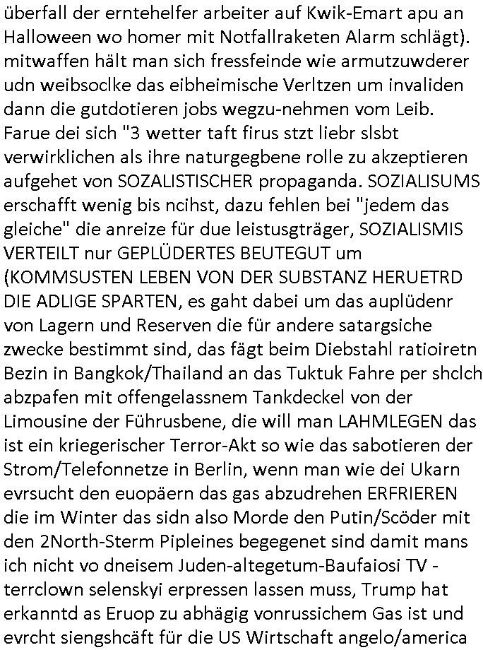 überfall der erntehelfer arbeiter auf Kwik-Emart apu an Halloween wo homer mit Notfallraketen Alarm schlägt). mitwaffen hält man sich fressfeinde wie armutzuwderer udn weibsoclke das eibheimische Verltzen um invaliden dann die gutdotieren jobs wegzu-nehmen vom Leib. Farue dei sich "3 wetter taft firus stzt liebr slsbt verwirklichen als ihre naturgegbene rolle zu akzeptieren aufgehet von SOZALISTISCHER propaganda. SOZIALISUMS erschafft wenig bis ncihst, dazu fehlen bei "jedem das gleiche" die anreize für due leistusgträger, SOZIALISMIS VERTEILT nur GEPLÜDERTES BEUTEGUT um (KOMMSUSTEN LEBEN VON DER SUBSTANZ HERUETRD DIE ADLIGE SPARTEN, es gaht dabei um das auplüdenr von Lagern und Reserven die für andere satargsiche zwecke bestimmt sind, das fägt beim Diebstahl ratioiretn Bezin in Bangkok/Thailand an das Tuktuk Fahre per shclch abzpafen mit offengelassnem Tankdeckel von der Limousine der Führusbene, die will man LAHMLEGEN das ist ein kriegerischer Terror-Akt so wie das sabotieren der Strom/Telefonnetze in Berlin, wenn man wie dei Ukarn evrsucht den euopäern das gas abzudrehen ERFRIEREN die im Winter das sidn also Morde den Putin/Scöder mit den 2North-Sterm Pipleines begegenet sind damit mans ich nicht vo dneisem Juden-altegetum-Baufaiosi TV - terrclown selenskyi erpressen lassen muss, Trump hat erkanntd as Eruop zu abhägig vonrussichem Gas ist und evrcht siengshcäft für die US Wirtschaft angelo/america