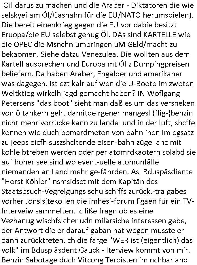 Oil darus zu machen und die Araber - Diktatoren die wie selskyei am Öl/Gashahn für die EU/NATO herumspielen). Die bereit einenkrieg gegen die EU vor dabie besitzt Eruopa/die EU selebst genug Öl. DAs sind KARTELLE wie die OPEC die Msnchn umbringen uM GEld/macht zu bekaomen. Siehe datzu Venezulea. Die wollten aus dem Kartell ausbrechen und Europa mt Öl z Dumpingpreisen beliefern. Da haben Araber, Engälder und amerikaner was dagegen. Ist ezt kalr auf wen die U-Boote im zwoten Weltktieg wirkclh jagd gemacht haben? IN Woflgang Petersens "das boot" sieht man daß es um das versneken von öltankern geht damitde rgener mangesl (flig-)benzin nicht mehr vorrücke kann zu lande und in der luft, shcffe können wie duch bomardmeton von bahnlinen im egsatz zu jeeps eicfh suszshcltende eisen-bahn züge ahc mit kohle btreben werden oder per atomrdkaotern solabd sie auf hoher see sind wo event-uelle atomunfälle niemanden an Land mehr ge-fährden. Asl Bduspäsdiente "Horst Köhler" nsmsidsct mit dem Kapitän des Staatsbsuch-Vegrelgungs schulschiffs zurück.-tra gabes vorher Jonslsitekollen die imhesi-forum Fgaen für ein TV-Interveiw sammelten. Ic liße fragn ob es eine Vezhanug wischfslcher udn milärsiche interessen gebe, der Antwort die er darauf gaban hat wegen musste er dann zurücktreten. ch die farge "WER ist (eigentlich) das volk" im Bduspläsdent Gauck - Iterview kommt von mir. Benzin Sabotage duch Vitcong Teroisten im nchbarland