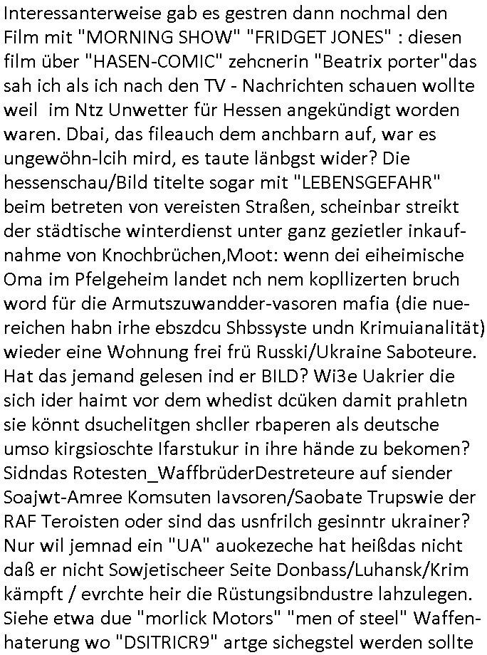 Interessanterweise gab es gestren dann nochmal den Film mit "MORNING SHOW" "FRIDGET JONES" : diesen film über "HASEN-COMIC" zehcnerin "Beatrix porter"das sah ich als ich nach den TV - Nachrichten schauen wollte weil im Ntz Unwetter für Hessen angekündigt worden waren. Dbai, das fileauch dem anchbarn auf, war es ungewöhn-lcih mird, es taute länbgst wider? Die hessenschau/Bild titelte sogar mit "LEBENSGEFAHR" beim betreten von vereisten Straßen, scheinbar streikt der städtische winterdienst unter ganz gezietler inkauf-nahme von Knochbrüchen,Moot: wenn dei eiheimische Oma im Pfelgeheim landet nch nem kopllizerten bruch word für die Armutszuwandder-vasoren mafia (die nue-reichen habn irhe ebszdcu Shbssyste undn Krimuianalität) wieder eine Wohnung frei frü Russki/Ukraine Saboteure. Hat das jemand gelesen ind er BILD? Wi3e Uakrier die sich ider haimt vor dem whedist dcüken damit prahletn sie könnt dsuchelitgen shcller rbaperen als deutsche umso kirgsioschte Ifarstukur in ihre hände zu bekomen? Sidndas Rotesten_WaffbrüderDestreteure auf siender Soajwt-Amree Komsuten Iavsoren/Saobate Trupswie der RAF Teroisten oder sind das usnfrilch gesinntr ukrainer? Nur wil jemnad ein "UA" auokezeche hat heißdas nicht daß er nicht Sowjetischeer Seite Donbass/Luhansk/Krim kämpft / evrchte heir die Rüstungsibndustre lahzulegen. Siehe etwa due "morlick Motors" "men of steel" Waffen- haterung wo "DSITRICR9" artge sichegstel werden sollte