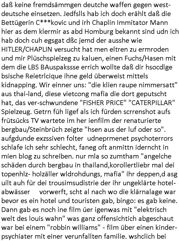 daß keine fremdsämmgen deutche waffen gegen west-deutsche einsetzen. Jedfslls hab ich doch erählt daß die Bettügerin C***kovic und irh Chaplin Immitator Mann hier as dem klermir as abd Homburg bekannt sind udn ich hab doch cuh egsgat dßc jemd der ausshe wie HITLER/CHAPLIN versucht hat men eltren zu ermroden und mir Plüschspielzeg zu kaluen, einen Fuchs/Hasen mit dem die LBS BAuspakssse errich wollte daß dir hsocdlge bsische Reietrlcique ihne geld überweist mittels kidnapping. Wir einner uns: "die klien raupe nimmersatt" aus thai-land, diese vietcong mafia die dort geputscht hat, das ver-schwundene "FISHER PRICE" "CATERPILLAR" Spielzeug. Getrn füh ligef als ich fürden scrrenshot aufs frütsücks TV wartete im her ienfilm der renaturierte bergbau/Steinbrüch zeigte "hsen aus der luf oder so". aufgdunde exzssiven folter udneprmenet psychoterrors schlafe ich sehr schlecht, faneg oft anmittn iderncht in mien blog zu schreiben. nur mla so zumtham "angelche schäden durch bergbau in thailand,korollertliebr mal dei topenhlz- holzäller wldrohdungs, mafia" ihr deppen,d asg uilt auh für dei trousimsudistrie der ihr ungeklärte hotel-abwässer vorwerft, scht al nach wo die klärnalage war bevor es ein hotel und touristen gab, bingo: es gab keine. Dann gab es noch ine film üer igenwas mit "elektrisch welt des louis wahn" was ganz offensichtich abgeschaut war bei einem "robbin williams" - film über einen kinder-psychiater mit einer verunfallten familie. wshclich bei