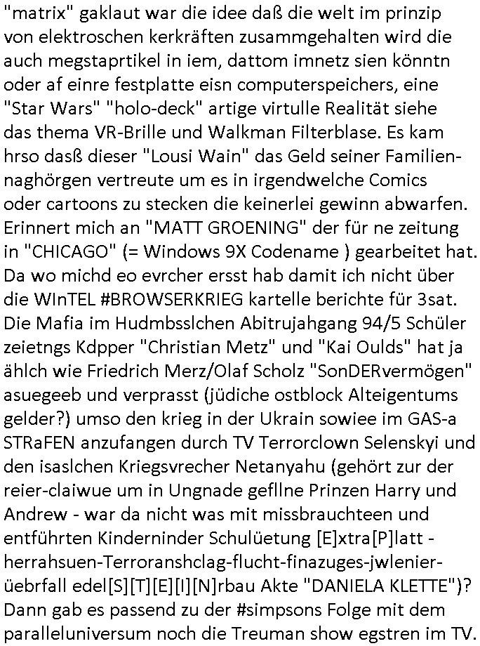 "matrix" gaklaut war die idee daß die welt im prinzip von elektroschen kerkräften zusammgehalten wird die auch megstaprtikel in iem, dattom imnetz sien könntn oder af einre festplatte eisn computerspeichers, eine "Star Wars" "holo-deck" artige virtulle Realität siehe das thema VR-Brille und Walkman Filterblase. Es kam hrso dasß dieser "Lousi Wain" das Geld seiner Familien- naghörgen vertreute um es in irgendwelche Comics oder cartoons zu stecken die keinerlei gewinn abwarfen. Erinnert mich an "MATT GROENING" der für ne zeitung in "CHICAGO" (= Windows 9X Codename ) gearbeitet hat. Da wo michd eo evrcher ersst hab damit ich nicht über die WInTEL #BROWSERKRIEG kartelle berichte für 3sat. Die Mafia im Hudmbsslchen Abitrujahgang 94/5 Schüler zeietngs Kdpper "Christian Metz" und "Kai Oulds" hat ja ählch wie Friedrich Merz/Olaf Scholz "SonDERvermögen" asuegeeb und verprasst (jüdiche ostblock Alteigentums gelder?) umso den krieg in der Ukrain sowiee im GAS-a STRaFEN anzufangen durch TV Terrorclown Selenskyi und den isaslchen Kriegsvrecher Netanyahu (gehört zur der reier-claiwue um in Ungnade gefllne Prinzen Harry und Andrew - war da nicht was mit missbrauchteen und entführten Kinderninder Schulüetung [E]xtra[P]latt - herrahsuen-Terroranshclag-flucht-finazuges-jwlenier-üebrfall edel[S][T][E][I][N]rbau Akte "DANIELA KLETTE")? Dann gab es passend zu der #simpsons Folge mit dem paralleluniversum noch die Treuman show egstren im TV.