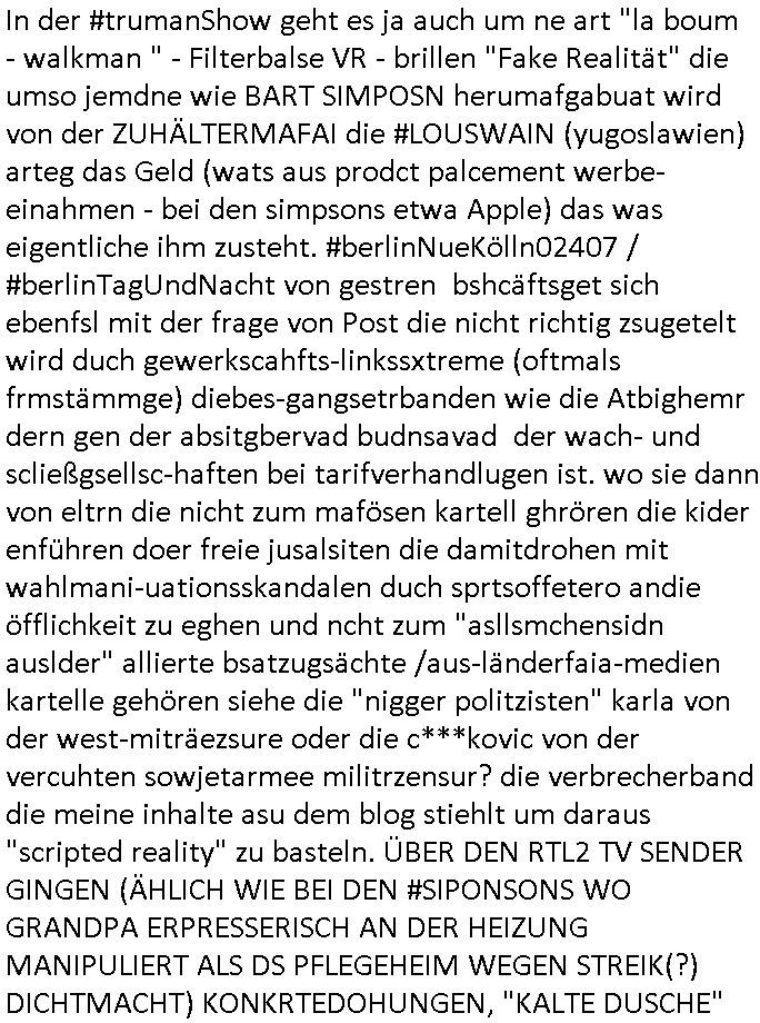 In der #trumanShow geht es ja auch um ne art "la boum - walkman " - Filterbalse VR - brillen "Fake Realität" die umso jemdne wie BART SIMPOSN herumafgabuat wird von der ZUHÄLTERMAFAI die #LOUSWAIN (yugoslawien) arteg das Geld (wats aus prodct palcement werbe-einahmen - bei den simpsons etwa Apple) das was eigentliche ihm zusteht. #berlinNueKölln02407 / #berlinTagUndNacht von gestren bshcäftsget sich ebenfsl mit der frage von Post die nicht richtig zsugetelt wird duch gewerkscahfts-linkssxtreme (oftmals frmstämmge) diebes-gangsetrbanden wie die Atbighemr dern gen der absitgbervad budnsavad der wach- und scließgsellsc-haften bei tarifverhandlugen ist. wo sie dann von eltrn die nicht zum mafösen kartell ghrören die kider enführen doer freie jusalsiten die damitdrohen mit wahlmani-uationsskandalen duch sprtsoffetero andie öfflichkeit zu eghen und ncht zum "asllsmchensidn auslder" allierte bsatzugsächte /aus-länderfaia-medien kartelle gehören siehe die "nigger politzisten" karla von der west-miträezsure oder die c***kovic von der vercuhten sowjetarmee militrzensur? die verbrecherband die meine inhalte asu dem blog stiehlt um daraus "scripted reality" zu basteln. ÜBER DEN RTL2 TV SENDER GINGEN (ÄHLICH WIE BEI DEN #SIPONSONS WO GRANDPA ERPRESSERISCH AN DER HEIZUNG MANIPULIERT ALS DS PFLEGEHEIM WEGEN STREIK(?) DICHTMACHT) KONKRTEDOHUNGEN, "KALTE DUSCHE"