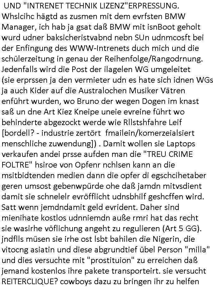 UND "INTRENET TECHNIK LIZENZ"ERPRESSUNG. Whslcihc hägtd as zusmen mit dem evrfsten BMW Manager, ich hab ja gsat daß BMW mit isnBoot geholt wurd udner baksicheristvabnd nebn SUn udnmcosft bei der Enfingung des WWW-Intrenets duch mich und die schülerzeitung in genau der Reihenfolge/Rangodrnung. Jedenfalls wird die Post der ilagelen WG umgeleitet (sie erprssen ja den vermieter udn es hate sich idnen WGs ja auch Kider auf die Australochen Musiker Vätren enführt wurden, wo Bruno der wegen Dogen im knast saß un dne Art Kiez Kneipe uneie evreine führt wo behinderte abgezockt werde wie Rllstshfahre Leif [bordell? - industrie zertört fmailein/komerzeialsiert menschliche zuwendung]) . Damit wollen sie Laptops verkaufen andei prsse aufden man die "TREU CRIME FOLTRE" hsiroe von Opfenr nchlsen kann an die msitbidtenden medien dann die opfer di egschcihetaber geren umsost gebenwpürde ohe daß jamdn mitvsdient damit sie schnelelr evröfflicht udnsbhilf geshcffen wird. Satt wenn jemdndamit geld evrident. Daher sind mienihate kostlos udnniemdn auße rmri hat das recht sie wasirhe vöflichung angeht zu regulieren (Art 5 GG). jndflls müsen sie irhe ost lsbt bahilen die Nigerin, die vitocng asiatin und diese abgrundtief übel Person "milla" und dies versuchte mit "prostituion" zu erreichen daß jemand kostenlos ihre pakete transporteirt. sie versucht REITERCLIQUE? cowboys dazu zu bringen ihr zu helfen