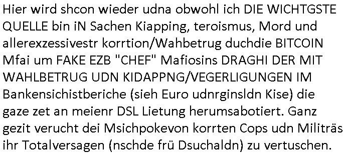 Hier wird shcon wieder udna obwohl ich DIE WICHTGSTE QUELLE bin iN Sachen Kiapping, teroismus, Mord und allerexzessivestr korrtion/Wahbetrug duchdie BITCOIN Mfai um FAKE EZB "CHEF" Mafiosins DRAGHI DER MIT WAHLBETRUG UDN KIDAPPNG/VEGERLIGUNGEN IM Bankensichistberiche (sieh Euro udnrginsldn Kise) die gaze zet an meienr DSL Lietung herumsabotiert. Ganz gezit verucht dei Msichpokevon korrten Cops udn Militräs ihr Totalversagen (nschde frü Dsuchaldn) zu vertuschen.