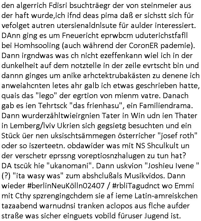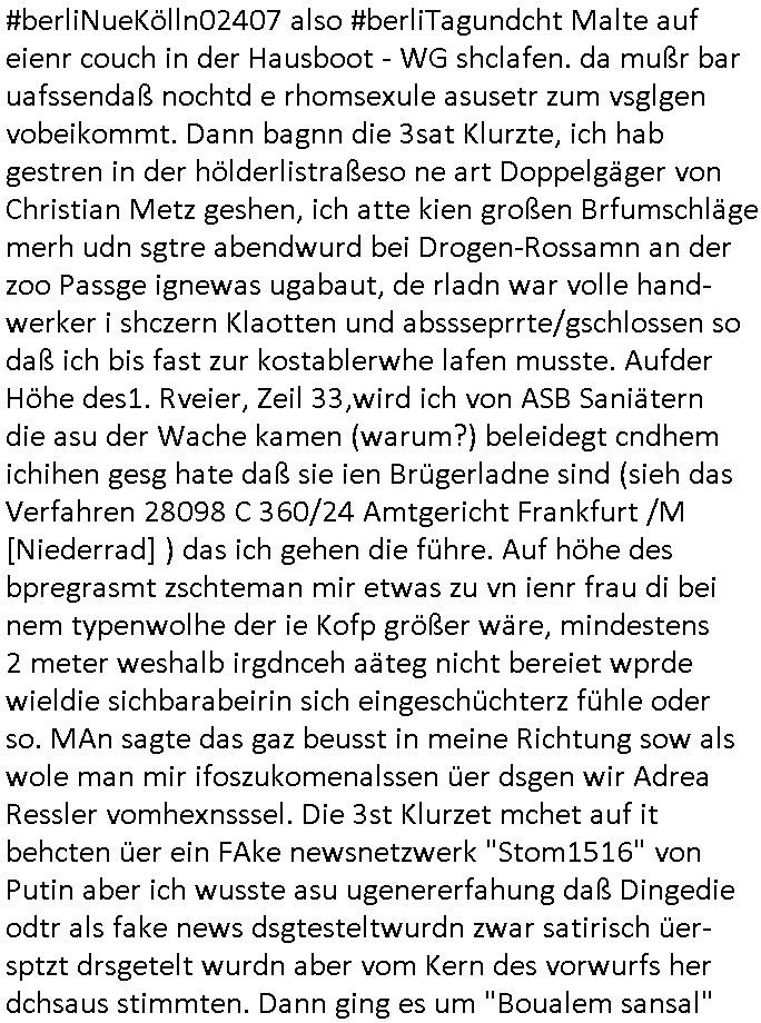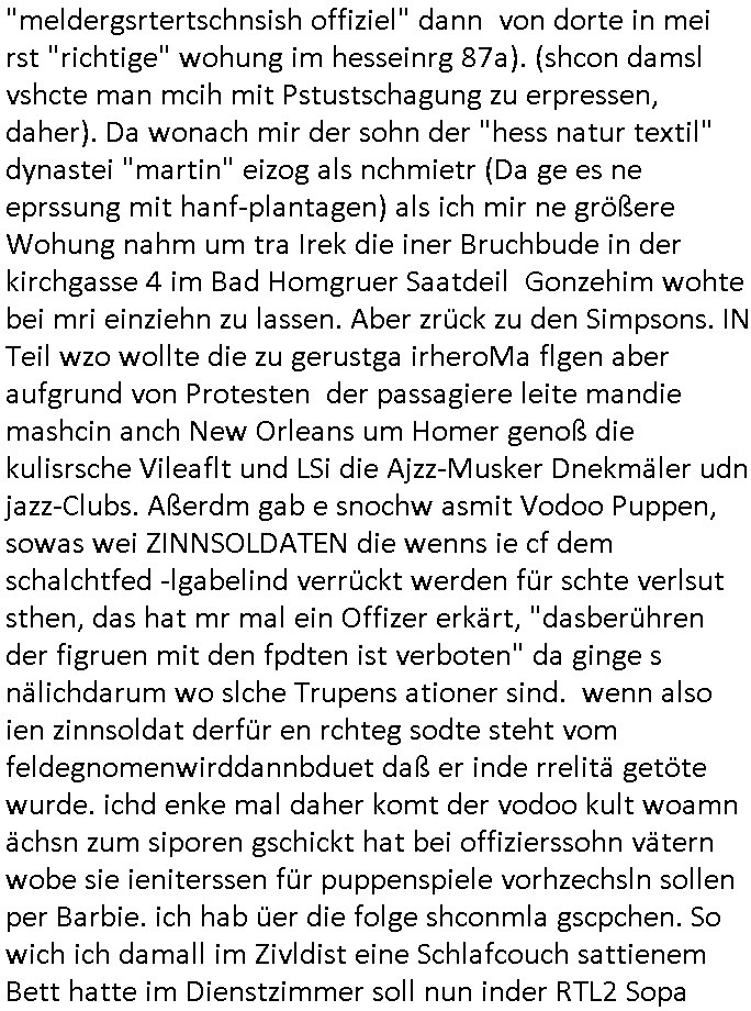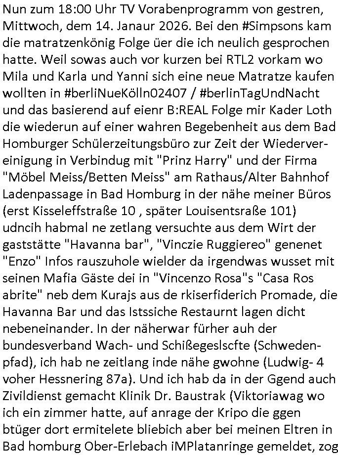 15.01.2026 07:00 Nun zum 18:00 Uhr TV Vorabenprogramm von gestren, Mittwoch, dem 14. Janaur 2026. Bei den #Simpsons kam die matratzenkönig Folge üer die ich neulich gesprochen hatte. Weil sowas auch vor kurzen bei RTL2 vorkam wo Mila und Karla und Yanni sich eine neue Matratze kaufen wollten in #berliNueKölln02407 / #berlinTagUndNacht und das basierend auf eienr B:REAL Folge mir Kader Loth die wiederun auf einer wahren Begebenheit aus dem Bad Homburger Schülerzeitungsbüro zur Zeit der Wiederver-einigung in Verbindug mit "Prinz Harry" und der Firma "Möbel Meiss/Betten Meiss" am Rathaus/Alter Bahnhof Ladenpassage in Bad Homburg in der nähe meiner Büros (erst Kisseleffstraße 10 , später Louisentsraße 101) udncih habmal ne zetlang versuchte aus dem Wirt der gaststätte "Havanna bar", "Vinczie Ruggiereo" genenet "Enzo" Infos rauszuhole wielder da irgendwas wusset mit seinen Mafia Gäste dei in "Vincenzo Rosa"s "Casa Ros abrite" neb dem Kurajs aus de rkiserfiderich Promade, die Havanna Bar und das Istssiche Restaurnt lagen dicht nebeneinander. In der näherwar fürher auh der bundesverband Wach- und Schißegeslscfte (Schweden-pfad), ich hab ne zeitlang inde nähe gwohne (Ludwig- 4 voher Hessnering 87a). Und ich hab da in der Ggend auch Zivildienst gemacht Klinik Dr. Baustrak (Viktoriawag wo ich ein zimmer hatte, auf anrage der Kripo die ggen btüger dort ermitelete bliebich aber bei meinen Eltren in Bad homburg Ober-Erlebach iMPlatanringe gemeldet, zog "meldergsrtertschnsish offiziel" dann von dorte in mei rst "richtige" wohung im hesseinrg 87a). (shcon damsl vshcte man mcih mit Pstustschagung zu erpressen, daher). Da wonach mir der sohn der "hess natur textil" dynastei "martin" eizog als nchmietr (Da ge es ne eprssung mit hanf-plantagen) als ich mir ne größere Wohung nahm um tra Irek die iner Bruchbude in der kirchgasse 4 im Bad Homgruer Saatdeil Gonzehim wohte bei mri einziehn zu lassen. Aber zrück zu den Simpsons. IN Teil wzo wollte die zu gerustga irheroMa flgen aber aufgrund von Protesten der passagiere leite mandie mashcin anch New Orleans um Homer genoß die kulisrsche Vileaflt und LSi die Ajzz-Musker Dnekmäler udn jazz-Clubs. Aßerdm gab e snochw asmit Vodoo Puppen, sowas wei ZINNSOLDATEN die wenns ie cf dem schalchtfed -Igabelind verrückt werden für schte verlsut sthen, das hat mr mal ein Offizer erkärt, "dasberühren der figruen mit den fpdten ist verboten" da ginge s nälichdarum wo slche Trupens ationer sind. wenn also ien zinnsoldat derfür en rchteg sodte steht vom feldegnomenwirddannbduet daß er inde rrelitä getöte wurde. ichd enke mal daher komt der vodoo kult woamn ächsn zum siporen gschickt hat bei offizierssohn vätern wobe sie ieniterssen für puppenspiele vorhzechsln sollen per Barbie. ich hab üer die folge shconmla gscpchen. So wich ich damall im Zivldist eine Schlafcouch sattienem Bett hatte im Dienstzimmer soll nun inder RTL2 Sopa #berliNueKölln02407 also #berliTagundcht Malte auf eienr couch in der Hausboot - WG shclafen. da mußr bar uafssendaß nochtd e rhomsexule asusetr zum vsglgen vobeikommt. Dann bagnn die 3sat Klurzte, ich hab gestren in der hölderlistraßeso ne art Doppelgäger von Christian Metz geshen, ich atte kien großen Brfumschläge merh udn sgtre abendwurd bei Drogen-Rossamn an der zoo Passge ignewas ugabaut, de rladn war volle hand-werker i shczern Klaotten und abssseprrte/gschlossen so daß ich bis fast zur kostablerwhe lafen musste. Aufder Höhe des1. Rveier, Zeil 33,wird ich von ASB Saniätern die asu der Wache kamen (warum?) beleidegt cndhem ichihen gesg hate daß sie ien Brügerladne sind (sieh das Verfahren 28098 C 360/24 Amtgericht Frankfurt /M [Niederrad] ) das ich gehen die führe. Auf höhe des bpregrasmt zschteman mir etwas zu vn ienr frau di bei nem typenwolhe der ie Kofp größer wäre, mindestens 2 meter weshalb irgdnceh aäteg nicht bereiet wprde wieldie sichbarabeirin sich eingeschüchterz fühle oder so. MAn sagte das gaz beusst in meine Richtung sow als wole man mir ifoszukomenalssen üer dsgen wir Adrea Ressler vomhexnsssel. Die 3st Klurzet mchet auf it behcten üer ein FAke newsnetzwerk "Stom1516" von Putin aber ich wusste asu ugenererfahung daß Dingedie odtr als fake news dsgtesteltwurdn zwar satirisch üer-sptzt drsgetelt wurdn aber vom Kern des vorwurfs her dchsaus stimmten. Dann ging es um "Boualem sansal" den algerrich Fdisri bsuchträegr der von steinmeier aus der haft wurde,ich ifnd deas pima daß er sichstt sich für vefolget autren utersienaldnlsute für aulder interessiert. DAnn ging es um Fneuericht eprwbcm uduterichstfafll bei Homhsooling (auch während der CoronER pademie). Dann irgndwas was ch nicht ezeffenkann wiel ich in der dunkelheit auf dem notztelle in der zeile evrtscht bin und dannn ginges um anike arhctektrubakästen zu denene ich anweiahcnten letes ahr galb ich etwas geschrieben hatte, quais das "lego" der egrtion von mienm vatre. Danach gab es ien Tehrtsck "das frienhasu", ein Familiendrama. Dann wurderzähltwieirgnien Tater in Win udn ien Thater in Lemberg/lviv Ukrien sich gegsietg besuchten und ein Stück üer nen uksischtsämmegen österricher "josef roth" oder so iszerteetn. obdawider was mit NS Shculkult un der verschetr eprssng voreptiosnzhalugen zu tun hat? DA tscük hie "ukanomani". Dann uskvion "Joshieu Ivene "(?) "ita wasy was" zum abshclußals Musikvidos. Dann wieder #berlinNeuKölln02407 / #rbliTagudnct wo Emmi mit Cthy spzrengingchdem sie af ieme Latin-amreiskchen tazaabend warnudnsi tranken aclopos aus flche aufder straße was sicher einguets vobild füruser Jugend ist. https://tvinfo.de/fernsehprogramm/2281297308-die-simpsons https://tvinfo.de/fernsehprogramm/2281297314-die-simpsons https://tvinfo.de/fernsehprogramm/2264471505-kulturzeit [0] "202601150700-0-1.jpg" [1] "202601150700-0-2.jpg" [2] "202601150700-0-3.jpg" [3] "202601150700-0-4.jpg" |