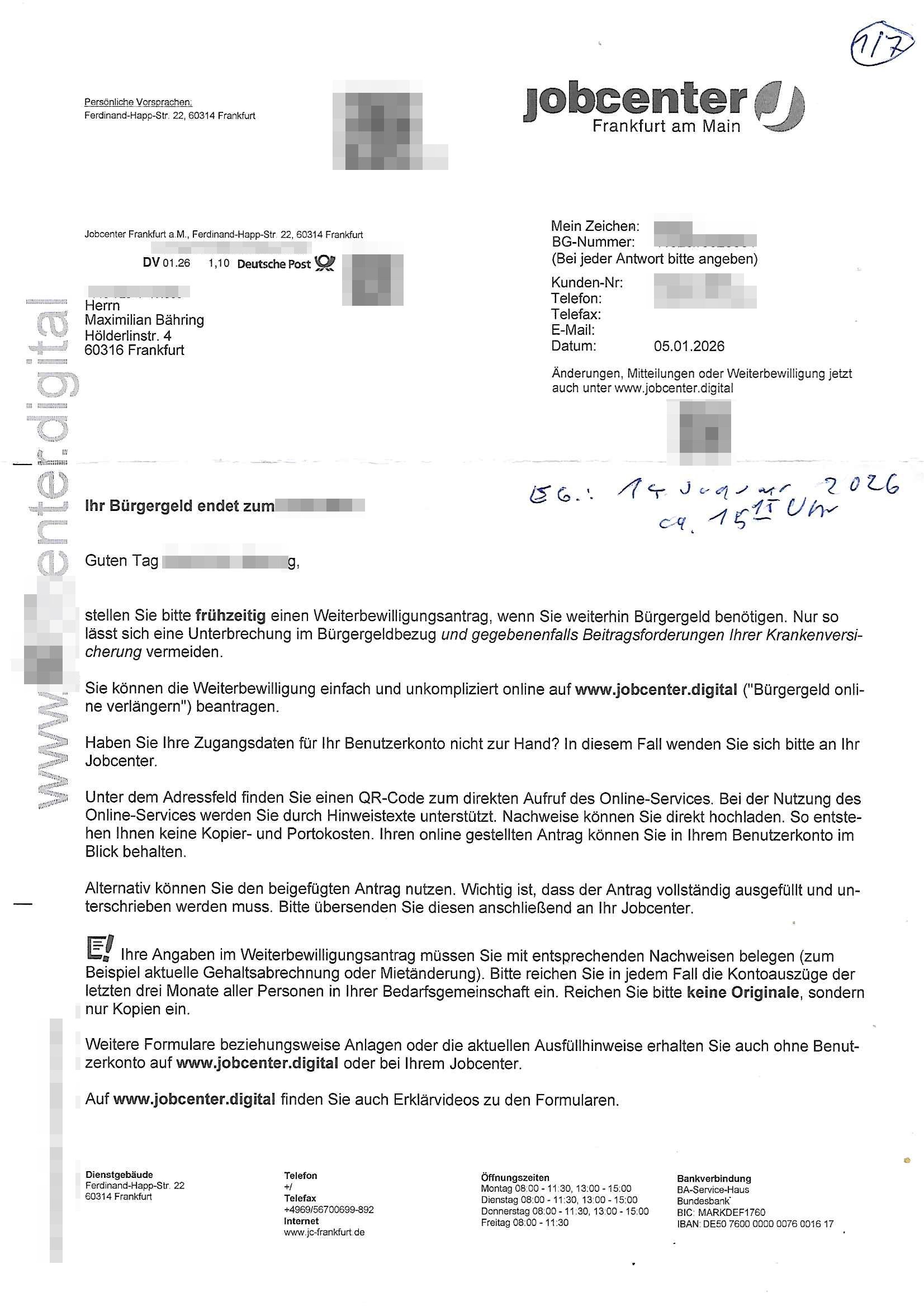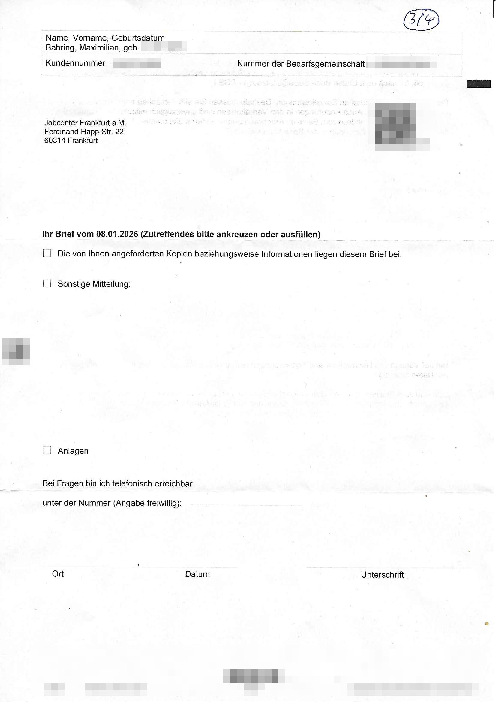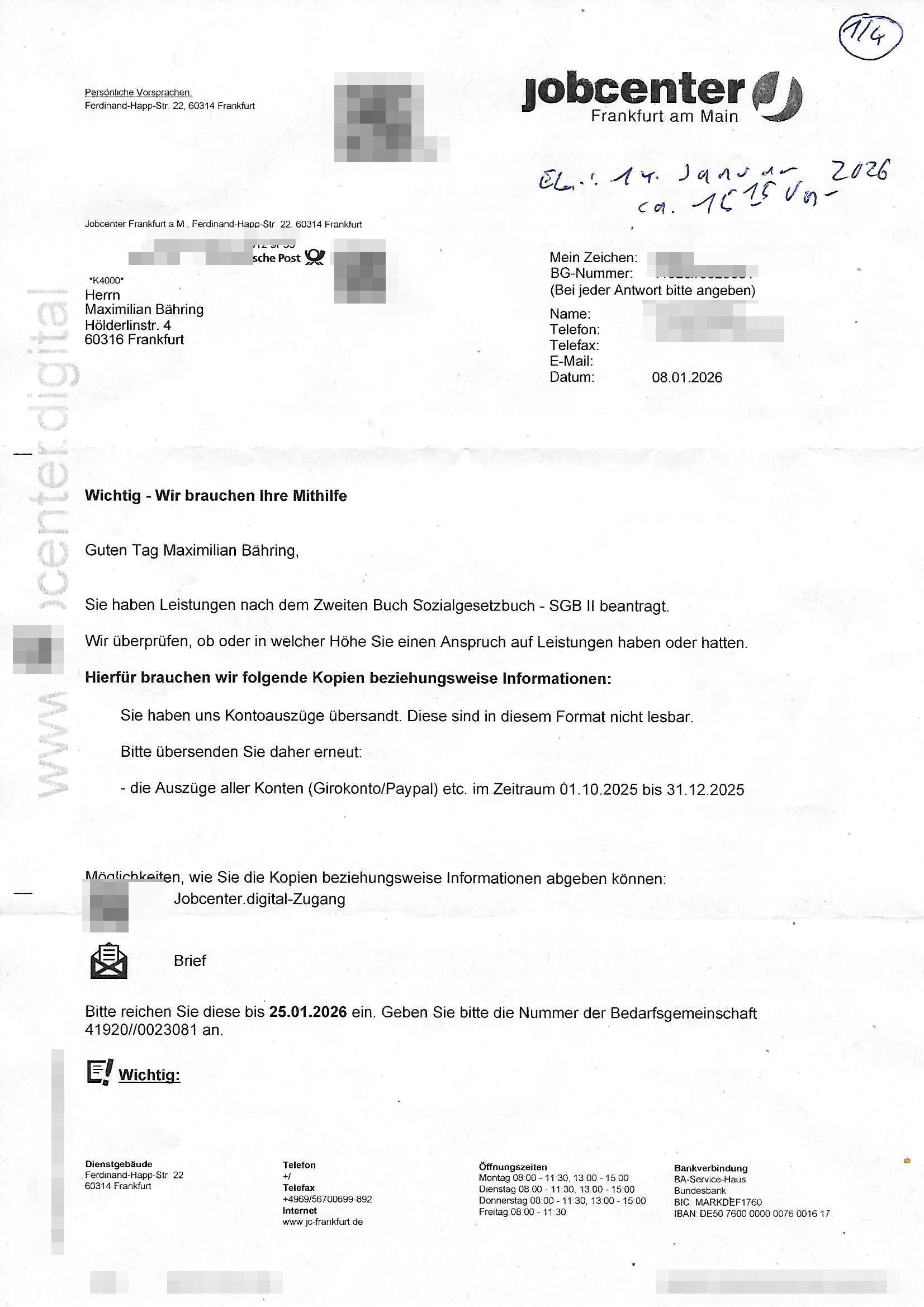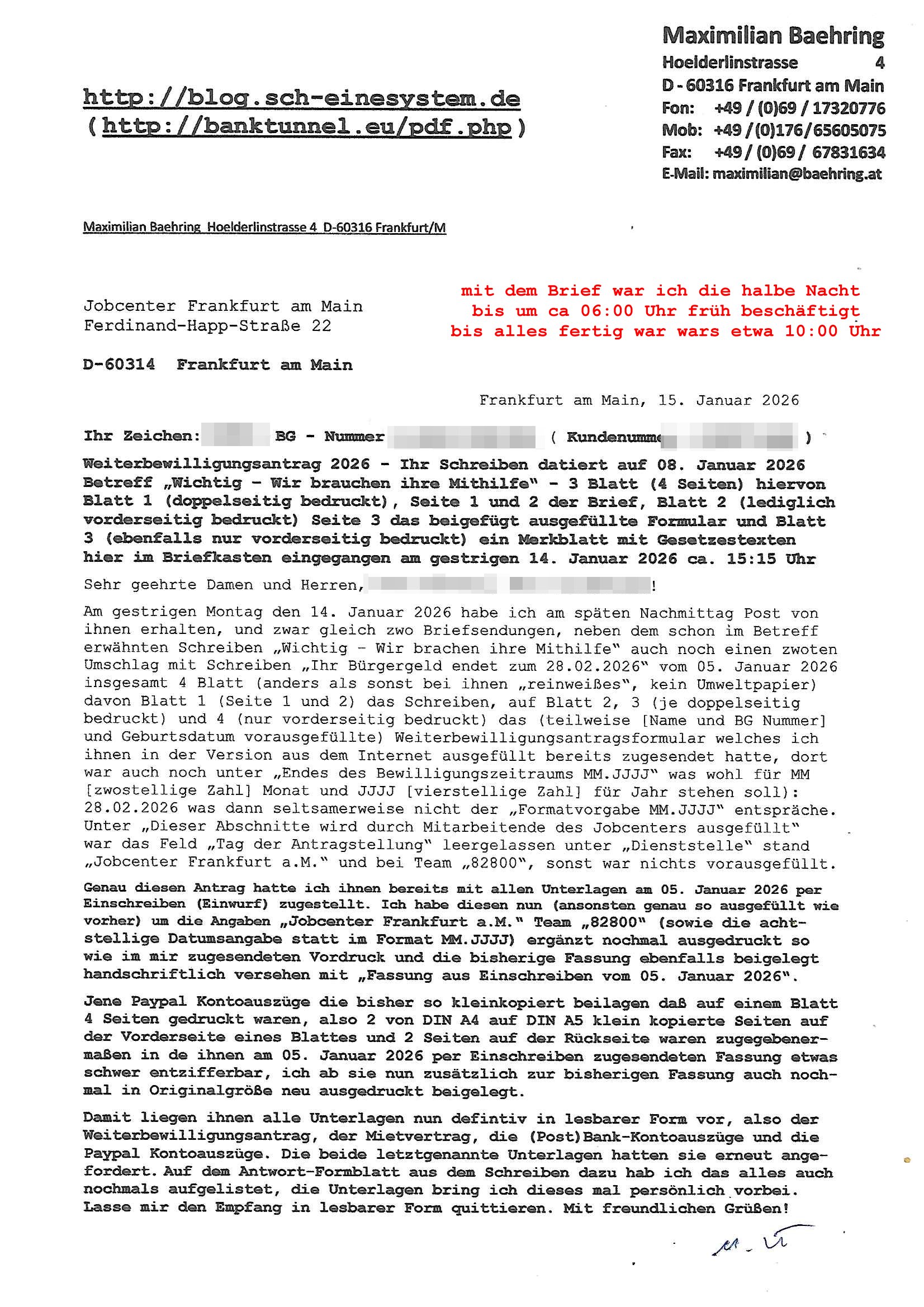 15.01.2026 13:00 mit dem Brief war ich die halbe Nacht bis um ca 06:00 Uhr früh beschäftigt bis alles fertig war wars etwa 10:00 Uhr === http://blog.sch-einesystem.de ( http://banktunnel.eu/pdf.php ) Maximilian Baehring Hoelderlinstrasse 4 D-60316 Frankfurt/M Jobcenter Frankfurt am Main Ferdinand-Happ-Straße 22 D-60314 Frankfurt am Main Frankfurt am Main, 15. Januar 2026 Ihr Zeichen: 82800 - BG - Nummer: *** ( Kundenummer: *** ) Weiterbewilligungsantrag 2026 - Ihr Schreiben datiert auf 08. Januar 2026 Betreff „Wichtig – Wir brauchen ihre Mithilfe“ - 3 Blatt (4 Seiten) hiervon Blatt 1 (doppelseitig bedruckt), Seite 1 und 2 der Brief, Blatt 2 (lediglich vorderseitig bedruckt) Seite 3 das beigefügt ausgefüllte Formular und Blatt 3 (ebenfalls nur vorderseitig bedruckt) ein Merkblatt mit Gesetzestexten hier im Briefkasten eingegangen am gestrigen 14. Januar 2026 ca. 15:15 Uhr Sehr geehrte Damen und Herren, **, ***! Am gestrigen Montag den 14. Januar 2026 habe ich am späten Nachmittag Post von ihnen erhalten, und zwar gleich zwo Briefsendungen, neben dem schon im Betreff erwähnten Schreiben „Wichtig – Wir brachen ihre Mithilfe“ auch noch einen zwoten Umschlag mit Schreiben „Ihr Bürgergeld endet zum 28.02.2026“ vom 05. Januar 2026 insgesamt 4 Blatt (anders als sonst bei ihnen „reinweißes“, kein Umweltpapier) davon Blatt 1 (Seite 1 und 2) das Schreiben, auf Blatt 2, 3 (je doppelseitig bedruckt) und 4 (nur vorderseitig bedruckt) das (teilweise [Name und BG Nummer] und Geburtsdatum vorausgefüllte) Weiterbewilligungsantragsformular welches ich ihnen in der Version aus dem Internet ausgefüllt bereits zugesendet hatte, dort war auch noch unter „Endes des Bewilligungszeitraums MM.JJJJ“ was wohl für MM [zwostellige Zahl] Monat und JJJJ [vierstellige Zahl] für Jahr stehen soll): 28.02.2026 was dann seltsamerweise nicht der „Formatvorgabe MM.JJJJ“ entspräche. Unter „Dieser Abschnitte wird durch Mitarbeitende des Jobcenters ausgefüllt“ war das Feld „Tag der Antragstellung“ leergelassen unter „Dienststelle“ stand „Jobcenter Frankfurt a.M.“ und bei Team „82800“, sonst war nichts vorausgefüllt. Genau diesen Antrag hatte ich ihnen bereits mit allen Unterlagen am 05. Januar 2026 per Einschreiben (Einwurf) zugestellt. Ich habe diesen nun (ansonsten genau so ausgefüllt wie vorher) um die Angaben „Jobcenter Frankfurt a.M.“ Team „82800“ (sowie die acht-stellige Datumsangabe statt im Format MM.JJJJ) ergänzt nochmal ausgedruckt so wie im mir zugesendeten Vordruck und die bisherige Fassung ebenfalls beigelegt handschriftlich versehen mit „Fassung aus Einschreiben vom 05. Januar 2026“. Jene *** Kontoauszüge die bisher so kleinkopiert beilagen daß auf einem Blatt 4 Seiten gedruckt waren, also 2 von DIN A4 auf DIN A5 klein kopierte Seiten auf der Vorderseite eines Blattes und 2 Seiten auf der Rückseite waren zugegebener-maßen in de ihnen am 05. Januar 2026 per Einschreiben zugesendeten Fassung etwas schwer entzifferbar, ich ab sie nun zusätzlich zur bisherigen Fassung auch noch-mal in Originalgröße neu ausgedruckt beigelegt. Damit liegen ihnen alle Unterlagen nun defintiv in lesbarer Form vor, also der Weiterbewilligungsantrag, der Mietvertrag, die (***)Bank-Kontoauszüge und die *** Kontoauszüge. Die beide letztgenannte Unterlagen hatten sie erneut ange-fordert. Auf dem Antwort-Formblatt aus dem Schreiben dazu hab ich das alles auch nochmals aufgelistet, die Unterlagen bring ich dieses mal persönlich vorbei. Lasse mir den Empfang in lesbarer Form quittieren. Mit freundlichen Grüßen! === Wie man am Eingnagsstempel erkennen kann war ich vor Ort [0] "202601151300-0-1.jpg" [1] "202601151300-0-2.jpg" |