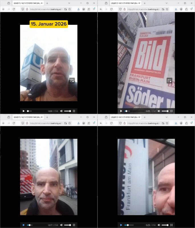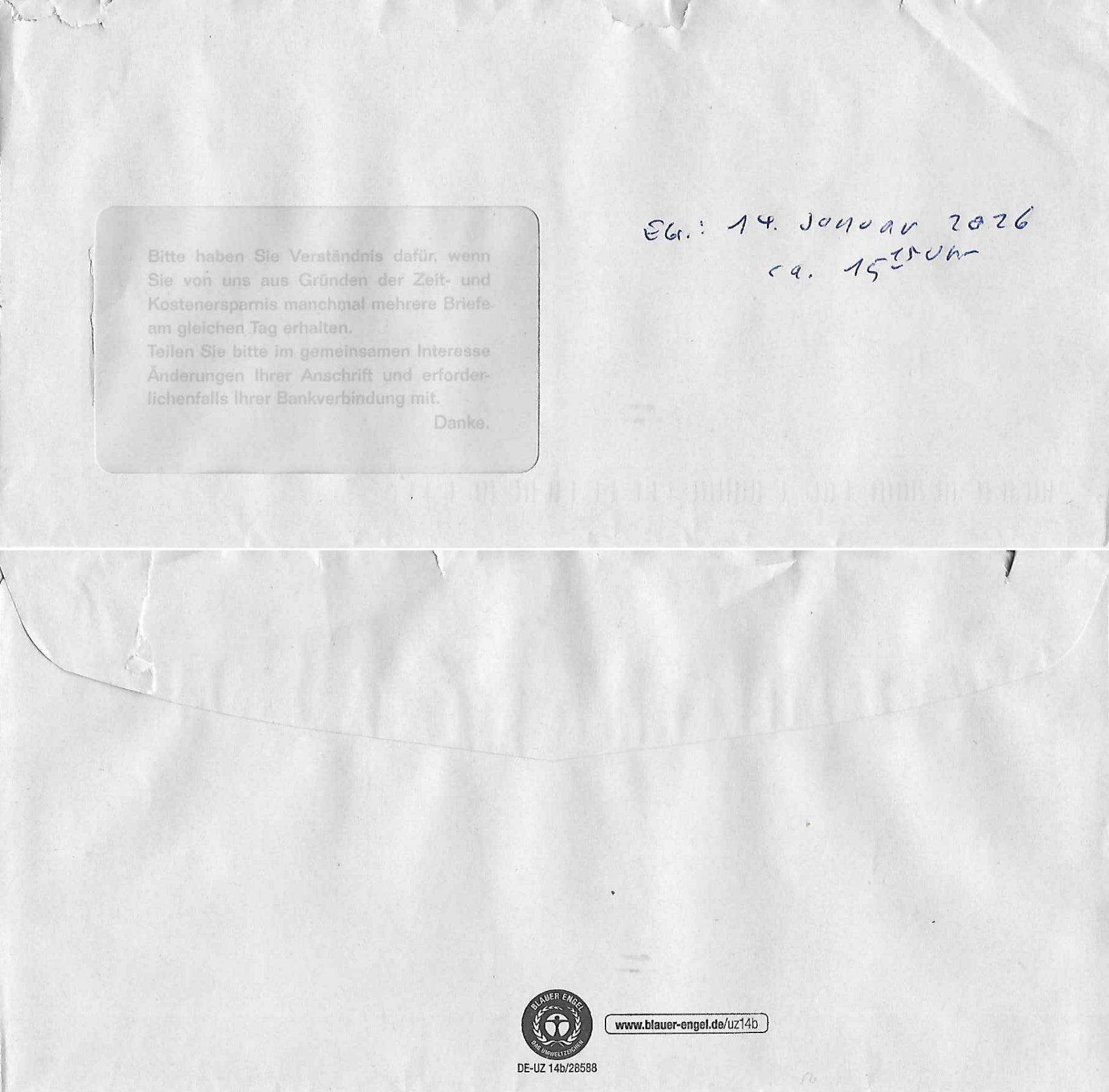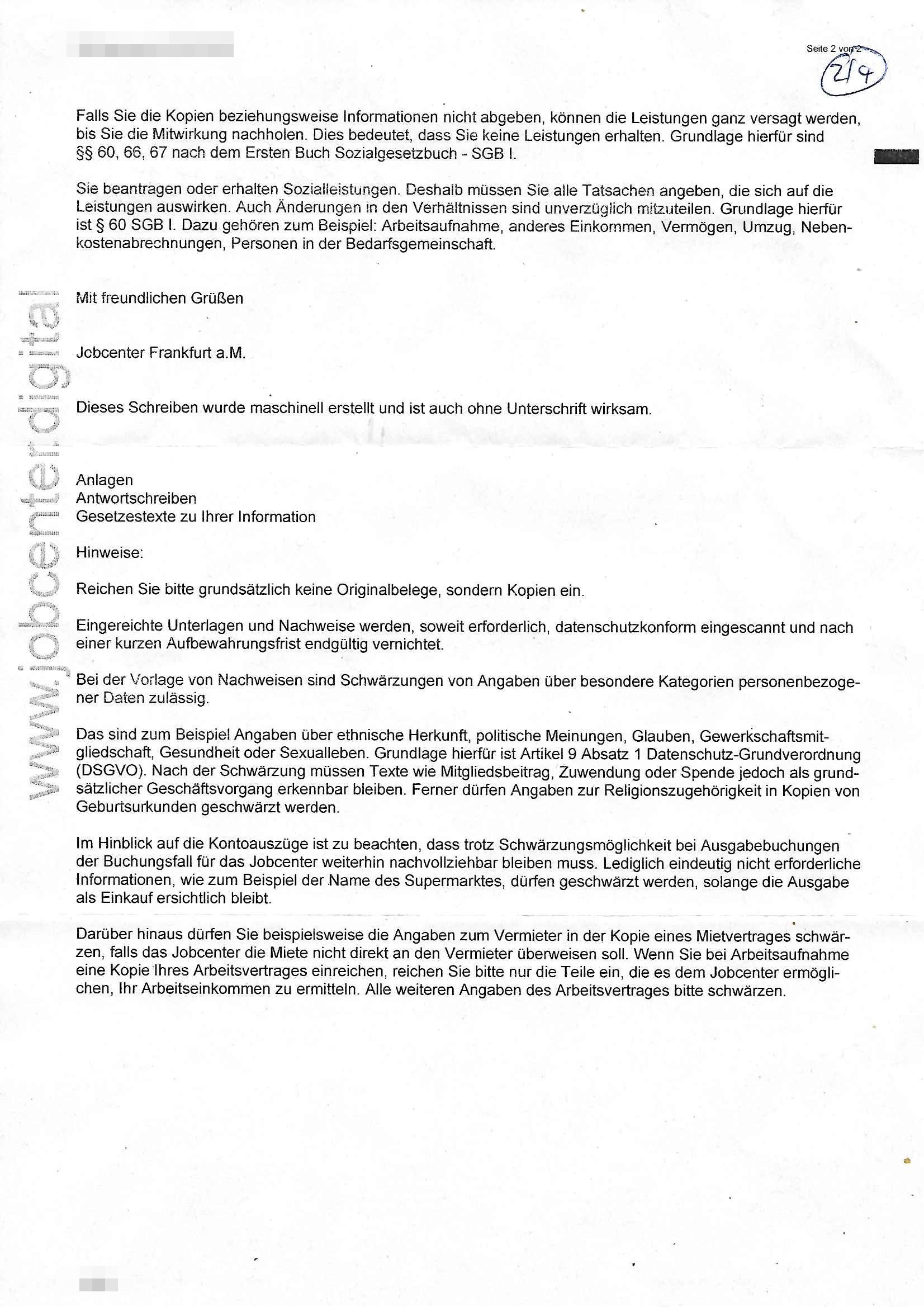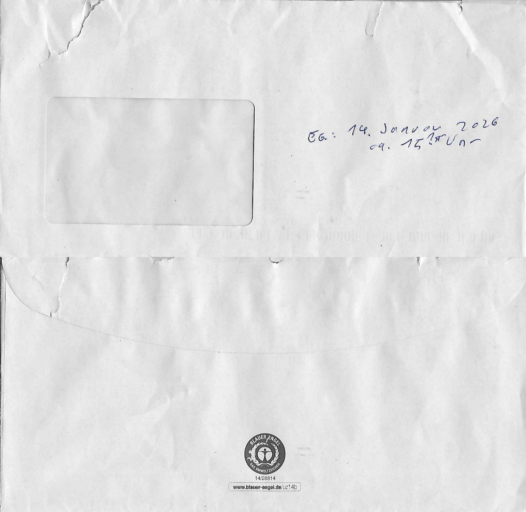 15.01.2026 13:00 mit dem Brief war ich die halbe Nacht bis um ca 06:00 Uhr früh beschäftigt bis alles fertig war wars etwa 10:00 Uhr === http://blog.sch-einesystem.de ( http://banktunnel.eu/pdf.php ) Maximilian Baehring Hoelderlinstrasse 4 D-60316 Frankfurt/M Jobcenter Frankfurt am Main Ferdinand-Happ-Straße 22 D-60314 Frankfurt am Main Frankfurt am Main, 15. Januar 2026 Ihr Zeichen: 82800 - BG - Nummer: *** ( Kundenummer: *** ) Weiterbewilligungsantrag 2026 - Ihr Schreiben datiert auf 08. Januar 2026 Betreff „Wichtig – Wir brauchen ihre Mithilfe“ - 3 Blatt (4 Seiten) hiervon Blatt 1 (doppelseitig bedruckt), Seite 1 und 2 der Brief, Blatt 2 (lediglich vorderseitig bedruckt) Seite 3 das beigefügt ausgefüllte Formular und Blatt 3 (ebenfalls nur vorderseitig bedruckt) ein Merkblatt mit Gesetzestexten hier im Briefkasten eingegangen am gestrigen 14. Januar 2026 ca. 15:15 Uhr Sehr geehrte Damen und Herren, **, ***! Am gestrigen Montag den 14. Januar 2026 habe ich am späten Nachmittag Post von ihnen erhalten, und zwar gleich zwo Briefsendungen, neben dem schon im Betreff erwähnten Schreiben „Wichtig – Wir brachen ihre Mithilfe“ auch noch einen zwoten Umschlag mit Schreiben „Ihr Bürgergeld endet zum 28.02.2026“ vom 05. Januar 2026 insgesamt 4 Blatt (anders als sonst bei ihnen „reinweißes“, kein Umweltpapier) davon Blatt 1 (Seite 1 und 2) das Schreiben, auf Blatt 2, 3 (je doppelseitig bedruckt) und 4 (nur vorderseitig bedruckt) das (teilweise [Name und BG Nummer] und Geburtsdatum vorausgefüllte) Weiterbewilligungsantragsformular welches ich ihnen in der Version aus dem Internet ausgefüllt bereits zugesendet hatte, dort war auch noch unter „Endes des Bewilligungszeitraums MM.JJJJ“ was wohl für MM [zwostellige Zahl] Monat und JJJJ [vierstellige Zahl] für Jahr stehen soll): 28.02.2026 was dann seltsamerweise nicht der „Formatvorgabe MM.JJJJ“ entspräche. Unter „Dieser Abschnitte wird durch Mitarbeitende des Jobcenters ausgefüllt“ war das Feld „Tag der Antragstellung“ leergelassen unter „Dienststelle“ stand „Jobcenter Frankfurt a.M.“ und bei Team „82800“, sonst war nichts vorausgefüllt. Genau diesen Antrag hatte ich ihnen bereits mit allen Unterlagen am 05. Januar 2026 per Einschreiben (Einwurf) zugestellt. Ich habe diesen nun (ansonsten genau so ausgefüllt wie vorher) um die Angaben „Jobcenter Frankfurt a.M.“ Team „82800“ (sowie die acht-stellige Datumsangabe statt im Format MM.JJJJ) ergänzt nochmal ausgedruckt so wie im mir zugesendeten Vordruck und die bisherige Fassung ebenfalls beigelegt handschriftlich versehen mit „Fassung aus Einschreiben vom 05. Januar 2026“. Jene *** Kontoauszüge die bisher so kleinkopiert beilagen daß auf einem Blatt 4 Seiten gedruckt waren, also 2 von DIN A4 auf DIN A5 klein kopierte Seiten auf der Vorderseite eines Blattes und 2 Seiten auf der Rückseite waren zugegebener-maßen in de ihnen am 05. Januar 2026 per Einschreiben zugesendeten Fassung etwas schwer entzifferbar, ich ab sie nun zusätzlich zur bisherigen Fassung auch noch-mal in Originalgröße neu ausgedruckt beigelegt. Damit liegen ihnen alle Unterlagen nun defintiv in lesbarer Form vor, also der Weiterbewilligungsantrag, der Mietvertrag, die (***)Bank-Kontoauszüge und die *** Kontoauszüge. Die beide letztgenannte Unterlagen hatten sie erneut ange-fordert. Auf dem Antwort-Formblatt aus dem Schreiben dazu hab ich das alles auch nochmals aufgelistet, die Unterlagen bring ich dieses mal persönlich vorbei. Lasse mir den Empfang in lesbarer Form quittieren. Mit freundlichen Grüßen! === Wie man am Eingnagsstempel erkennen kann war ich vor Ort [0] "202601151300-0-1.jpg" [1] "202601151300-0-2.jpg" |