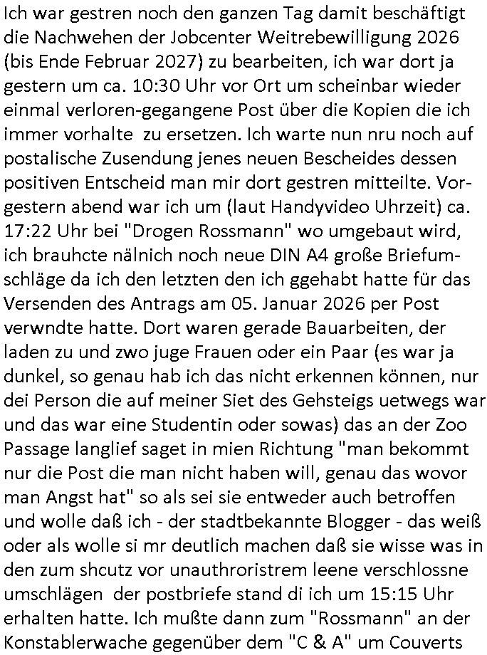 Ich war gestren noch den ganzen Tag damit beschäftigt die Nachwehen der Jobcenter Weitrebewilligung 2026 (bis Ende Februar 2027) zu bearbeiten, ich war dort ja gestern um ca. 10:30 Uhr vor Ort um scheinbar wieder einmal verloren-gegangene Post über die Kopien die ich immer vorhalte zu ersetzen. Ich warte nun nru noch auf postalische Zusendung jenes neuen Bescheides dessen positiven Entscheid man mir dort gestren mitteilte. Vor-gestern abend war ich um (laut Handyvideo Uhrzeit) ca. 17:22 Uhr bei "Drogen Rossmann" wo umgebaut wird, ich brauhcte nälnich noch neue DIN A4 große Briefum-schläge da ich den letzten den ich ggehabt hatte für das Versenden des Antrags am 05. Januar 2026 per Post verwndte hatte. Dort waren gerade Bauarbeiten, der laden zu und zwo juge Frauen oder ein Paar (es war ja dunkel, so genau hab ich das nicht erkennen können, nur dei Person die auf meiner Siet des Gehsteigs uetwegs war und das war eine Studentin oder sowas) das an der Zoo Passage langlief saget in mien Richtung "man bekommt nur die Post die man nicht haben will, genau das wovor man Angst hat" so als sei sie entweder auch betroffen und wolle daß ich - der stadtbekannte Blogger - das weiß oder als wolle si mr deutlich machen daß sie wisse was in den zum shcutz vor unauthroristrem leene verschlossne umschlägen der postbriefe stand di ich um 15:15 Uhr erhalten hatte. Ich mußte dann zum "Rossmann" an der Konstablerwache gegenüber dem "C & A" um Couverts