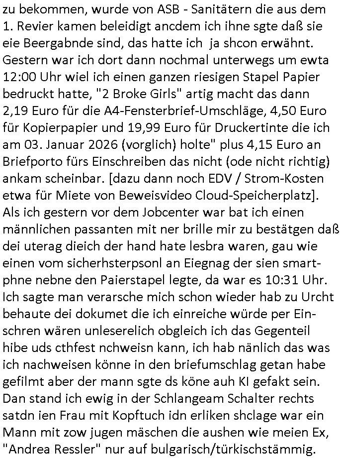 zu bekommen, wurde von ASB - Sanitätern die aus dem 1. Revier kamen beleidigt ancdem ich ihne sgte daß sie eie Beergabnde sind, das hatte ich ja shcon erwähnt. Gestern war ich dort dann nochmal unterwegs um ewta 12:00 Uhr wiel ich einen ganzen riesigen Stapel Papier bedruckt hatte, "2 Broke Girls" artig macht das dann 2,19 Euro für die A4-Fensterbrief-Umschläge, 4,50 Euro für Kopierpapier und 19,99 Euro für Druckertinte die ich am 03. Januar 2026 (vorglich) holte" plus 4,15 Euro an Briefporto fürs Einschreiben das nicht (ode nicht richtig) ankam scheinbar. [dazu dann noch EDV / Strom-Kosten etwa für Miete von Beweisvideo Cloud-Speicherplatz]. Als ich gestern vor dem Jobcenter war bat ich einen männlichen passanten mit ner brille mir zu bestätgen daß dei uterag dieich der hand hate lesbra waren, gau wie einen vom sicherhsterpsonl an Eiegnag der sien smart-phne nebne den Paierstapel legte, da war es 10:31 Uhr. Ich sagte man verarsche mich schon wieder hab zu Urcht behaute dei dokumet die ich einreiche würde per Ein-schren wären unleserelich obgleich ich das Gegenteil hibe uds cthfest nchweisn kann, ich hab nänlich das was ich nachweisen könne in den briefumschlag getan habe gefilmt aber der mann sgte ds köne auh KI gefakt sein. Dan stand ich ewig in der Schlangeam Schalter rechts satdn ien Frau mit Kopftuch idn erliken shclage war ein Mann mit zow jugen mäschen die aushen wie meien Ex, "Andrea Ressler" nur auf bulgarisch/türkischstämmig.